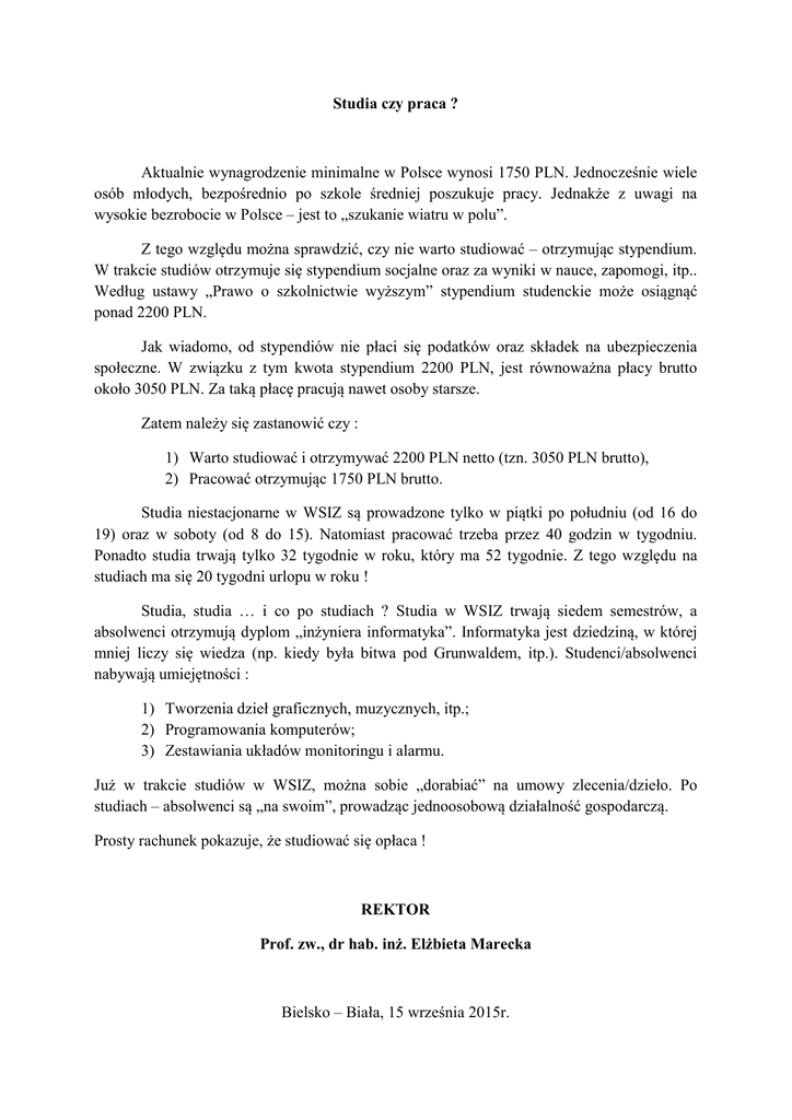 Studia czy praca ? Aktualnie wynagrodzenie minimalne w Polsce wynosi 1750 PLN. Jednocześnie wiele osób młodych, bezpośrednio po szkole średniej poszukuje pracy. Jednakże z uwagi na wysokie bezrobocie w Polsce – jest to „szukanie wiatru w polu”. Z tego względu można sprawdzić, czy nie warto studiować – otrzymując stypendium. W trakcie studiów otrzymuje się stypendium socjalne oraz za wyniki w nauce, zapomogi, itp.. Według ustawy „Prawo o szkolnictwie wyższym” stypendium studenckie może osiągnąć ponad 2200 PLN. Jak wiadomo, od stypendiów nie płaci się podatków oraz składek na ubezpieczenia społeczne. W związku z tym kwota stypendium 2200 PLN, jest równoważna płacy brutto około 3050 PLN. Za taką płacę pracują nawet osoby starsze. Zatem należy się zastanowić czy : 1) Warto studiować i otrzymywać 2200 PLN netto (tzn. 3050 PLN brutto), 2) Pracować otrzymując 1750 PLN brutto. Studia niestacjonarne w WSIZ są prowadzone tylko w piątki po południu (od 16 do 19) oraz w soboty (od 8 do 15). Natomiast pracować trzeba przez 40 godzin w tygodniu. Ponadto studia trwają tylko 32 tygodnie w roku, który ma 52 tygodnie. Z tego względu na studiach ma się 20 tygodni urlopu w roku ! Studia, studia … i co po studiach ? Studia w WSIZ trwają siedem semestrów, a absolwenci otrzymują dyplom „inżyniera informatyka”. Informatyka jest dziedziną, w której mniej liczy się wiedza (np. kiedy była bitwa pod Grunwaldem, itp.). Studenci/absolwenci nabywają umiejętności : 1) Tworzenia dzieł graficznych, muzycznych, itp.; 2) Programowania komputerów; 3) Zestawiania układów monitoringu i alarmu. Już w trakcie studiów w WSIZ, można sobie „dorabiać” na umowy zlecenia/dzieło. Po studiach – absolwenci są „na swoim”, prowadząc jednoosobową działalność gospodarczą. Prosty rachunek pokazuje, że studiować się opłaca ! REKTOR Prof. zw., dr hab. inż. Elżbieta Marecka Bielsko – Biała, 15 września 2015r.