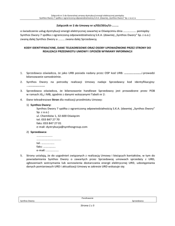 Załącznik nr 2 do Generalnej umowy dystrybucji energii elektrycznej pomiędzy Synthos Dwory 7 spółka z ograniczoną odpowiedzialnością S.K.A. (dawniej „Synthos Dwory” Sp. z o.o.) a Załącznik nr 2 do Umowy nr x/ED/201x/U-……… o świadczenie usług dystrybucji energii elektrycznej zawartej w Oświęcimiu dnia ……………… pomiędzy Synthos Dwory 7 spółka z ograniczoną odpowiedzialnością S.K.A. (dawniej „Synthos Dwory” Sp. z o.o.) zwaną dalej Synthos Dwory a ……… zwana dalej Sprzedawcą KODY IDENTYFIKACYJNE, DANE TELEADRESOWE ORAZ OSOBY UPOWAŻNIONE PRZEZ STRONY DO REALIZACJI PRZEDMIOTU UMOWY I SPOSÓB WYMIANY INFORMACJI 1. Sprzedawca oświadcza, że jako URB posiada nadany przez OSP kod URB: …………………..i prowadzi bilansowanie samodzielnie. 2. Synthos Dwory na potrzeby realizacji Umowy nadaje Sprzedawcy kod identyfikacyjny: ……………………. 3. Sprzedawca oświadcza, że bilansowanie handlowe Sprzedawcy jest prowadzone przez POB w ramach JGO i MB, zgodnie z danymi wskazanymi Tabeli nr 2: 4. Dane teleadresowe Stron dla realizacji przedmiotu Umowy: 1) Synthos Dwory: Synthos Dwory 7 spółka z ograniczoną odpowiedzialnością S.K.A. (dawniej „Synthos Dwory” Sp. z o.o.) ul. Chemików 1, 32-600 Oświęcim tel. 033 847 27 70 faks: 033 847 27 01 e-mail: [email protected] 2) Sprzedawca: …………………. ……………………………. tel. ……………… faks: …………….. e-mail: ................ 5. Strony ustalają, że do uzgodnień związanych z realizacją Umowy i bieżących kontaktów, w tym do powiadamiania Synthos Dwory o zawartych przez Sprzedawcę umowach sprzedaży z URD, zgłoszeniach wstrzymania lub wznowienia dostarczania energii elektrycznej URD, udostępniania danych pomiarowych URD i aktualizacji Umowy w zakresie URD wskazuje się: Parafowanie Synthos Dwory: Sprzedawca: Strona 1 z 5 Załącznik nr 2 do Generalnej umowy dystrybucji energii elektrycznej pomiędzy Synthos Dwory 7 spółka z ograniczoną odpowiedzialnością S.K.A. (dawniej „Synthos Dwory” Sp. z o.o.) a 1) ze strony Synthos Dwory do bieżących uzgodnień związanych z realizacją Umowy, realizacji zgłoszeń umów sprzedaży i aktualizacji Umowy w zakresie URD, wstrzymywania dostarczania energii elektrycznej do URD i udostępniania danych pomiarowych URD upoważnieni są: Ryszard Pikul Mariusz Sanak Sławomir Szymeczko tel.: 033 847 35 70 faks: 033 847 27 01 e-mail: [email protected] tel.: 033 847 23 78 faks: 033 847 27 01 e-mail: [email protected] tel.: 033 847 32 09 faks: 033 847 27 01 e-mail: [email protected] 2) ze strony Sprzedawcy do bieżących uzgodnień związanych z realizacją Umowy, realizacji zgłoszeń umów sprzedaży i aktualizacji Umowy w zakresie URD, wstrzymywania dostarczania energii elektrycznej do URD i udostępniania danych pomiarowych URD upoważnieni są: Lp. Imię i nazwisko Zakres upoważnienia Dane Teleadresowe Tel.: 1 Fax: E-mail: Tel.: 2 Fax: E-mail: Tel.: 3 Fax: E-mail: Tel.: 4 Fax: E-mail: Tel.: 5 Fax: E-mail: 6. Osoby, o których mowa w ust. 5 nie mają prawa zmieniania Umowy, ani prawa rozporządzania prawami, a także zaciągania zobowiązań w imieniu którejkolwiek ze Stron, za wyjątkiem zaciągania w imieniu Sprzedawcy zobowiązań określonych ust. 5, zgodnie z zasadami zawartymi w Umowie Parafowanie Synthos Dwory: Sprzedawca: Strona 2 z 5 Załącznik nr 2 do Generalnej umowy dystrybucji energii elektrycznej pomiędzy Synthos Dwory 7 spółka z ograniczoną odpowiedzialnością S.K.A. (dawniej „Synthos Dwory” Sp. z o.o.) a i IRiESD. Powyższe zastrzeżenie nie ma zastosowania w przypadku, gdy którakolwiek z wymienionych w ust. 5 osób będzie odrębnie upoważniona do wskazanych czynności. 7. Zmiana danych wyszczególnionych w ust. 5 nie wymaga zmiany Umowy w formie aneksu do Umowy, przy czym Strony, dla zachowania skuteczności dokonanych zmian, zobowiązują się do przekazywania aktualnych danych w formie pisemnej. 8. Sposób wymiany informacji dotyczących realizacji umów sprzedaży i udostępniania danych pomiarowo-rozliczeniowych, z uwzględnieniem że: 1) Docelowo wymiana dokumentów związanych z realizacją Umowy, a w szczególności zgłaszanie zawartych przez Sprzedawcę umów oraz udostępniania danych pomiarowo-rozliczeniowych odbywać się będzie za pomocą systemu wymiany informacji Synthos Dwory, na zasadach określonych w IRiESD i Umowie. 2) W sytuacjach awaryjnych Synthos Dwory dopuszcza inną formę zgłaszania i udostępniania danych określoną w IRiESD i Umowie. 3) Uruchomienie systemu elektronicznej wymiany informacji wymaga potwierdzenia przez Synthos Dwory i Sprzedawcę. Potwierdzeniem uruchomienia wymiany dokumentów jest „Protokół udostępnienia systemu wymiany informacji”. 4) Do czasu uruchomienia systemu wymiany informacji o którym mowa w p. 8.1) oraz 8.3), udostępnianie danych pomiarowo-rozliczeniowych dokonuje się zgodnie z zapisami Umowy na wskazany przez Synthos Dwory serwer ftp (dane udostępniane będą w określonym przez Synthos Dwory formacie). 5) Do czasu uruchomienia systemu wymiany informacji, o którym mowa w p. 8.1) oraz 8.3), informacje dotyczące realizacji Umowy z wyłączeniem p. 8.4) dokonuje się w formie pisemnej na formularzach określonych przez Synthos Dwory i udostępnianych Sprzedawcy na adresy e-mail osób wskazanych przez Sprzedawcę w niniejszym Załączniku. 6) Wymagania dla stanowiska komputerowego u Sprzedawcy: a) Wymagania sprzętowe: · Procesor odpowiadający typowi Pentium IV lub szybszy, · Min. 512 MB RAM, · dostęp do Internetu, b) Parametry konfiguracyjne: · przeglądarka internetowa z włączonym JavaScript, obsługą plików cookie i 128 bitową siłą szyfrowania (MI Explorer w wersji 6.0 lub Firefox), · przeglądarka plików pdf, · możliwość przeglądania plików Microsoft Office Excel, · możliwość obsługi poczty elektronicznej. Parafowanie Synthos Dwory: Sprzedawca: Strona 3 z 5 Załącznik nr