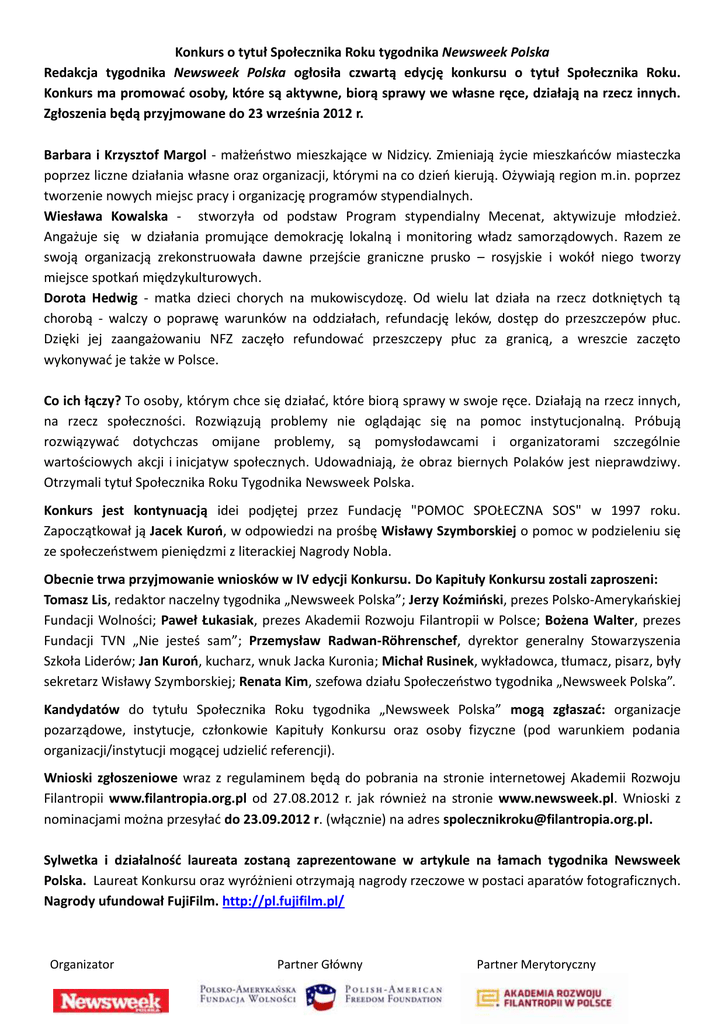 Konkurs o tytuł Społecznika Roku tygodnika Newsweek Polska Redakcja tygodnika Newsweek Polska ogłosiła czwartą edycję konkursu o tytuł Społecznika Roku. Konkurs ma promować osoby, które są aktywne, biorą sprawy we własne ręce, działają na rzecz innych. Zgłoszenia będą przyjmowane do 23 września 2012 r. Barbara i Krzysztof Margol - małżeństwo mieszkające w Nidzicy. Zmieniają życie mieszkańców miasteczka poprzez liczne działania własne oraz organizacji, którymi na co dzień kierują. Ożywiają region m.in. poprzez tworzenie nowych miejsc pracy i organizację programów stypendialnych. Wiesława Kowalska - stworzyła od podstaw Program stypendialny Mecenat, aktywizuje młodzież. Angażuje się w działania promujące demokrację lokalną i monitoring władz samorządowych. Razem ze swoją organizacją zrekonstruowała dawne przejście graniczne prusko – rosyjskie i wokół niego tworzy miejsce spotkań międzykulturowych. Dorota Hedwig - matka dzieci chorych na mukowiscydozę. Od wielu lat działa na rzecz dotkniętych tą chorobą - walczy o poprawę warunków na oddziałach, refundację leków, dostęp do przeszczepów płuc. Dzięki jej zaangażowaniu NFZ zaczęło refundować przeszczepy płuc za granicą, a wreszcie zaczęto wykonywać je także w Polsce. Co ich łączy? To osoby, którym chce się działać, które biorą sprawy w swoje ręce. Działają na rzecz innych, na rzecz społeczności. Rozwiązują problemy nie oglądając się na pomoc instytucjonalną. Próbują rozwiązywać dotychczas omijane problemy, są pomysłodawcami i organizatorami szczególnie wartościowych akcji i inicjatyw społecznych. Udowadniają, że obraz biernych Polaków jest nieprawdziwy. Otrzymali tytuł Społecznika Roku Tygodnika Newsweek Polska. Konkurs jest kontynuacją idei podjętej przez Fundację "POMOC SPOŁECZNA SOS" w 1997 roku. Zapoczątkował ją Jacek Kuroń, w odpowiedzi na prośbę Wisławy Szymborskiej o pomoc w podzieleniu się ze społeczeństwem pieniędzmi z literackiej Nagrody Nobla. Obecnie trwa przyjmowanie wniosków w IV edycji Konkursu. Do Kapituły Konkursu zostali zaproszeni: Tomasz Lis, redaktor naczelny tygodnika „Newsweek Polska”; Jerzy Koźmiński, prezes Polsko-Amerykańskiej Fundacji Wolności; Paweł Łukasiak, prezes Akademii Rozwoju Filantropii w Polsce; Bożena Walter, prezes Fundacji TVN „Nie jesteś sam”; Przemysław Radwan-Röhrenschef, dyrektor generalny Stowarzyszenia Szkoła Liderów; Jan Kuroń, kucharz, wnuk Jacka Kuronia; Michał Rusinek, wykładowca, tłumacz, pisarz, były sekretarz Wisławy Szymborskiej; Renata Kim, szefowa działu Społeczeństwo tygodnika „Newsweek Polska”. Kandydatów do tytułu Społecznika Roku tygodnika „Newsweek Polska” mogą zgłaszać: organizacje pozarządowe, instytucje, członkowie Kapituły Konkursu oraz osoby fizyczne (pod warunkiem podania organizacji/instytucji mogącej udzielić referencji). Wnioski zgłoszeniowe wraz z regulaminem będą do pobrania na stronie internetowej Akademii Rozwoju Filantropii www.filantropia.org.pl od 27.08.2012 r. jak również na stronie www.newsweek.pl. Wnioski z nominacjami można przesyłać do 23.09.2012 r. (włącznie) na adres [email protected]. Sylwetka i działalność laureata zostaną zaprezentowane w artykule na łamach tygodnika Newsweek Polska. Laureat Konkursu oraz wyróżnieni otrzymają nagrody rzeczowe w postaci aparatów fotograficznych. Nagrody ufundował FujiFilm. http://pl.fujifilm.pl/ Organizator Partner Główny Partner Merytoryczny