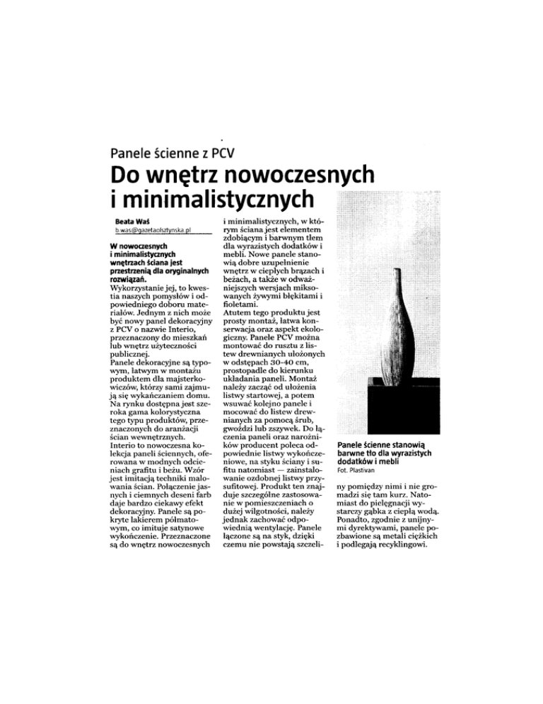 Panele ścienne z PCV Do wnętrz nowoczesnych i minimalistycznych || Beata Waś [email protected] W nowoczesnych i minimalistycznych wnętrzach ściana jest przestrzenią dla oryginalnych rozwiązań. Wykorzystanie jej, to kwes tia naszych pomysłów i od powiedniego doboru mate riałów. Jednym z nich może być nowy panel dekoracyjny z PCV o nazwie Interio, przeznaczony do mieszkań lub wnętrz użyteczności publicznej. Panele dekoracyjne są typo wym, łatwym w montażu produktem dla majsterko wiczów, którzy sami zajmu ją się wykańczaniem domu. Na rynku dostępna jest sze roka gama kolorystyczna tego typu produktów, prze znaczonych do aranżacji ścian wewnętrznych. Interio to nowoczesna ko lekcja paneli ściennych, ofe rowana w modnych odcie niach grafitu i beżu. Wzór jest imitacją techniki malo wania ścian. Połączenie jas nych i ciemnych deseni farb daje bardzo ciekawy efekt dekoracyjny. Panele są po kryte lakierem półmatowym, co imituje satynowe wykończenie. Przeznaczone są do wnętrz nowoczesnych i minimalistycznych, w któ rym ściana jest elementem zdobiącym i barwnym tłem dla wyrazistych dodatków i mebli. Nowe panele stano wią dobre uzupełnienie wnętrz w ciepłych brązach i beżach, a także w odważniejszych wersjach mikso wanych żywymi błękitami i fioletami. Atutem tego produktu jest prosty montaż, łatwa kon serwacja oraz aspekt ekolo giczny. Panele PCV można montować do rusztu z lis tew drewnianych ułożonych w odstępach 30-40 cm, prostopadle do kierunku układania paneli. Montaż należy zacząć od ułożenia listwy startowej, a potem wsuwać kolejno panele i mocować do listew drew nianych za pomocą śrub, gwoździ lub zszywek. Do łą czenia paneli oraz narożni ków producent poleca od powiednie listwy wykończe niowe, na styku ściany i su fitu natomiast — zainstalo wanie ozdobnej listwy przysufitowej. Produkt ten znaj duje szczególne zastosowa nie w pomieszczeniach o dużej wilgotności, należy jednak zachować odpo wiednią wentylację. Panele łączone są na styk, dzięki czemu nie powstają szczeli- Panele ścienne stanowią barwne tło dla wyrazistych dodatków i mebli Fot. Plastivan ny pomiędzy nimi i nie gro madzi się tam kurz. Nato miast do pielęgnacji wy starczy gąbka z ciepłą wodą. Ponadto, zgodnie z unijny mi dyrektywami, panele po zbawione są metali ciężkich i podlegają recyklingowi.
