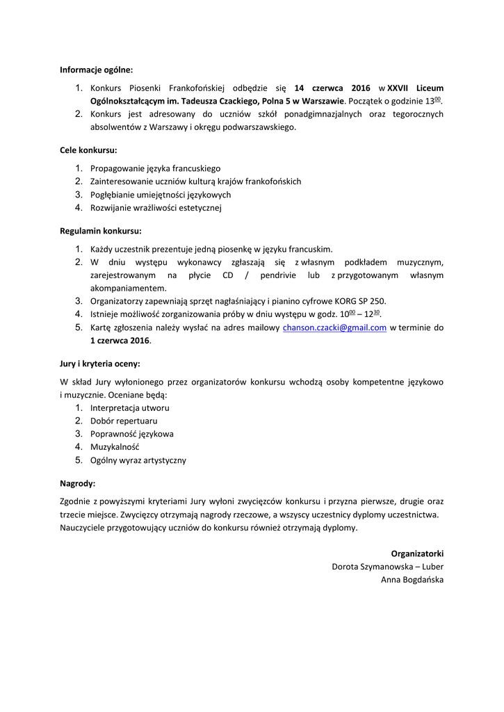 Informacje ogólne: 1. Konkurs Piosenki Frankofońskiej odbędzie się 14 czerwca 2016 w XXVII Liceum Ogólnokształcącym im. Tadeusza Czackiego, Polna 5 w Warszawie. Początek o godzinie 1300. 2. Konkurs jest adresowany do uczniów szkół ponadgimnazjalnych oraz tegorocznych absolwentów z Warszawy i okręgu podwarszawskiego. Cele konkursu: 1. 2. 3. 4. Propagowanie języka francuskiego Zainteresowanie uczniów kulturą krajów frankofońskich Pogłębianie umiejętności językowych Rozwijanie wrażliwości estetycznej Regulamin konkursu: 1. Każdy uczestnik prezentuje jedną piosenkę w języku francuskim. 2. W dniu występu wykonawcy zgłaszają się z własnym podkładem muzycznym, zarejestrowanym na płycie CD / pendrivie lub z przygotowanym własnym akompaniamentem. 3. Organizatorzy zapewniają sprzęt nagłaśniający i pianino cyfrowe KORG SP 250. 4. Istnieje możliwość zorganizowania próby w dniu występu w godz. 1000 – 1230. 5. Kartę zgłoszenia należy wysłać na adres mailowy [email protected] w terminie do 1 czerwca 2016. Jury i kryteria oceny: W skład Jury wyłonionego przez organizatorów konkursu wchodzą osoby kompetentne językowo i muzycznie. Oceniane będą: 1. Interpretacja utworu 2. Dobór repertuaru 3. Poprawność językowa 4. Muzykalność 5. Ogólny wyraz artystyczny Nagrody: Zgodnie z powyższymi kryteriami Jury wyłoni zwycięzców konkursu i przyzna pierwsze, drugie oraz trzecie miejsce. Zwycięzcy otrzymają nagrody rzeczowe, a wszyscy uczestnicy dyplomy uczestnictwa. Nauczyciele przygotowujący uczniów do konkursu również otrzymają dyplomy. Organizatorki Dorota Szymanowska – Luber Anna Bogdańska