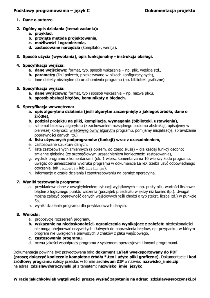 Podstawy programowania – język C Dokumentacja projektu 1. Dane o autorze. 2. Ogólny opis działania (temat zadania): a. przykład, b. przyjęta metoda projektowania, c. możliwości i ograniczenia, d. zastosowane narzędzia (kompilator, wersja). 3. Sposób użycia (wywołania), opis funkcjonalny - instrukcja obsługi. 4. Specyfikacja wejścia: a. dane wejściowe: format, typ, sposób wskazania – np. plik, wejście std., b. parametry (linii poleceń, przekazywane w plikach konfiguracyjnych), c. inne obiekty niezbędne do uruchomienia programu (np. biblioteki graficzne). 5. Specyfikacja wyjścia: a. dane wyjściowe: format, typ i sposób wskazania – np. nazwa pliku, b. sposób obsługi błędów, komunikaty o błędach. 6. Specyfikacja wewnętrzna: a. opis algorytmu działania (jeśli algorytm zaczerpnięty z jakiegoś źródła, dane o źródle), b. podział projektu na pliki, kompilacja, wymagania (biblioteki, ustawienia), c. schemat blokowy algorytmu (z zachowaniem rozsądnego poziomu abstrakcji, opisujemy w pierwszej kolejności właściwy/główny algorytm programu, pomijamy inicjalizację, sprawdzanie poprawności danych itp.), d. lista używanych podprogramów (funkcji) wraz z uzasadnieniem, e. zastosowane struktury danych, f. lista zastosowanych zmiennych (z opisem, do czego służą) – dla każdej funkcji osobno; zmienne globalne (ze szczegółowym uzasadnieniem konieczności zastosowania), g. wydruk programu z komentarzami (ok. 1 wiersz komentarza na 10 wierszy kodu programu, uwaga: do umieszczenia wydruku programu w dokumencie LaTeX trzeba użyć odpowiedniego otoczenia, jak verbatim lub listings), h. informacje o czasie działania i zapotrzebowaniu na pamięć operacyjną. 7. Wyniki testowania programu: a. przykładowe dane z uwzględnieniem sytuacji wyjątkowych – np. pusty plik, wartości liczbowe błędne z logicznego punktu widzenia (początek przedziału większy niż koniec itp.). Uwaga! można założyć poprawność danych wejściowych jeśli chodzi o typ (tekst, liczba itd.) w punkcie 5a, b. wyniki działania programu dla przykładowych danych. 8. Wnioski: a. propozycje rozszerzeń programu, b. wskazanie na niedoskonałości, ograniczenia wynikające z założeń: niedoskonałości nie mogą obejmować oczywistych i łatwych do naprawienia błędów, np. przypadku, w którym program nie uwzględnia pierwszych 3 znaków z pliku wejściowego, c. zastosowania programu, d. ocena jakości współpracy programu z systemem operacyjnym i innymi programami. Dokumentacja powinna być przygotowana jako dokument LaTeX wyeksportowany do PDF (proszę dołączyć koniecznie kompletne źródła *.tex i użyte pliki graficzne). Dokumentację i kod źródłowy programu należy przesłać w formie archiwum ZIP o nazwie: nazwisko_imie.zip na adres: [email protected] z tematem: nazwisko_imie_jezykc W razie jakichkolwiek wątpliwości proszę wysłać zapytanie na adres: [email protected]