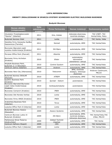 LISTA REFERENCYJNA OBIEKTY ZREALIZOWANE W OPARCIU SYSTEMY SCHNEIDER ELECTRIC BUILDINGS BUSINESS Budynki Biurowe Data zako czenia projektu Firma Partnerska Nazwa instalacji Zastosowany system Inkubator Przedsi biorczo ci "Starter" [Gda sk] 2011 Griz, Intelar telewizja dozorowa, kontrola dost pu TAC I/NET, TAC Xenta/Vista, Pelco Budynek biurowy Intel 2011 Lonta automatyka TAC Xenta, Vista Siedziba firmy Karpacka Spó ka Gazownicza [Tarnów] 2011 Noma2 automatyka, BMS TAC Xenta/Vista Biurowiec Biprostal cz wysoka-modernizacja [Kraków] 2011 DG Elpro automatyka, BMS TAC Xenta/Vista Murawa Office Park [Pozna ] 2011 Abantia automatyka, BMS TAC Xenta/Vista Biurowiec firmy Archeton [Kraków] 2010 Elster 2010 Control System automatyka, BMS TAC Xenta/Vista 2010 Andrem TAC Xenta/Vista 2010 Telecomm automatyka, BMS BMS, kontrola dost pu, telewizja dozorowa 2010 ATREM automatyka, BMS TAC Xenta/Vista 2010 Qumak - Sekom automatyka TAC Xenta/Vista 2010 Carboautomatyka automatyka TAC Xenta/Vista Biurowiec Comarch [Kraków] 2010 PREK automatyka, BMS TAC Xenta/Vista Biurowiec Det Norske Veritas 2010 Lonta automatyka, BMS TAC Xenta/Vista Biurowiec firmy ARGE [Kraków] 2010 PREK automatyka, BMS TAC Xenta/Vista Arako ska Business Park [Gda sk] 2010 Torus automatyka, BMS TAC Xenta/Vista 2010 Lonta automatyka, BMS TAC Xenta/Vista Budynek Biurowy Asseco [Rzeszów] 2009 Asseco Systems automatyka, BMS TAC Xenta/Vista Centrum Biurowe Lubicz II Budynek [Kraków] 2009 DG Elpro automatyka, BMS, kontrola dost pu, telewizja dozorowa TAC Xenta/Vista,TAC I/Net, PELCO automatyka, BMS TAC Xenta automatyka, BMS TAC Xenta/Vista automatyka, BMS TAC Xenta/Vista Nazwa obiektu [miejscowo ] Wojdy a Business Park, budynek 2 i 3 [Wroclaw] Centrum Zahna [Gda sk] Biurowiec New City [Warszawa] Budynek biurowy SKALAR [Pozna ] Quattro Business Park [Kraków] Biurowiec Biprostal Biurowiec cz niska-modernizacja [Kraków] ycka Office Park II [Gdynia] Pa stwowa Stra Po arna [Andrychów] Centrum Hafnera [Sopot] ycka Office Park I [Gdynia] 2009 Zak ad Techniki Cieplnej CES 2009 Lonta 2009 automatyka, sterowanie wietlenia i aluzji TAC Xenta/Vista Andover Continuum, PELCO Arko ska Business Park [Gda sk] 2009 Torus automatyka, BMS TAC Xenta/Vista MILLENNIUM TOWER II budynek biurowy [Wroc aw] 2008 Mercury Engineering, PREK automatyka, BMS TAC Xenta/Vista Centrum Biznesowe Ok cie AEROPARK [Warszawa] 2008 Coral automatyka, BMS TAC Xenta/Vista Arko ska Business Park-bud nr 1 i 2 [Gda sk] 2008 Torus automatyka, BMS TAC Xenta/Vista Centrum Haffnera (Budynek Biurowo-Parkingowy) [Sopot] 2008 CES automatyka, BMS TAC Xenta/Vista Rondo Business Park [Kraków] 2008 Asseco Systems automatyka, BMS TAC Xenta/Vista 2008 Lonta automatyka, BMS TAC Xenta/Vista 2008 Proekoterm automatyka, BMS TAC Xenta/Vista 2008 Mercury Engineering Polska automatyka, BMS TAC Xenta/Vista 2007 Mercury Engineering, Control System automatyka, BMS TAC Xenta/Vista 2007 Qumak-Sekom, Digi Control TAC Xenta/Vista, TAC I/Net 2007 G4S automatyka, BMS, kontrola dost pu kontrola dost pu, telewizja dozorowa GTC 'AEROPARK' [Warszawa] 2007 Coral automatyka TAC Xenta/Vista ANDERSIA TOWER budynek wielofunkcyjny [Pozna ] 2007 Qumak-Sekom automatyka, BMS Andover Continuum Siedziba Firmy AXA Warsaw Trade Tower [Warszawa] 2007 Qumak-Sekom automatyka, BMS TAC Xenta/Vista 2005 GTI automatyka,BMS TAC Xenta/Vista 2005 Integrator automatyka,BMS TAC Xenta/Vista Centrum Systemów Komputerowych 'ZETO' [Kielce] 2005 ZETO Kielce kontrola dost pu TAC I/Net Budynek biurowy 'Zau ek Pi kna' [Warszawa] 2005 Control System automatyka, BMS TAC Xenta/Vista Budynek biurowy 'CENTRUM JASNA' [Warszawa] 2005 Invar Integracje Lonta Alarmton automatyka, BMS TAC Xenta/ Vista, TAC I/Net, PELCO 'CROWN POINT Business Center [Warszawa] 2004 Control System automatyka, BMS TAC Xenta/Vista „CROWN TOWER" Business Center [Warszawa] 2004 Control System automatyka, BMS TAC Xenta/Vista Budynek wielofunkcyjny 'Stawki 40' [Warszawa] 2004 Noma2 automatyka, BMS Andover Continuum Budynek biurowo-handlowy 'Daimler-Chrysler' [Warszawa] 2004 Tradex Eco automatyka, BMS TAC Xenta/Vista ycka Office Park, budynek 1 i2 [Gdynia] Park Przemys owy EuroCentrum [Katowice] Wi niowy Business Park [Warszawa] BEMA PLAZA Centrum biurowe [Wroc aw] GTC GLOBIS centrum biurowe [Wroc aw] Siedziba firmy ‘X-Pon Card' [Warszawa] Budynek biurowy ‘TORUS' [Gda sk] Budynek biurowy 'VECTRA' [Gdynia] Andover Continuum Dom Dochodowy Plac Trzech Krzy y [Warszawa] 2004 Interior automatyka, BMS Andover Continuum TP Internet ul. Domaniewska 41 [Warszawa] 2003 ATM kontrola dost pu Andover Continuum Budynek biurowy 'Intraco I' [Warszawa] 2003 ASU automatyka, BMS TAC Xenta/Vista Budynek Biurowy 'Millennium Plaza' [Warszawa] 2003 Decsoft kontrola dost pu, telewizja dozorowa Andover Continuum, PELCO Budynek Biurowy 'Antares' [Warszawa] 2003 Control System automatyka, BMS TAC Xenta/Vista Budynek biurowy 'PROKOM' siedziba firmy [Gdynia] 2003 Prokom Software automatyka TAC Xenta Budynek biurowy PGNiG [Warszawa] 2003 BIATEL INFO Automatyka automatyka, BMS Andover Continuum 'Business Center Bitwy Warszawskiej' [Warszawa] 2002 TAC Mercury Engineering automatyka, BMS TAC Xenta/Vista 2002 AMK automatyka Andover Continuum 2002 Elster Network Services Partner TAC El-kar automatyka TAC Xenta automatyka TAC Xenta automatyka, BMS TAC Xenta/Vista AMK S.A. - Siedziba firmy [Kraków] 'Pro-Serw' [Kraków] ATAL centrum biurowologistyczne [Wroc aw] 'Kraków Business Park' [Zabierzów] TP Internet, ul. Czackiego [Warszawa] TP Internet ul. Jana Paw a II [Warszawa] TP Internet, ul. Prosta [Warszawa] ATM S.A. - Siedziba firmy, [Warszawa] Budynek biurowy Centrali Handlu Zagranicznego 'CENTRUM' [Katowice] Centrum Biurowe 'Euromarket' [Kraków] Centrum Biurowe 'LUBICZ' [Kraków] Budynek biurowy ‘Toyota' [Warszawa] Budynek Biurowy 'Alfa Plaza' [Gdynia] Budynek biurowy 'Sienna 75 Center' [Warszawa] SEKOM S.A.- Siedziba firmy, [Warszawa] 2002 2002 2002 ATM kontrola dost pu Andover Continuum 2002 ATM kontrol
