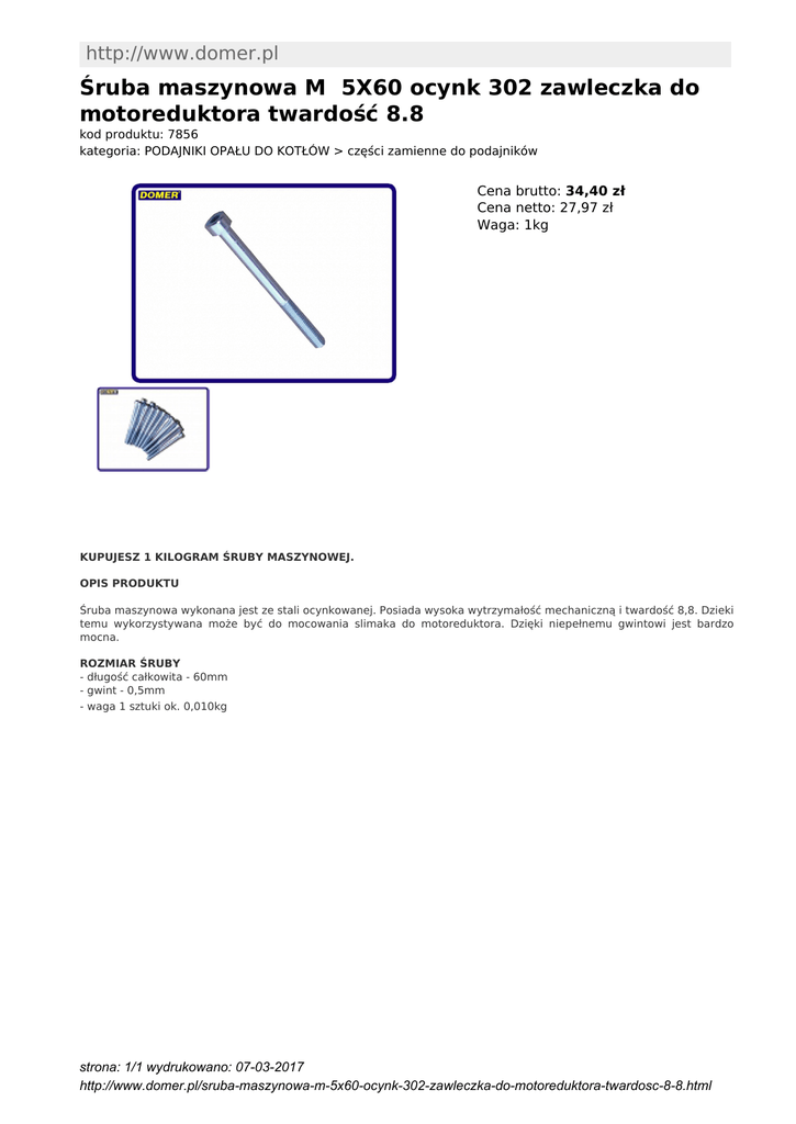 http://www.domer.pl Śruba maszynowa M 5X60 ocynk 302 zawleczka do motoreduktora twardość 8.8 kod produktu: 7856 kategoria: PODAJNIKI OPAŁU DO KOTŁÓW > części zamienne do podajników Cena brutto: 34,40 zł Cena netto: 27,97 zł Waga: 1kg KUPUJESZ 1 KILOGRAM ŚRUBY MASZYNOWEJ. OPIS PRODUKTU Śruba maszynowa wykonana jest ze stali ocynkowanej. Posiada wysoka wytrzymałość mechaniczną i twardość 8,8. Dzieki temu wykorzystywana może być do mocowania slimaka do motoreduktora. Dzięki niepełnemu gwintowi jest bardzo mocna. ROZMIAR ŚRUBY - długość całkowita - 60mm - gwint - 0,5mm - waga 1 sztuki ok. 0,010kg strona: 1/1 wydrukowano: 07-03-2017 http://www.domer.pl/sruba-maszynowa-m-5x60-ocynk-302-zawleczka-do-motoreduktora-twardosc-8-8.html