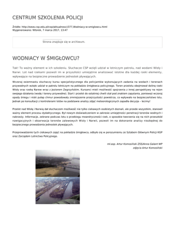 CENTRUM SZKOLENIA POLICJI Źródło: http://www.csp.edu.pl/csp/aktualnosci/377,Wodniacy-w-smiglowcu.html Wygenerowano: Wtorek, 7 marca 2017, 13:47 Strona znajduje się w archiwum. WODNIACY W ŚMIGŁOWCU? Tak! To ważny element w ich szkoleniu. Słuchacze CSP wzięli udział w lotniczym patrolu, nad wodami Wisły i Narwi. Lot nad rzekami pozwoli im w przyszłości umiejętnie analizować istotne dla każdej rzeki elementy, wpływające na bezpieczne prowadzenie jednostek pływających. Wczoraj osiemnastu słuchaczy kursu specjalistycznego dla policjantów wykonujących zadania na wodach i terenach przywodnych wzięło udział w patrolu lotniczym na pokładzie śmigłowca policyjnego. Teren przelotu obejmował dolinę rzeki Wisły oraz rzekę Narew wraz z Jeziorem Zegrzyńskim. Kursanci mieli możliwość spojrzenia z innej perspektywy na rejon swojego działania (wodę i tereny przywodne). Start i przelot do ostatniej chwili stał pod znakiem zapytania, ponieważ wczoraj opady śniegu i niski pułap chmur powodowały zmniejszenie przejrzystości powietrza, co wpływało na bezpieczeństwo lotu. Jednak po konsultacji z kontrolerami lotów na podstawie analizy zdjęć meteorologicznych zapadła decyzja – lecimy! Przelot nad Wisłą i Narwią dał słuchaczom możliwość nie tylko ciekawych osobistych doznań, ale przede wszystkim, stanowił ważny element procesu dydaktycznego. Był nowym doświadczeniem w zakresie umiejętności penetracji terenów wodnych i nabrzeży. Informacje, zebrane podczas lotu o przebiegu meandryczności rzek, o sposobie tworzenia się na nich przeszkód nawigacyjnych i obserwacja terenów zalewowych Wisły i Narwii, pozwoli im na dokonanie analizy niezbędnej do bezpiecznego prowadzenia jednostek pływających. Przeprowadzenie tych ciekawych zajęć na pokładzie śmigłowca, odbyło się w porozumieniu ze Sztabem Głównym Policji KGP oraz Zarządem Lotnictwa Policyjnego. mł.asp. Artur Komosiński ZSS/Anna Galant WP zdjęcia Artur Komosiński Ocena: 0/5 (0) Tweetnij