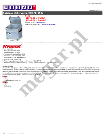 Informacje o produkcie Utworzono 07-03-2017 Patelnia elektryczna 900.PE-05Ex Cena : 11175,00 zł (netto) 13745,25 zł (brutto) .p l Dostępność : Dostępny Stan magazynowy : bardzo wysoki ar Dane techniczne: 1. Moc całkowita (kW): 12,0 2. Pojemność misy (L): 80,0 3. Powierzchnia robocza [m2]: 0,50 4. Zasilanie: 3 NPE 230/400 V 50Hz 5. Wymiary A x B x H: 900x900x900 6. Przechył misy: elektryczny 7. Płynna regulacja temperatury w zakresie od 0oC do 275oC 8. Elektroniczny regulator temperatury z funkcją kontroli rozgrzewu i sygnalizacji awarii eg Opis produktu: Nowatorskie rozwiązanie patelni elektrycznej ze sterowaniem elektronicznym pozwala na zastosowanie urządzenia w kuchniach spełniając tym samym wszelkie wymogi systemu HACCP. Panel sterowania umożliwia płynną regulację temperatury. Elektryczny przechył misy o pojemności roboczej 80 litrów zapewnia maksimum bezpieczeństwa podczas jej użytkowania. Patelnia gazowa posiada płynna regulację temperatury oraz termostat zabezpieczający przed nadmiernym wzrostem temperatury powierzchni misy. Zastosowany zawór gazowy automatycznie odcina dopływa gazu w przypadku zgaszenia płomienia palnika lub spadku ciśnienia w instalacji gazowej. m KARTA TECHNICZNA DTR Wygenerowano w programie www.oscGold.com