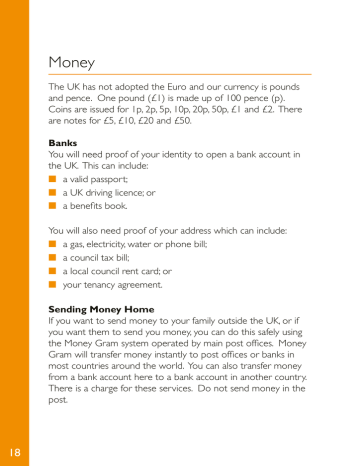Money The UK has not adopted the Euro and our currency is pounds and pence. One pound (£1) is made up of 100 pence (p). Coins are issued for 1p, 2p, 5p, 10p, 20p, 50p, £1 and £2. There are notes for £5, £10, £20 and £50. Banks You will need proof of your identity to open a bank account in the UK. This can include: n a valid passport; n a UK driving licence; or n a benefits book. You will also need proof of your address which can include: n a gas, electricity, water or phone bill; n a council tax bill; n a local council rent card; or n your tenancy agreement. Sending Money Home If you want to send money to your family outside the UK, or if you want them to send you money, you can do this safely using the Money Gram system operated by main post offices. Money Gram will transfer money instantly to post offices or banks in most countries around the world. You can also transfer money from a bank account here to a bank account in another country. There is a charge for these services. Do not send money in the post. 18 Pieniądze Zjednoczone Królestwo nie przyjęło waluty Euro, naszą walutą jest funt i pensy. Jeden funt (1 £) składa się ze 100 pensów (p). W obiegu są następujące monety: 1 p, 2 p, 5 p, 10 p, 20 p, 50 p, 1 £ i 2 £. Dostępne są następujące banknoty: 5 £, 10 £, 20 £ i 50 £. Banki Aby otworzyć konto bankowe w Zjednoczonym Królestwie wymagany jest dowód tożsamości. Może to być: n ważny paszport; n brytyjskie prawo jazdy lub n książeczka wypłat zasiłków. Wymagany będzie również dokument potwierdzający adres, którym może być: n rachunek za gaz, elektryczność, wodę lub telefon; n rachunek za podatek lokalny (council tax); n karta czynszów dla lokalnego mieszkalnictwa komunalnego lub umowa najmu. Przesyłanie pieniędzy do swojego kraju Jeśli chcą Państwo przesłać pieniądze swojej rodzinie poza Zjednoczonym Królestwem lub członkowie rodziny chcą Państwu przesłać pieniądze, można to uczynić bezpiecznie za pomocą systemu Money Gram dostępnego w głównych urzędach pocztowych. Za pomocą Money Gram pieniądze są przekazywane natychmiastowo urzędom pocztowym lub bankom w większości krajów na świecie. Pieniądze można również przekazać z tutejszego konta bankowego na konto bankowe w innym kraju. Za usługi te pobierana jest opłata. Prosimy nie przesyłać pieniędzy pocztą. 19 Post Office Post offices sell postage stamps, currency, phone cards and power cards. It has forms for driving licences and car tax. It also provides banking services for paying bills and sending money abroad. To find your nearest post office go to www.postoffice.co.uk/portal/po/finder 20 Poczta Urzędy pocztowe sprzedają znaczki pocztowe, waluty obce, karty telefoniczne i karty na energię elektryczną (power cards). Dostępne są również druki na prawo jazdy i podatek samochodowy. Urzędy Pocztowe oferują również usługi bankowe takie jak opłaty rachunków i przesyłania pieniędzy za granicę. Swój najbliższy urząd pocztowy można znaleźć na stronie internetowej www.postoffice.co.uk/portal/po/finder 21