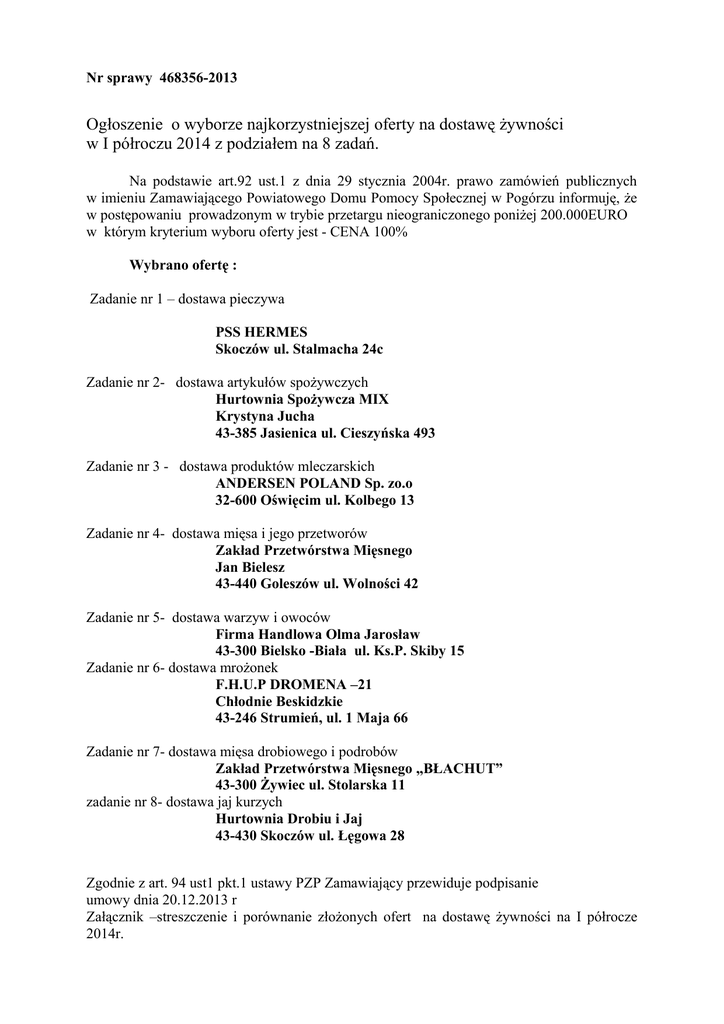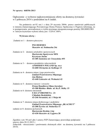 Nr sprawy 468356-2013 Ogłoszenie o wyborze najkorzystniejszej oferty na dostawę żywności w I półroczu 2014 z podziałem na 8 zadań. Na podstawie art.92 ust.1 z dnia 29 stycznia 2004r. prawo zamówień publicznych w imieniu Zamawiającego Powiatowego Domu Pomocy Społecznej w Pogórzu informuję, że w postępowaniu prowadzonym w trybie przetargu nieograniczonego poniżej 200.000EURO w którym kryterium wyboru oferty jest - CENA 100% Wybrano ofertę : Zadanie nr 1 – dostawa pieczywa PSS HERMES Skoczów ul. Stalmacha 24c Zadanie nr 2- dostawa artykułów spożywczych Hurtownia Spożywcza MIX Krystyna Jucha 43-385 Jasienica ul. Cieszyńska 493 Zadanie nr 3 - dostawa produktów mleczarskich ANDERSEN POLAND Sp. zo.o 32-600 Oświęcim ul. Kolbego 13 Zadanie nr 4- dostawa mięsa i jego przetworów Zakład Przetwórstwa Mięsnego Jan Bielesz 43-440 Goleszów ul. Wolności 42 Zadanie nr 5- dostawa warzyw i owoców Firma Handlowa Olma Jarosław 43-300 Bielsko -Biała ul. Ks.P. Skiby 15 Zadanie nr 6- dostawa mrożonek F.H.U.P DROMENA –21 Chłodnie Beskidzkie 43-246 Strumień, ul. 1 Maja 66 Zadanie nr 7- dostawa mięsa drobiowego i podrobów Zakład Przetwórstwa Mięsnego „BŁACHUT” 43-300 Żywiec ul. Stolarska 11 zadanie nr 8- dostawa jaj kurzych Hurtownia Drobiu i Jaj 43-430 Skoczów ul. Łęgowa 28 Zgodnie z art. 94 ust1 pkt.1 ustawy PZP Zamawiający przewiduje podpisanie umowy dnia 20.12.2013 r Załącznik –streszczenie i porównanie złożonych ofert na dostawę żywności na I półrocze 2014r. Załącznik nr sprawy 468356-2013 Streszczenie i porównanie złożonych ofert na dostawę żywności w I półroczu 2014r. z podziałem na 8 zadań: Zad.nr 1 Nr oferty Nazwa i adres Wykonawcy 1. Rejonowa Spółdzielnia SAMOPOMOC Cieszyn ul. Stawowa 101a PSS HERMES Skoczów ul.Stalmacha 24c PSS SPOŁEM Ustroń ul. 3 Maja 4 2 3. Cena brutto Liczba punktów w kryterium cena 100% 18.212.00 97,42 17.743,00 100 19.123,00 92,78 Zad. nr 2 Nr oferty Nazwa i adres Wykonawcy Cena brutto 1. P.P.H Polaris 62-800 Kalisz ul. Żołnierska 20a Hurtownia Spożywcza MIX Jasienica ul. Cieszyńska 493 Andersen Poland Sp.zo.o 36-600 Oświęcim ul. Kolbego 13 39.811,72 Liczba punktów w kryterium cena 100% 97,94 38.910,28 100 54.434,83 71,48 Nr oferty Nazwa i adres Wykonawcy Cena brutto 1. Andersen Poland Sp.zo.o 36-600 Oświęcim ul. Kolbego 13 Hurtowe Centrum Nabiału MILKO Katowice ul. Dulęby 5 MLECZDAR S.C Ustroń ul. Akacjowa 20 44.314,20 Liczba punktów w kryterium cena 100% 100 53.557,90 82.81 50.488,60 87,84 2. 3. Zad. nr 3 2. 3. Zad. nr 4 Nr oferty Nazwa i adres Wykonawcy 1. Zakład Przetwórstwa Mięsnego BŁACHUT 43-300 Żywiec ul. Stolarska 11 Zakład Przetwórstwa Mięsnego Jan Bielesz Goleszów, ul. Wolności 42 2. Cena brutto Liczba punktów w kryterium cena 100% odrzucona 41.422,60 100 43.305,15 95,65 3. DANESS Sp.zo.o 44-337 Jastrzębie Zdrój ul. Cieszyńska 168 4. P.H.Z. JUR-GAST Sp. z o.o. Wisła ul. Wyzwolenia 34a 45.740,10 90,56 Nr oferty Nazwa i adres Wykonawcy Cena brutto 1. F.H.U. DAMEX Surmański Damian Piekary Śląskie ul. Bytomska 86/1 P.P.H BŁAŻEJ Bielsko- Biała ul. Rzeźnicza 2 F.H Jarosław Olma Bielsko- Biała ul. Ks.P. Skiby 15 Andersen Poland Sp.zo.o 36-600 Oświęcim ul. Kolbego 13 41.826,90 Liczba punktów w kryterium cena 100% 88,56 40.023,25 92,56 37.044,05 100 46.250,00 80,09 Nr oferty Nazwa i adres Wykonawcy Cena brutto Liczba punktów w kryterium cena 100% 1. Zakłady Produkcji Spożywczej AMBI M.Karkut i Wspólnicy sp.j. Bytom ul. Składowa 11 Oddział Bielsko-Biała ul. Maczka 55a F.H.U.P DROMENA-21 Chłodnie Beskidzkie Strumień ul. 1 Maja 66 Hurtownia Drobiu i Jaj Mirosława Wierzbicka Skoczów ul. Łęgowa 28 19.754,80 77,25 15.260,18 100 16.808,30 90,79 Zad. nr 5 2. 3. 4. Zad. nr 6 2. 3. 4. 5. 6. P.P.H BŁAŻEJ Bielsko- Biała ul. Rzeźnicza 2 IGLOMEN Sp.zo.o Oddział 44-238 CzerwionkaLeszczyny ul. Rybnicka 68 F.H. MAR-TAD Sp.J 43-190 Mikołów ul. Rybnicka 20 18.009,20 84,74 17.571,02 86,85 17.567,60 86,86 Cena brutto Liczba punktów w kryterium cena 100% 10.067,30 99,20 10.195,90 97,96 9.987,60 100 Cena brutto Liczba punktów w kryterium cena 100% 5.880,00 91,84 9.600,00 56,26 5.400,00 100 5.564,00 97,05 8.800,00 61,36 Zad. nr 7 Nr oferty Nazwa i adres Wykonawcy 1. Zakład Przetwórstwa Drobiu MARICA spółka jawna Bielsko-Biała ul. Straconki 20 Hurtownia Drobiu i Jaj Mirosława Wierzbicka Skoczów ul. Łęgowa 28 Zakład Przetwórstwa Mięsnego BŁACHUT 43-300 Żywiec ul. Stolarska 11 2. 3. Zad. Nr 8 Nr oferty Nazwa i adres Wykonawcy 1. POLMAG Sp.C 43-303 Bielsko- Biała ul. I Armii Wojska Polskiego 7/48 P.P.H Polaris 62-800 Kalisz ul. Żołnierska 20a Hurtownia Drobiu i Jaj Mirosława Wierzbicka Skoczów ul. Łęgowa 28 Ferma Drobiu Michał Fojcik 43-419 Hażlach ul. Słoneczna 1 Andersen Poland Sp.zo.o 36-600 Oświęcim ul. Kolbego 13 2. 3. 4. 5. Oferta Zakładu Przetwórstwa Mięsnego BŁACHUT 43-300 Żywiec ul. Stolarska 11 została odrzucona na podstawie art. 89 ust.1. pkt .2. Dyrektor mgr Krzysztof Krzyżanowski