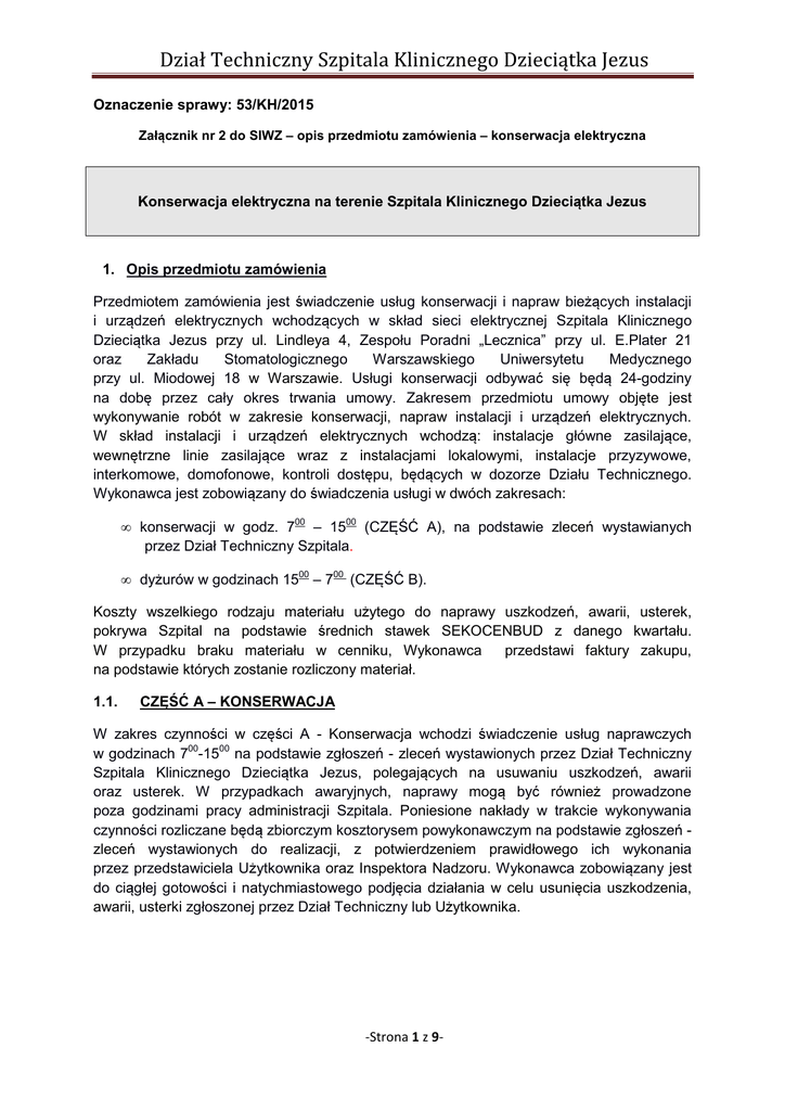 Dział Techniczny Szpitala Klinicznego Dzieciątka Jezus Oznaczenie sprawy: 53/KH/2015 Załącznik nr 2 do SIWZ – opis przedmiotu zamówienia – konserwacja elektryczna Konserwacja elektryczna na terenie Szpitala Klinicznego Dzieciątka Jezus 1. Opis przedmiotu zamówienia Przedmiotem zamówienia jest świadczenie usług konserwacji i napraw bieżących instalacji i urządzeń elektrycznych wchodzących w skład sieci elektrycznej Szpitala Klinicznego Dzieciątka Jezus przy ul. Lindleya 4, Zespołu Poradni „Lecznica” przy ul. E.Plater 21 oraz Zakładu Stomatologicznego Warszawskiego Uniwersytetu Medycznego przy ul. Miodowej 18 w Warszawie. Usługi konserwacji odbywać się będą 24-godziny na dobę przez cały okres trwania umowy. Zakresem przedmiotu umowy objęte jest wykonywanie robót w zakresie konserwacji, napraw instalacji i urządzeń elektrycznych. W skład instalacji i urządzeń elektrycznych wchodzą: instalacje główne zasilające, wewnętrzne linie zasilające wraz z instalacjami lokalowymi, instalacje przyzywowe, interkomowe, domofonowe, kontroli dostępu, będących w dozorze Działu Technicznego. Wykonawca jest zobowiązany do świadczenia usługi w dwóch zakresach: • konserwacji w godz. 700 – 1500 (CZĘŚĆ A), na podstawie zleceń wystawianych przez Dział Techniczny Szpitala. • dyżurów w godzinach 1500 – 700 (CZĘŚĆ B). Koszty wszelkiego rodzaju materiału użytego do naprawy uszkodzeń, awarii, usterek, pokrywa Szpital na podstawie średnich stawek SEKOCENBUD z danego kwartału. W przypadku braku materiału w cenniku, Wykonawca przedstawi faktury zakupu, na podstawie których zostanie rozliczony materiał. 1.1. CZĘŚĆ A – KONSERWACJA W zakres czynności w części A - Konserwacja wchodzi świadczenie usług naprawczych w godzinach 700-1500 na podstawie zgłoszeń - zleceń wystawionych przez Dział Techniczny Szpitala Klinicznego Dzieciątka Jezus, polegających na usuwaniu uszkodzeń, awarii oraz usterek. W przypadkach awaryjnych, naprawy mogą być również prowadzone poza godzinami pracy administracji Szpitala. Poniesione nakłady w trakcie wykonywania czynności rozliczane będą zbiorczym kosztorysem powykonawczym na podstawie zgłoszeń zleceń wystawionych do realizacji, z potwierdzeniem prawidłowego ich wykonania przez przedstawiciela Użytkownika oraz Inspektora Nadzoru. Wykonawca zobowiązany jest do ciągłej gotowości i natychmiastowego podjęcia działania w celu usunięcia uszkodzenia, awarii, usterki zgłoszonej przez Dział Techniczny lub Użytkownika. -Strona 1 z 9- Dział Techniczny Szpitala Klinicznego Dzieciątka Jezus 1.2. CZĘŚĆ B – DYŻUR Zakresem czynności w części B – Dyżur, jest świadczenie usług dyżuru w godzinach 1500-700. Wykonawca w cenie ryczałtowej w sytuacji wystąpienia awarii ma obowiązek jej usunięcia, przynajmniej w stopniu zapewniającym ciągłość zasilania w energię elektryczną. Zgłoszenia usterek, awarii, uszkodzeń, w godz. 15.00 – 7.00 kierowane będą bezpośrednio do konserwatorów. Zgłoszenia te konserwator zarejestruje w dzienniku zgłoszeń. W zakres dyżurów wchodzi również wykonywanie bieżących kontroli, sprawności instalacji i urządzeń, regulacja instalacji oraz urządzeń jak również dokonywanie przeglądów prawidłowości działania instalacji i urządzeń elektrycznych. 2. Charakterystyka obiektów Usługi wykonywane będą na obiektach objętych historycznym układałem urbanistycznym zespołu budynków Szpitala Klinicznego Dzieciątka Jezus w Warszawie ul. Lindleya 4 wpisanego do rejestru zabytków pod nr A-840 i znajdują się pod nadzorem Stołecznego Konserwatora Zabytków. Teren szpitala zlokalizowany jest między ulicami Lindleya, Nowogrodzką, Chałubińskiego i Oczki. Pierwotny układ zabudowy zaprojektowany przez architekta Piusa Dziekońskiego zrealizowany na przełomie XIX i XX wieku – pierzejowy w stosunku do ulic Lindleya, Oczki i Chałubińskiego oraz wolnostojące pawilony wewnętrzne ustawione po dwa, symetrycznie do głównej osi założenia urbanistycznego, równolegle do ulicy Lindleya. Na terenie istnieje rozbudowana sieć dróg dojazdowych i ciągów pieszych, infrastruktura sieci instalacyjnych oraz zieleń wysoka o charakterze parkowym. 3. Definicje pojęć użytych do opisu przedmiotu zamówienie jak również zakresu obowiązków. Konserwacja (CZĘŚĆ A 700-1500) – należy przez to rozumieć podejmowanie przez Wykonawcę niezbędnych czynności w celu zapewnienia bezawaryjnego działania instalacji i urządzeń elektrycznych Szpitala, jak również realizacja zgłoszeń o uszkodzeniach, awariach i usterkach przekazanych przez Dział Techniczny Szpitala Klinicznego Dzieciątka Jezus. Dyżur (CZĘŚĆ B 1500- 700) – należy przez to rozumieć gotowość Wykonawcy do podjęcia działań zmierzających do usunięcia uszkodzenia, awarii wskutek zgłoszenia. Wykonawca ma zabezpieczyć do czasu całkowitej naprawy miejsce awarii i podjąć niezbędne działania umożliwiające eksploatację obiektu. O dalszych decyzjach i zakresie prac naprawczych decyzje podejmuje branżowy Inspektor Nadzoru Działu Technicznego. W zakres dyżurów wchodzi również wykonywanie bieżących kontroli, sprawdzanie sprawności instalacji i urządzeń, regulacja instalacji, urządzeń, jak również dokonywanie przeglądów prawidłowości działania instalacji i urządzeń elektrycznych oraz obowiązkowe odnotowywanie faktu wykonania konserwacji w dokumentacji eksploatacyjnej. Naprawa – należy przez to rozumieć doprowadzenie uszkodzonej części instalacji lub urządzenia do pełnej sprawności technicznej umożliwiającej ich prawidłową eksploatację obejmującą w razie konieczności wymianę jej części lub podzespołów. -Strona 2 z 9- Dział Techniczny Szpitala Klinicznego Dzieciątka Jezus Uszkodzenie/Awaria/Usterka - stan niesprawności obiektu uniemożliwiający prawidłowe działanie występujący nagle. Zgłoszenie – należy ro