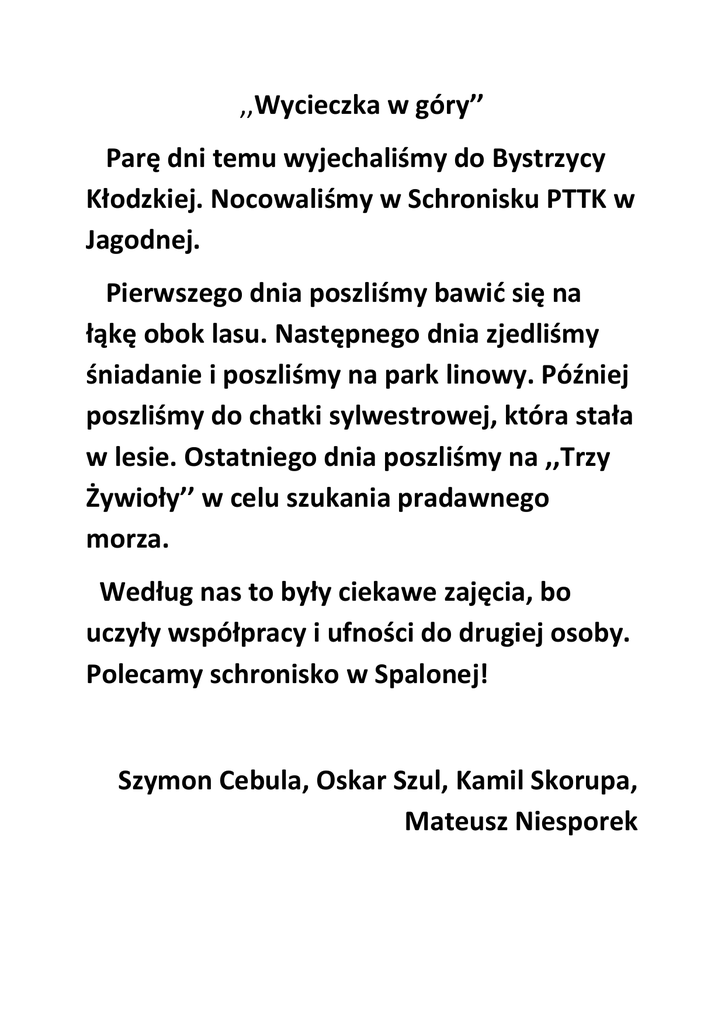 ,,Wycieczka w góry’’ Parę dni temu wyjechaliśmy do Bystrzycy Kłodzkiej. Nocowaliśmy w Schronisku PTTK w Jagodnej. Pierwszego dnia poszliśmy bawić się na łąkę obok lasu. Następnego dnia zjedliśmy śniadanie i poszliśmy na park linowy. Później poszliśmy do chatki sylwestrowej, która stała w lesie. Ostatniego dnia poszliśmy na ,,Trzy Żywioły’’ w celu szukania pradawnego morza. Według nas to były ciekawe zajęcia, bo uczyły współpracy i ufności do drugiej osoby. Polecamy schronisko w Spalonej! Szymon Cebula, Oskar Szul, Kamil Skorupa, Mateusz Niesporek