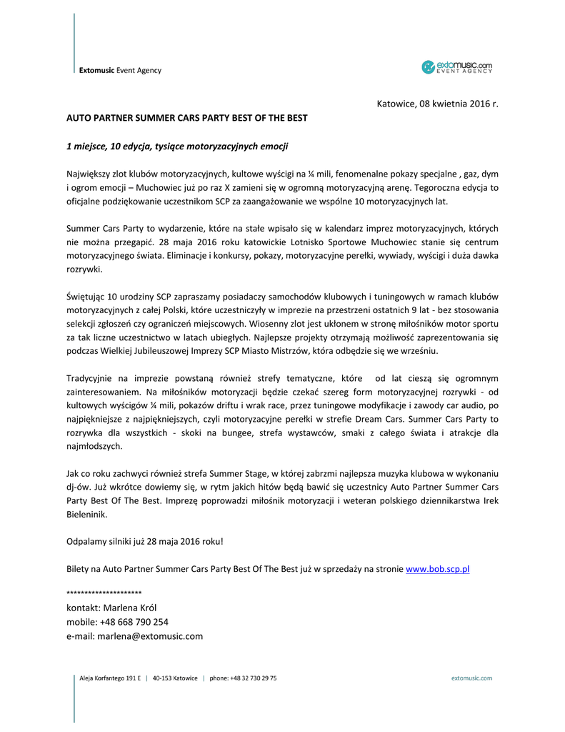 Katowice, 08 kwietnia 2016 r. AUTO PARTNER SUMMER CARS PARTY BEST OF THE BEST 1 miejsce, 10 edycja, tysiące motoryzacyjnych emocji Największy zlot klubów motoryzacyjnych, kultowe wyścigi na ¼ mili, fenomenalne pokazy specjalne , gaz, dym i ogrom emocji – Muchowiec już po raz X zamieni się w ogromną motoryzacyjną arenę. Tegoroczna edycja to oficjalne podziękowanie uczestnikom SCP za zaangażowanie we wspólne 10 motoryzacyjnych lat. Summer Cars Party to wydarzenie, które na stałe wpisało się w kalendarz imprez motoryzacyjnych, których nie można przegapić. 28 maja 2016 roku katowickie Lotnisko Sportowe Muchowiec stanie się centrum motoryzacyjnego świata. Eliminacje i konkursy, pokazy, motoryzacyjne perełki, wywiady, wyścigi i duża dawka rozrywki. Świętując 10 urodziny SCP zapraszamy posiadaczy samochodów klubowych i tuningowych w ramach klubów motoryzacyjnych z całej Polski, które uczestniczyły w imprezie na przestrzeni ostatnich 9 lat - bez stosowania selekcji zgłoszeń czy ograniczeń miejscowych. Wiosenny zlot jest ukłonem w stronę miłośników motor sportu za tak liczne uczestnictwo w latach ubiegłych. Najlepsze projekty otrzymają możliwość zaprezentowania się podczas Wielkiej Jubileuszowej Imprezy SCP Miasto Mistrzów, która odbędzie się we wrześniu. Tradycyjnie na imprezie powstaną również strefy tematyczne, które od lat cieszą się ogromnym zainteresowaniem. Na miłośników motoryzacji będzie czekać szereg form motoryzacyjnej rozrywki - od kultowych wyścigów ¼ mili, pokazów driftu i wrak race, przez tuningowe modyfikacje i zawody car audio, po najpiękniejsze z najpiękniejszych, czyli motoryzacyjne perełki w strefie Dream Cars. Summer Cars Party to rozrywka dla wszystkich - skoki na bungee, strefa wystawców, smaki z całego świata i atrakcje dla najmłodszych. Jak co roku zachwyci również strefa Summer Stage, w której zabrzmi najlepsza muzyka klubowa w wykonaniu dj-ów. Już wkrótce dowiemy się, w rytm jakich hitów będą bawić się uczestnicy Auto Partner Summer Cars Party Best Of The Best. Imprezę poprowadzi miłośnik motoryzacji i weteran polskiego dziennikarstwa Irek Bieleninik. Odpalamy silniki już 28 maja 2016 roku! Bilety na Auto Partner Summer Cars Party Best Of The Best już w sprzedaży na stronie www.bob.scp.pl ********************* kontakt: Marlena Król mobile: +48 668 790 254 e-mail: [email protected]