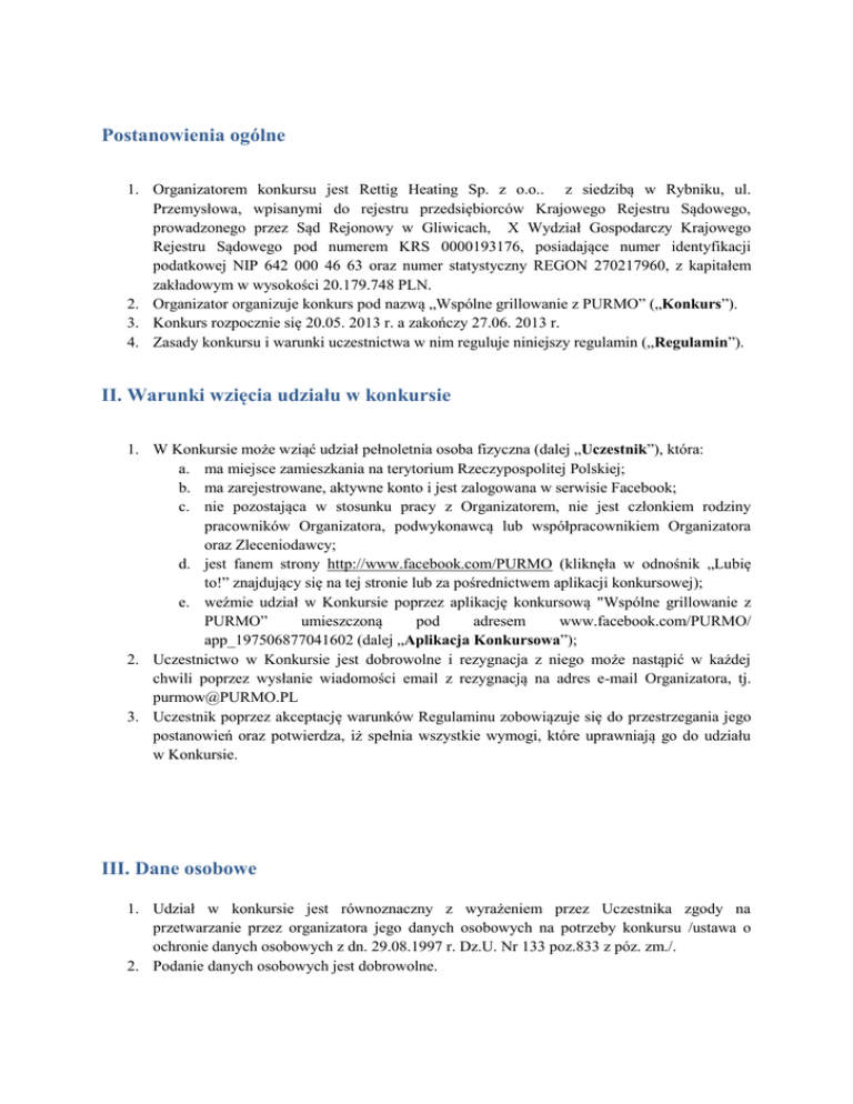 Postanowienia ogólne 1. Organizatorem konkursu jest Rettig Heating Sp. z o.o.. z siedzibą w Rybniku, ul. Przemysłowa, wpisanymi do rejestru przedsiębiorców Krajowego Rejestru Sądowego, prowadzonego przez Sąd Rejonowy w Gliwicach, X Wydział Gospodarczy Krajowego Rejestru Sądowego pod numerem KRS 0000193176, posiadające numer identyfikacji podatkowej NIP 642 000 46 63 oraz numer statystyczny REGON 270217960, z kapitałem zakładowym w wysokości 20.179.748 PLN. 2. Organizator organizuje konkurs pod nazwą „Wspólne grillowanie z PURMO” („Konkurs”). 3. Konkurs rozpocznie się 20.05. 2013 r. a zakończy 27.06. 2013 r. 4. Zasady konkursu i warunki uczestnictwa w nim reguluje niniejszy regulamin („Regulamin”). II. Warunki wzięcia udziału w konkursie 1. W Konkursie może wziąć udział pełnoletnia osoba fizyczna (dalej „Uczestnik”), która: a. ma miejsce zamieszkania na terytorium Rzeczypospolitej Polskiej; b. ma zarejestrowane, aktywne konto i jest zalogowana w serwisie Facebook; c. nie pozostająca w stosunku pracy z Organizatorem, nie jest członkiem rodziny pracowników Organizatora, podwykonawcą lub współpracownikiem Organizatora oraz Zleceniodawcy; d. jest fanem strony http://www.facebook.com/PURMO (kliknęła w odnośnik „Lubię to!” znajdujący się na tej stronie lub za pośrednictwem aplikacji konkursowej); e. weźmie udział w Konkursie poprzez aplikację konkursową "Wspólne grillowanie z PURMO” umieszczoną pod adresem www.facebook.com/PURMO/ app_197506877041602 (dalej „Aplikacja Konkursowa”); 2. Uczestnictwo w Konkursie jest dobrowolne i rezygnacja z niego może nastąpić w każdej chwili poprzez wysłanie wiadomości email z rezygnacją na adres e-mail Organizatora, tj. [email protected] 3. Uczestnik poprzez akceptację warunków Regulaminu zobowiązuje się do przestrzegania jego postanowień oraz potwierdza, iż spełnia wszystkie wymogi, które uprawniają go do udziału w Konkursie. III. Dane osobowe 1. Udział w konkursie jest równoznaczny z wyrażeniem przez Uczestnika zgody na przetwarzanie przez organizatora jego danych osobowych na potrzeby konkursu /ustawa o ochronie danych osobowych z dn. 29.08.1997 r. Dz.U. Nr 133 poz.833 z póz. zm./. 2. Podanie danych osobowych jest dobrowolne. 3. Organizator ma prawo do użycia na profilu PURMO imienia oraz nazwiska Uczestnika, który zostanie nagrodzony. IV. Zasady i przebieg Konkursu 1. Zadanie konkursowe polega na dodaniu zdjęcia lub kolażu zdjęć w Aplikacji Konkursowej, które spełnić musi następujące warunki: a. Jest własnością Uczestnika. b. W jego centralnej części będzie znajdował się Uczestnik lub jego dzieło związane z ideą konkursu -„Wspólne grillowanie z PURMO” . c. Nie będzie zawierać treści naruszających powszechnie obowiązujący porządek prawny, w szczególności zawierające wezwania do nienawiści rasowej, etnicznej, wyznaniowej, zawierających treści pornograficzne, pochwalające faszyzm, nazizm, komunizm, propagujących przemoc, obrażających uczucia religijne, naruszających dobra osobiste innych osób, treści pornograficznych, powszechnie uważanych za wulgarne oraz mogących obrazić osoby trzecie. 2. Każdy z Uczestników może wziąć udział w Konkursie zgłaszając jedną pracę. 3. Na jedną pracę konkursową każdy z Uczestników może głosować tylko raz w czasie trwania Konkursu. 4. Uczestnicy mogą głosować na swoje prace konkursowe. 5. Do II fazy przejdą wszystkie nadesłane zgłoszenia, które otrzymają minimum 30 głosów poprzez Aplikację Konkursową. 6. O przyznaniu nagród decyduje Jury Konkursowe. 7. Organizator ma prawo wymagać od nagrodzonych przesłania większej ilości zdjęć na potrzeby weryfikacji. 8. Jednemu Uczestnikowi Konkursu może zostać przyznana tylko jedna nagroda. 9. Dodawanie zgłoszeń oraz głosowanie będzie możliwe od 20.05. 2013 r. do 21.06. 2013 r. 10. W dniach 22.06. 2013 r. – 25.06. 2013 r. aplikacja przejdzie w tryb weryfikacji wyników Konkursu. 11. Ogłoszenie wyników Konkursu nastąpi 27.06. 2013 r. 12. Zwycięzca Konkursu zostanie powiadomiony o wygranej drogą elektroniczną na adres e-mail podany przez Uczestnika w serwisie Facebook w dniu dodania zgłoszenia, w ciągu 7 dni od daty ogłoszenia wyników na fanpage’u PURMO (https://www.facebook.com/PURMO/) 13. W ciągu 7 dni od otrzymania informacji o wygranej Zwycięzca jest zobowiązany przesłać na adres [email protected] następujące dane: a. Imię i nazwisko b. Adres korespondencyjny c. Numer telefonu W przypadku nie podania powyższych danych przez Zwycięzcę w określonym terminie lub podania nieprawidłowych danych, Zwycięzca taki traci prawo do nagrody. 14. Organizator zastrzega sobie prawo do usunięcia danego zgłoszenia, gdy zachodzi podejrzenie manipulacji, chęci wyłudzenia nagrody, nierzetelności, wszelkich działań niezgodnych z zapisami regulaminu oraz nieuczciwej konkurencji (np. zakładanie fałszywych kont w celu głosowania na swoje zgłoszenie). V. Nagrody 1. Nagrodami w Konkursie są: a. 1. miejsce – Grill węglowy ONE - TOUCH ORIGINAL marki WEBER o wartości 499 zł b. 2-6. miejsce – Książka z przepisami potraw grillowych „Outdoor Cooking” ( polska wersja językowa) 2. Nagrody nie podlegają wymianie na inne nagrody lub ekwiwalent pieniężny. 3. Nagrody zostaną wysłane za pośrednictwem poczty polskiej na podane przez laureatów adresy korespondencyjne. 4. Organizator zastrzega sobie prawo przyznania dodatkowych nagród. VI. Postanowienia końcowe 1. Organizator zastrzega sobie prawo do zmiany Regulaminu oraz przedłużenia czasu trwania Konkursu w każdym czasie, pod warunkiem, że nie naruszy to praw nabytych przez Uczestników. 2. Konkurs niniejszy nie jest sponsorowany, prowadzony, administrowany przez Facebook ani współprowadzony z Facebook. Uczestnik potwierdza, że został poinformowany, że dostarcza przesyłane informacje Organizatorowi Konkursu – firmie Rettig He