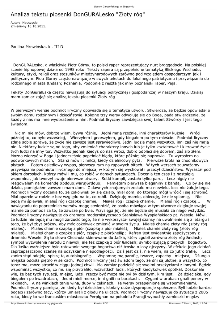 Liceum Garczyńskiego w Zbąszyniu Analiza tekstu piosenki DonGURALesko "Złoty róg" Autor: Nauczyciel Zmieniony 10.10.2011. Paulina Mrowińska, kl. III D DonGURALesko, a właściwie Piotr Górny, to polski raper reprezentujący nurt braggadocio. Na polskiej scenie hiphopowej działa od 1995 roku. Teksty rapera są przepełnione tematyką Bliskiego Wschodu, kultury, etyki, religii oraz stosunków międzynarodowych zarówno pod względem gospodarczym jak i politycznym. Piotr Górny często nawiązuje w swych tekstach do lokalnego patriotyzmu i przywiązania do rodzinnego miasta – Poznania. Podobnie z reszta jak inny poznański raper, Peja. Teksty DonGuralEska często nawiązują do sytuacji politycznej i gospodarczej w naszym kraju. Dzisiaj mam zamiar zająć się analizą tekstu piosenki Złoty róg W pierwszym wersie podmiot liryczny opowiada się o tematyce utworu. Stwierdza, że będzie opowiadał o swoim domu rodzinnym i dzieciństwie. Kolejne trzy wersy odwołują się do Boga, pada stwierdzenie, że każdy z nas ma inne wyobrażenie o nim. Podmiot liryczny zawdzięcza swój talent Stwórcy i jest tego świadom. Nic mi nie mów, dobrze wiem, bywa różnie, Jedni mają rzeźnie, inni charakterów kuźnie Wróci później to, co było wcześniej, Wierzyłem i grzeszyłem, gdy biegałem po tym mieście. Podmiot liryczny zdaje sobie sprawę, że życie nie zawsze jest sprawiedliwe. Jedni ludzie mają wszystko, inni zaś nie mają nic. Niektórzy ludzie są od tego, aby zmieniać charaktery innych lub je tylko kształtować i kierować życie tych ludzi na inny tor. Wszystko jednak kiedyś do nas wróci, dobro odpłaci się dobrem, zaś zło złem. Można wierzyć w Boga i jednocześnie popełniać błędy, które później się naprawia. Tu wyrosłem na podwórkowych mitach, Starsi mówili: milcz, kiedy dzielnicowy pyta. Pierwsze kroki na chodnikowych płytach, Potem osiedlowy wypas, pierwszy rym na rapowych bitach. W tych wersach zauważamy przywiązanie podmiotu lirycznego do miejsca, w którym się wychował i przeżył dzieciństwo. Wyrastał pod okiem dorosłych, którzy mówili mu, co robić w danych sytuacjach. Docenia ten czas i z nostalgią wspomina, jak tworzył swoje pierwsze utwory. Setki kumpli, zostało tylko paru, Lecz nigdy nie reagowałem na komendę „waruj” Pamiętam pierwsze bieganiny z bandą, Co by się nie działo, pamiętałem zawsze: mam dom. Z dawnych znajomych zostało mu niewielu, lecz nie żałuje tego. Podmiot liryczny docenia to, że cokolwiek by się działo, miał dom, do którego mógł wrócić i się schronić. Miał oparcie w rodzinie bez względu na to, co robił. Dziękuję mamie, obiecuję, że nie splamię, Nie będą mi śpiewali, miałeś róg i czapkę chamie, Miałeś róg i czapkę chamie, Miałeś róg i czapkę... W nawiązaniu do poprzednich wersów mogę stwierdzić, że osoba mówiąca w tym utworze dziękuje swojej mamie za pomoc i za to, że zawsze po była. Przysięga jej, że nie będzie się musiała za niego wstydzić. Podmiot liryczny nawiązuje do dramatu modernistycznego Stanisława Wyspiańskiego pt. Wesele. Mówi, że ludzie nie będą mu mogli zarzucić tego, że nie wykorzystał swojej szansy na uwolnienie się z letargu i tego, że był zbyt próżny, aby móc cokolwiek zmienić w swoim życiu. Miałeś chamie złoty róg (złoty róg miałeś), Miałeś chamie czapkę z piór (czapkę z piór miałeś), Miałeś chamie złoty róg (złoty róg miałeś), Miałeś chamie czapkę z piór, czapkę z piór… Refren jest ewidentnie zapożyczony z dramatu Wesele. Są to słowa Chochoła skierowane do Jaśka, który zgubił zarówno złoty róg – symbol wyzwolenia narodu z niewoli, ale też czapkę z piór – symbolizującą przepych i bogactwo. Dla Jaśka ważniejsze było ratowanie swojego bogactwa niż troska o losy ojczyzny. W efekcie jego działań zaprzepaszczono szansę na odzyskanie niepodległości. Dziś jest dziś, nie wiem, na co jutro trafię, Lecz zanim stąd odejdę, spiszę tą autobiografię. Wspomnę mą parafię, twarze, zapachy i miejsca, Dżungla miejska odcisła piętno w sercach. Podmiot liryczny jest świadom tego, że dni są ulotne, a wszystko, co teraz ma, może stracić w ciągu jednej chwili. Ma zamiar podzielić się swoimi przeżyciami z innymi. Będzie wspominać wszystko, co mu się przytrafiło, wszystkich ludzi, których kiedykolwiek spotkał. Doskonale wie, że bez tych sytuacji, miejsc, ludzi, rzeczy być może nie był by dziś tym, kim jest. Za dzieciaka, gdy biegałem po kwadratach, Jedni mieli merce, inni gnili na barakach, Cygani w arabach gnali penery w rekinach, A na winklach tanie wina, dupy w cekinach. Te wersy przepełnione są wspomnieniami. Podmiot liryczny pamięta, że kiedy był dzieckiem, istniały duże dysproporcje społeczne. Byli ludzie bardzo bogaci i zarówno tacy, którzy umierali z głodu na ulicach. Podmiot liryczny nawiązuje do sytuacji z 2005 roku, kiedy to we francuskim miasteczku Perpignan na południu Francji wybuchły zamieszki między http://www.lozbaszyn.oswiata.org.pl/joomla Kreator PDF Utworzono 7 March, 2017, 12:56 Liceum Garczyńskiego w Zbąszyniu Cyganami, a Arabami zamieszkującymi tamte tereny. Sytuacja była wtedy tak napięta, że trzeba było trzech kompani policji do stłumienia zamieszek. Na grzbietach skorupy, spodnie piramidy Nike'i, Obrotne chłopaki miały zagraniczne fajki, Jak częstowali, to małolaty kaszleli, Błyszczeli, kościoły w szwach pękały przy niedzieli. Podmiot liryczny przywołuje swoje wspomnienia, kiedy to ludzie musieli być bardzo odporni na wszystko, co się działo dookoła. Otaczano się ochronnymi „skorupami”, aby ich nie zraniono. Ci, którzy posiadali jakiekolwiek znajomości, mogli sobie pozwolić na towary luksusowe, wtedy byli uznawali za tzw. elitę. Nie wiedzieli, jakie tu nadchodzą zmiany, Dla niektórych świat był i jest po******. Inni nie dożyli, połączyli się z rodziną, Jeden pędzi