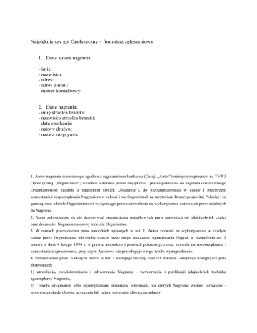 Najpiękniejszy gol Opolszyczny – formularz zgłoszeniowy 1. Dane autora nagrania: - imię: - nazwisko: - adres: - adres e-mail: - numer kontaktowy: 2. Dane nagrania: - imię strzelca bramki: - nazwisko strzelca bramki: - data spotkania: - nazwy drużyn: - nazwa rozgrywek: 1. Autor nagrania doręczanego zgodnie z regulaminem konkursu (Dalej: „Autor”) niniejszym przenosi na TVP 3 Opole (Dalej: „Organizator”) wszelkie autorskie prawa majątkowe i prawa pokrewne do nagrania dostarczonego Organizatorowi zgodnie z nagraniem (Dalej: „Nagranie”), do nieograniczonego w czasie i przestrzeni korzystania i rozporządzania Nagraniem w całości i we fragmentach na terytorium Rzeczypospolitej Polskiej i za granicą oraz udziela Organizatorowi wyłącznego prawa zezwalania na wykonywanie autorskich praw zależnych do Nagrania. 2. Autor zobowiązuje się nie dokonywać przeniesienia majątkowych praw autorskich do jakiejkolwiek części oraz do całości Nagrania na osoby inne niż Organizator. 3. W ramach przeniesienia praw autorskich opisanych w ust. 1, Autor zezwala na wykonywanie w każdym czasie przez Organizatora lub osoby trzecie przez niego wskazane, opracowania Nagrań w rozumieniu art. 2 ustawy z dnia 4 lutego 1994 r. o prawie autorskim i prawach pokrewnych oraz zezwala na rozporządzanie i korzystanie z opracowania, przy czym Autorowi nie przysługuje z tego tytułu wynagrodzenie. 4. Przeniesienie praw, o których mowa w ust. 1 następuje na cały czas ich trwania i obejmuje następujące pola eksploatacji: 1) utrwalania, zwielokrotniania i odtwarzania Nagrania - wytwarzania i publikacji jakąkolwiek techniką egzemplarzy Nagrania, 2) obrotu oryginałem albo egzemplarzami nośników informacji, na których Nagranie zostało utrwalone wprowadzania do obrotu, użyczenia lub najmu oryginału albo egzemplarzy, 3) rozpowszechniania Nagrania w sposób inny niż określony powyżej, w szczególności publiczne udostępnianie Nagrania w taki sposób, aby każdy mógł mieć do Nagrania dostęp w miejscu i w czasie przez siebie wybranym, 4) korzystania z Nagrania zgodnie z charakterem i przeznaczeniem Nagrania. 5. Organizator ma prawo do wykorzystania całości lub części Nagrania w celach reklamowych, informacyjnych i promocyjnych, we wszystkich materiałach wydawanych i rozpowszechnianych publicznie lub na pokazach zamkniętych, w każdej formie lub technice, w tym w formie fotografii, plakatów, w prasie, w Internecie, w wydawnictwach Nabywcy. 6. Organizator ma prawo korzystać i rozpowszechniać Nagranie oraz opracowania Nagrania bez oznaczania ich imieniem i nazwiskiem Autora; Autor upoważnia także Organizatora do wykonywania autorskich praw osobistych Autora. 7. Organizator ma prawo zbyć nabyte prawa lub upoważnić osoby trzecie do korzystania z uzyskanych zezwoleń. 8. Z chwilą dostarczenia Organizatorowi Nagrania, Autor przenosi na Organizatora własność nośnika informacji, na którym utrwalono Nagranie. 9. Za przeniesienie na Organizatora autorskich praw majątkowych do Nagrania Autorowi nie przysługuje wynagrodzenie.