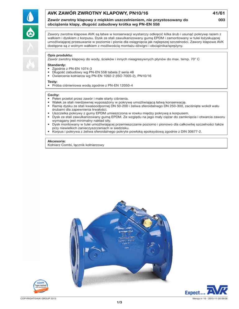 AVK ZAWÓR ZWROTNY KLAPOWY, PN10/16 41/61