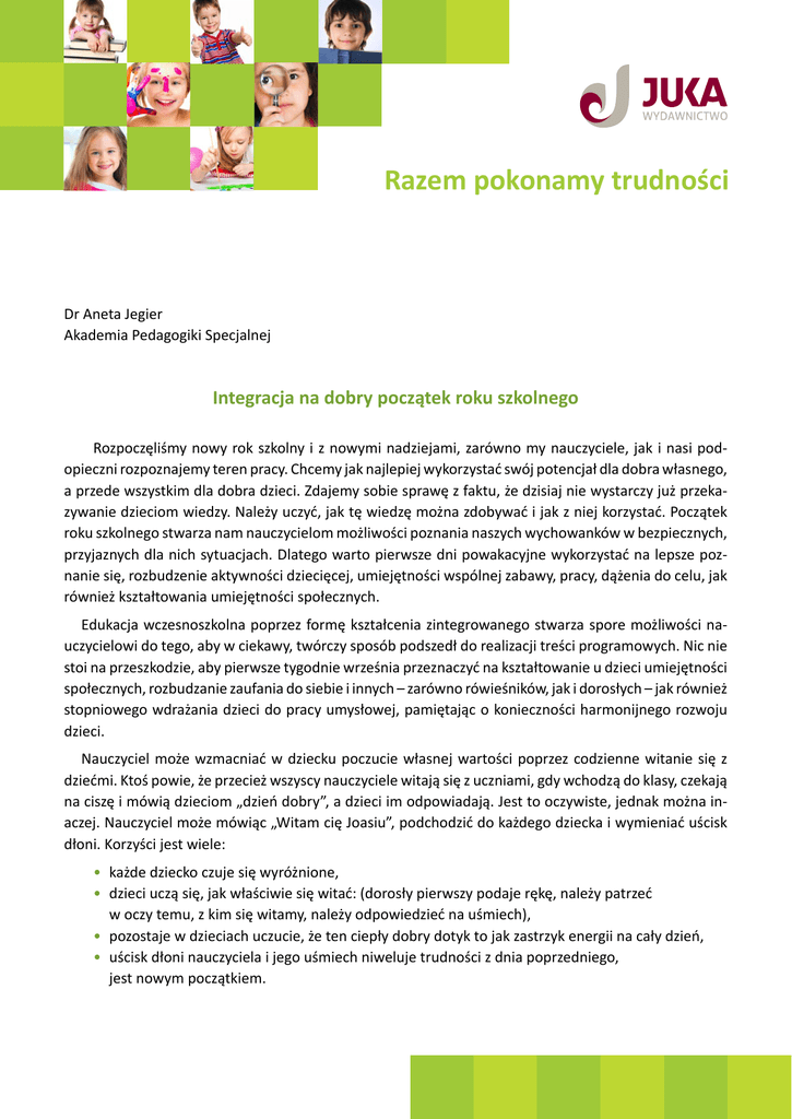 Razem pokonamy trudności Dr Aneta Jegier Akademia Pedagogiki Specjalnej Integracja na dobry początek roku szkolnego Rozpoczęliśmy nowy rok szkolny i z nowymi nadziejami, zarówno my nauczyciele, jak i nasi podopieczni rozpoznajemy teren pracy. Chcemy jak najlepiej wykorzystać swój potencjał dla dobra własnego, a przede wszystkim dla dobra dzieci. Zdajemy sobie sprawę z faktu, że dzisiaj nie wystarczy już przekazywanie dzieciom wiedzy. Należy uczyć, jak tę wiedzę można zdobywać i jak z niej korzystać. Początek roku szkolnego stwarza nam nauczycielom możliwości poznania naszych wychowanków w bezpiecznych, przyjaznych dla nich sytuacjach. Dlatego warto pierwsze dni powakacyjne wykorzystać na lepsze poznanie się, rozbudzenie aktywności dziecięcej, umiejętności wspólnej zabawy, pracy, dążenia do celu, jak również kształtowania umiejętności społecznych. Edukacja wczesnoszkolna poprzez formę kształcenia zintegrowanego stwarza spore możliwości nauczycielowi do tego, aby w ciekawy, twórczy sposób podszedł do realizacji treści programowych. Nic nie stoi na przeszkodzie, aby pierwsze tygodnie września przeznaczyć na kształtowanie u dzieci umiejętności społecznych, rozbudzanie zaufania do siebie i innych – zarówno rówieśników, jak i dorosłych – jak również stopniowego wdrażania dzieci do pracy umysłowej, pamiętając o konieczności harmonijnego rozwoju dzieci. Nauczyciel może wzmacniać w dziecku poczucie własnej wartości poprzez codzienne witanie się z dziećmi. Ktoś powie, że przecież wszyscy nauczyciele witają się z uczniami, gdy wchodzą do klasy, czekają na ciszę i mówią dzieciom „dzień dobry”, a dzieci im odpowiadają. Jest to oczywiste, jednak można inaczej. Nauczyciel może mówiąc „Witam cię Joasiu”, podchodzić do każdego dziecka i wymieniać uścisk dłoni. Korzyści jest wiele: • każde dziecko czuje się wyróżnione, • dzieci uczą się, jak właściwie się witać: (dorosły pierwszy podaje rękę, należy patrzeć w oczy temu, z kim się witamy, należy odpowiedzieć na uśmiech), • pozostaje w dzieciach uczucie, że ten ciepły dobry dotyk to jak zastrzyk energii na cały dzień, • uścisk dłoni nauczyciela i jego uśmiech niweluje trudności z dnia poprzedniego, jest nowym początkiem. Razem pokonamy trudności Poczucie własnej wartości wzmacniamy w dzieciach także poprzez nazywanie ich imionami, do jakich są przyzwyczajone lub jak lubią, żeby do nich mówić (oczywiście są pewne granice!). Ważne są rozmowy na tematy, które inicjują dzieci. W ich trakcie nauczyciel może okazać zainteresowanie każdemu dziecku, nauczyć je empatycznego słuchania innych, jak również traktowania wszystkich z szacunkiem i poszanowaniem godności. Pierwsze dni w szkole to też czas na wdrożenie zasad, które mają nas wszystkich obowiązywać. Jednak, żeby dzieci mogły je przyjąć za swoje i ich przestrzegać, muszą je dobrze poznać i zrozumieć, a także wiedzieć, jakie są konsekwencje ich nieprzestrzegania. Bardzo ważna jest w tym przypadku właściwa postawa nauczyciela, który nie tylko ma wymagać przestrzegania zasad, ale także własnym postępowaniem udowadniać dzieciom sens ich wdrożenia w życie. Zasady sprzyjają poczuciu bezpieczeństwa u dzieci, porządkują ich świat i dlatego tak istotne jest ich wprowadzenie. Dobrym wypróbowanym pomysłem jest wspólne ustalanie obowiązujących w klasie zasad wraz z ich uzasadnieniem. Dzieci mogą zgłaszać swoje propozycje i o nich dyskutować. Dzieci przekonane, że ich pomysły są szanowane i wdrażane w życie klasy szybciej utożsamiają się z grupą i łatwiej przestrzegają wspólnych ustaleń, pilnując siebie nawzajem. Czas wakacyjny nie sprzyjał siedzeniu w domu. Większość z naszych wychowanków przebywała dużo czasu na świeżym powietrzu angażując się w zabawy ruchowe. Trudno jest zamienić ten beztroski czas na wypełnianie obowiązków szkolnych, dlatego postarajmy się im w tym pomóc. Przeznaczmy pierwsze tygodnie na zorganizowanie na przykład wspólnej wyprawy. Do takiej wyprawy oczywiście trzeba się przygotować. Jej celem może być: • szukanie miejsc wartych pokazania cudzoziemcowi, • trudności, jakie napotka osoba poruszająca się na wózku inwalidzkim w naszej okolicy, • zbadanie, czy nasza okolica jest przyjazna dla roślin i zwierząt, itp. Wiele zależy tu od kreatywności nauczyciela, umiejętności dostosowania treści do indywidualnych potrzeb i możliwości dzieci, rozbudzenia ciekawości dziecięcej, umiejętności dokonywania zmian (na przykład w zależności od warunków pogodowych), jak i wdrażania własnych pomysłów. Najważniejsza jest pomysłowość i zaangażowanie dzieci oraz prowadzącego. Razem pokonamy trudności W każdym projekcie, który chcemy realizować z naszą klasą ważne jest kształtowanie następujących umiejętności społecznych, które pomogą dzieciom w lepszym funkcjonowaniu w roli ucznia. Należą do nich: • Umiejętność czekania. Uczniowie klas I – III to jeszcze małe dzieci, które nie zawsze w domu są uczone tej umiejętności. Wakacje także sprzyjają sytuacjom, że dzieciom na więcej się pozwala, jest się bardziej pobłażliwym i wiele dziecięcych życzeń spełnia się „od ręki”. Warto dobierać tak zabawy, żeby dzieci uczyły się cierpliwości i wytrwałości, gdyż są to niezbędne atrybuty funkcjonowania dobrego ucznia. • Umiejętność słuchania. Podczas gier i zabaw uczmy dzieci właściwego słuchania innych, wysłuchiwania do końca, nieprzeszkadzania, gdy inny mówi. Będzie mu łatwiej przyswoić sobie polecenie na zajęciach i właściwie je wykonać. • Umiejętność opowiadania. Po wakacjach większość dzieci nie trzeba zachęcać do opowieści o swoich przeżyciach. Warto przy tym pokazywać im, jak opowiadać we właściwy sposób i naprowadzać je, gdy odbiegają od tematu lub przerywają so
