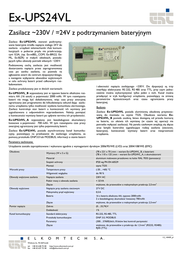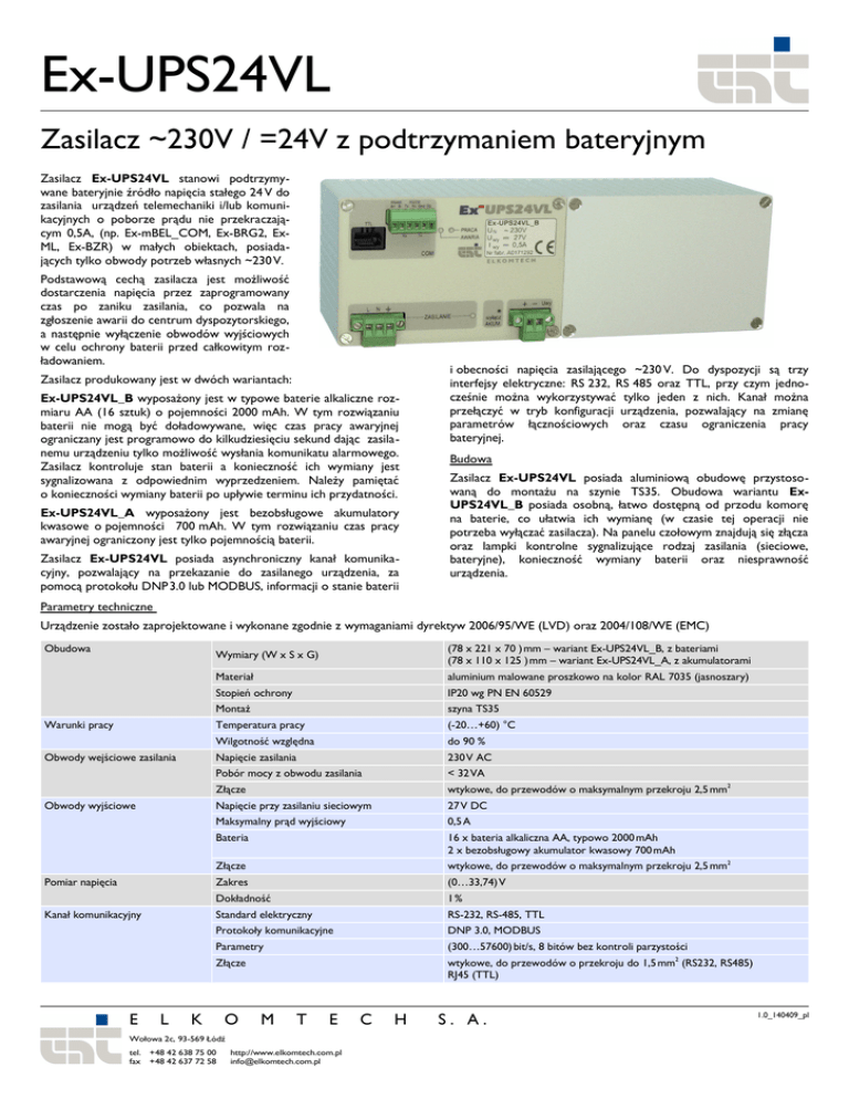Ex-UPS24VL Zasilacz ~230V / =24V z podtrzymaniem bateryjnym Zasilacz Ex-UPS24VL stanowi podtrzymywane bateryjnie źródło napięcia stałego 24 V do zasilania urządzeń telemechaniki i/lub komunikacyjnych o poborze prądu nie przekraczającym 0,5A, (np. Ex-mBEL_COM, Ex-BRG2, ExML, Ex-BZR) w małych obiektach, posiadających tylko obwody potrzeb własnych ~230 V. Podstawową cechą zasilacza jest możliwość dostarczenia napięcia przez zaprogramowany czas po zaniku zasilania, co pozwala na zgłoszenie awarii do centrum dyspozytorskiego, a następnie wyłączenie obwodów wyjściowych w celu ochrony baterii przed całkowitym rozładowaniem. Zasilacz produkowany jest w dwóch wariantach: Ex-UPS24VL_B wyposażony jest w typowe baterie alkaliczne rozmiaru AA (16 sztuk) o pojemności 2000 mAh. W tym rozwiązaniu baterii nie mogą być doładowywane, więc czas pracy awaryjnej ograniczany jest programowo do kilkudziesięciu sekund dając zasilanemu urządzeniu tylko możliwość wysłania komunikatu alarmowego. Zasilacz kontroluje stan baterii a konieczność ich wymiany jest sygnalizowana z odpowiednim wyprzedzeniem. Należy pamiętać o konieczności wymiany baterii po upływie terminu ich przydatności. Ex-UPS24VL_A wyposażony jest bezobsługowe akumulatory kwasowe o pojemności 700 mAh. W tym rozwiązaniu czas pracy awaryjnej ograniczony jest tylko pojemnością baterii. Zasilacz Ex-UPS24VL posiada asynchroniczny kanał komunikacyjny, pozwalający na przekazanie do zasilanego urządzenia, za pomocą protokołu DNP 3.0 lub MODBUS, informacji o stanie baterii i obecności napięcia zasilającego ~230 V. Do dyspozycji są trzy interfejsy elektryczne: RS 232, RS 485 oraz TTL, przy czym jednocześnie można wykorzystywać tylko jeden z nich. Kanał można przełączyć w tryb konfiguracji urządzenia, pozwalający na zmianę parametrów łącznościowych oraz czasu ograniczenia pracy bateryjnej. Budowa Zasilacz Ex-UPS24VL posiada aluminiową obudowę przystosowaną do montażu na szynie TS35. Obudowa wariantu ExUPS24VL_B posiada osobną, łatwo dostępną od przodu komorę na baterie, co ułatwia ich wymianę (w czasie tej operacji nie potrzeba wyłączać zasilacza). Na panelu czołowym znajdują się złącza oraz lampki kontrolne sygnalizujące rodzaj zasilania (sieciowe, bateryjne), konieczność wymiany baterii oraz niesprawność urządzenia. Parametry techniczne Urządzenie zostało zaprojektowane i wykonane zgodnie z wymaganiami dyrektyw 2006/95/WE (LVD) oraz 2004/108/WE (EMC) Obudowa Warunki pracy Obwody wejściowe zasilania Obwody wyjściowe Pomiar napięcia Kanał komunikacyjny E L Wymiary (W x S x G) (78 x 221 x 70 ) mm – wariant Ex-UPS24VL_B, z bateriami (78 x 110 x 125 ) mm – wariant Ex-UPS24VL_A, z akumulatorami Materiał aluminium malowane proszkowo na kolor RAL 7035 (jasnoszary) Stopień ochrony IP20 wg PN EN 60529 Montaż szyna TS35 Temperatura pracy (-20…+60) °C Wilgotność względna do 90 % Napięcie zasilania 230 V AC Pobór mocy z obwodu zasilania < 32 VA Złącze wtykowe, do przewodów o maksymalnym przekroju 2,5 mm2 Napięcie przy zasilaniu sieciowym 27 V DC Maksymalny prąd wyjściowy 0,5 A Bateria 16 x bateria alkaliczna AA, typowo 2000 mAh 2 x bezobsługowy akumulator kwasowy 700 mAh Złącze wtykowe, do przewodów o maksymalnym przekroju 2,5 mm2 Zakres (0…33,74) V Dokładność 1% Standard elektryczny RS-232, RS-485, TTL Protokoły komunikacyjne DNP 3.0, MODBUS Parametry (300…57600) bit/s, 8 bitów bez kontroli parzystości Złącze wtykowe, do przewodów o przekroju do 1,5 mm2 (RS232, RS485) RJ45 (TTL) K O M T E Wołowa 2c, 93-569 Łódź tel. +48 42 638 75 00 fax +48 42 637 72 58 http://www.elkomtech.com.pl [email protected] C H S. A. 1.0_140409_pl
