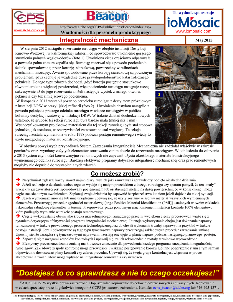 To wydanie sponsoruje www.aiche.org/ccps http://www.aiche.org/CCPS/Publications/Beacon/index.aspx www.iomosaic.com Wiadomości dla personelu produkcyjnego Integralność mechaniczna W sierpniu 2012 nastąpiło rozerwanie rurociągu w obrębie instalacji Destylacji Rurowo-Wieżowej, w kalifornijskiej rafinerii, co spowodowało uwolnienie gorącego strumienia palnych węglowodorów (foto 1). Uwolniona ciecz częściowo odparowała a powstała palna chmura zapaliła się. Rurociąg rozerwał się z powodu pocienienia ścianki spowodowanej przez korozję siarczkową, powszechny w rafineriach mechanizm niszczący. Awarie spowodowane przez korozję siarczkową są poważnym problemem, gdyż cechuje je względnie duże prawdopodobieństwo katastroficznego pęknięcia. Do tego typu zdarzeń dochodzi, gdyż korozja postępuje stosunkowo równomiernie na większej powierzchni, więc pocienienie rurociągu następuje raczej sukcesywnie aż do jego rozerwania aniżeli następuje wyciek z małego otworu, pęknięcia czy też z miejscowego pocienienia. W listopadzie 2013 wystąpił pożar po przecieku rurociągu z destylatem próżniowym z instalacji DRW w brazylijskiej rafinerii (foto 2). Uwolnienie destylatu nastąpiło z powodu pęknięcia prostego odcinka rurociągu w wiązce rurociągów w pobliżu kolumny destylacji rzutowej w instalacji DRW. W trakcie działań dochodzeniowych ustalono, że grubość tej sekcji rurociągu była bardzo mała (mniej niż 1 mm). Wyspecyfikowanym projektowo materiałem dla tej sekcji rurociągu była stal stopowa jednakże, jak ustalono, w rzeczywistości zastosowano stal węglową. Ta sekcja rurociągu została wymieniona w roku 1998 podczas postoju remontowego i wtedy to użyto niezgodnego materiału konstrukcyjnego. Maj 2015 1 2 W obydwu powyższych przypadkach System Zarządzania Integralnością Mechaniczną nie zadziałał właściwie w zakresie pomiarów oraz wymiany zużytych elementów orurowania zanim doszło do rozerwania rurociągów. W odniesieniu do zdarzenia z 2013 system czynności konserwacyjno-remontowych nie zapewnił użycia określonego materiału konstrukcyjnego wymienianego odcinka rurociągu. Bardziej efektywne programy dotyczące integralność mechanicznej oraz prac remontowych mogłyby nie dopuścić do wystąpienia tych zdarzeń. Co możesz zrobić? Natychmiast zgłaszaj każdy, nawet najmniejszy, wyciek jaki zauważysz i sprawdź czy podjęto niezbędne działania. Jeżeli realizujesz działania wobec tego co wydaje się małym przeciekiem z dużego rurociągu czy aparatu pomyśl, że ten „mały” wyciek w rzeczywistości jest spowodowany pocienieniem lub osłabieniem metalu na dużej powierzchni, co w konsekwencji może nagle stać się dużym uwolnieniem. Zaplanuj swoje działania by zapewnić bezpieczeństwo ludziom jeżeli dojdzie do takiej sytuacji. Jeżeli wymieniasz rurociąg lub inne urządzenie upewnij się, że użyty zostanie właściwy materiał wszystkich wymienianych elementów. Przestrzegaj procedur zgodności materiałowej [ang.: Positive Material Identification (PMI)] ustalonych w twoim zakładzie i skontroluj zabudowę elementów w terenie. Przeprowadź przez ponownym uruchomieniem instalacji kontrolę 100% elementów, które podlegały wymianie w trakcie postoju remontowego. Częste wykorzystanie obejm jako środka uszczelniającego i zaradczego przeciw wyciekom cieczy procesowych wiąże się z pytaniem dotyczącym efektywności programu integralności mechanicznej. Intencją wykorzystania obejm jest dokonanie naprawy tymczasowej w trakcie prowadzonego procesu technologicznego aż do chwili wykonania trwałej naprawy, na przykład w trakcie postoju instalacji. Jeżeli dokonywane są tego typu tymczasowe naprawy przestrzegaj zakładowych procedur zarządzania zmianą. Upewnij się, że zarządza się tymczasowymi naprawami i zostają one ujęte w planie napraw podczas następnego planowego postoju. Zapoznaj się z uwagami zespołów kontrolnych i upewnij się, że ich rekomendacje zostały terminowo wprowadzone. Efektywny proces zarządzania zmianą ma kluczowe znaczenie dla powodzenia każdego programu zarządzania integralnością rurociągów. Zakładowe zespoły kontrolne mogą przewidzieć i wskazać postępowanie korozji lub inne pogorszenie stanu a tym samym odpowiednio dostosować plany kontroli czy zakres procedur. Upewnij się, że twoja grupa kontrolna jest włączona w proces akceptowania zmian, które mogą wpłynąć na integralność orurowania czy urządzeń. “Dostajesz to co sprawdzasz a nie to czego oczekujesz!” ©AIChE 2015. Wszystkie prawa zastrzeżone. Dopuszczalne kopiowanie do celów nie-biznesowych i edukacyjnych. Kopiowanie w celach sprzedaży przez kogokolwiek innego niż CCPS jest surowo zabronione. Kontakt: [email protected] lub 646-495-1371. The Beacon dostępny jest w językach: afrikaans, angielskim, arabskim, chińskim, czeskim, duńskim, francuskim, greckim, gudżarati, hebrajskim, hindi, hiszpańskim, holenderskim, japońskim, koreańskim, malajskim, marathi, niemieckim, norweskim, perskim, polskim, portugalskim, rosyjskim, rumuńskim, szwedzkim, tajskim, telugu, tureckim, wietnamskim i włoskim.