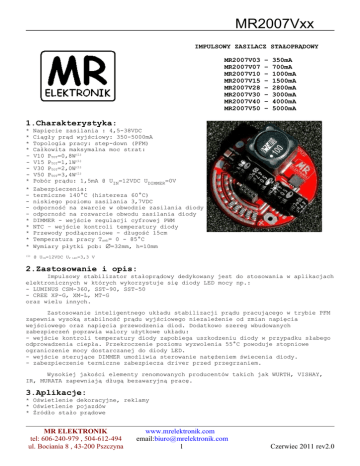 MR2007Vxx IMPULSOWY ZASILACZ STAŁOPRĄDOWY MR2007V03 MR2007V07 MR2007V10 MR2007V15 MR2007V28 MR2007V30 MR2007V40 MR2007V50 – – – – – – – – 350mA 700mA 1000mA 1500mA 2800mA 3000mA 4000mA 5000mA 1.Charakterystyka: * * * * * * * * * * * Napięcie zasilania : 4,5-38VDC Ciągły prąd wyjściowy: 350-5000mA Topologia pracy: step-down (PFM) Całkowita maksymalna moc strat: V10 PTOT=0,8W(1) V15 PTOT=1,1W(1) V30 PTOT=2,0W(1) V50 PTOT=3,4W(1) Pobór prądu: 1,5mA @ UIN=12VDC UDIMMER=0V Zabezpieczenia: termiczne 140°C (histereza 60°C) niskiego poziomu zasilania 3,7VDC odporność na zwarcie w obwodzie zasilania diody odporność na rozwarcie obwodu zasilania diody DIMMER - wejście regulacji cyfrowej PWM NTC – wejście kontroli temperatury diody Przewody podłączeniowe - długość 15cm Temperatura pracy Tamb= 0 - 85°C Wymiary płytki pcb: ∅=32mm, h=10mm (1) @ UIN=12VDC UF LED =3,3 V 2.Zastosowanie i opis: Impulsowy stabilizator stałoprądowy dedykowany jest do stosowania w aplikacjach elektronicznych w których wykorzystuje się diody LED mocy np.: - LUMINUS CSM-360, SST-90, SST-50 - CREE XP-G, XM-L, MT-G oraz wielu innych. Zastosowanie inteligentnego układu stabilizacji prądu pracującego w trybie PFM zapewnia wysoką stabilność prądu wyjściowego niezależenie od zmian napięcia wejściowego oraz napięcia przewodzenia diod. Dodatkowo szereg wbudowanych zabezpieczeń poprawia walory użytkowe układu: - wejście kontroli temperatury diody zapobiega uszkodzeniu diody w przypadku słabego odprowadzenia ciepła. Przekroczenie poziomu wyzwolenia 55°C powoduje stopniowe ograniczenie mocy dostarczanej do diody LED. - wejście sterujące DIMMER umożliwia sterowanie natężeniem świecenia diody. - zabezpieczenie termiczne zabezpiecza driver przed przegrzaniem. Wysokiej jakości elementy renomowanych producentów takich jak WURTH, VISHAY, IR, MURATA zapewniają długą bezawaryjną pracę. 3.Aplikacje: * Oświetlenie dekoracyjne, reklamy * Oświetlenie pojazdów * Źródło stało prądowe MR ELEKTRONIK tel: 606-240-979 , 504-612-494 ul. Bociania 8 , 43-200 Pszczyna www.mrelektronik.com email:[email protected] 1 Czerwiec 2011 rev2.0 MR2007Vxx 4.Typowa przykładowa aplikacja: 5.Zasilanie: Sterownik został wyposażony w przewodu podłączeniowe o długości 15cm w kolorach: czerwony (dodatni biegun zasilania) czarny (ujemny biegun zasilania) Przewody zasilające należy podłączyć zgodnie z polaryzacją źródła zasilana. Sterownik nie posiada zabezpieczenia przed odwrotną polaryzacją zasilania. Odwrotne podłączenie powoduje natychmiastowe jego uszkodzenie. Zakres napięcia zasilania sterownika wynosi 4,5-38VDC. – – Do uzyskania wymaganych parametrów wyjściowych sterownika napięcie zasilania UZAS musi być wyższe od spadku napięcia na zespole diod LED. Minimalna jego wartość obliczana jest według poniższego wzoru: UZAS = n * UF + 1.0V warunek 4,5V<UZAS<38V n – ilość diod w szeregu UF – spadek napięcia na diodzie przy określonym nominalnym prądzie diody (maksymalna wartość napięcia przewodzenia UF=36VDC) Wydajność prądowa źródła zasilania musi być większa o 15% od prądu nominalnego danego modelu sterownika. Najlepszą sprawność modułu uzyskujemy przy różnicy Uzas – UF w granicach 1-5V V50 – 5000 mA PTOT=3.4W at UIN=12V UF PTOT=4.2W at UIN=20V UF PTOT=5.8W at UIN=38V UF =3.32V =3.32V LED=3.32V LED LED n=0.82 at UIN =12VDC UF n~0.98 at UIN=38VDC UF LED LED =3.32V (16.6 W) =33.7V (168.5 W) MR ELEKTRONIK tel: 606-240-979 , 504-612-494 ul. Bociania 8 , 43-200 Pszczyna www.mrelektronik.com email:[email protected] 2 Czerwiec 2011 rev2.0 MR2007Vxx 6.LED: PODŁĄCZENIE DIODY LED O PRĄDZIE ZNAMIONOWYM MNIEJSZYM OD PRĄDU WYJŚCIOWEGO STEROWNIKA POWODUJE USZKODZENIE DIODY LED!!!!!!!! PRZED WŁĄCZENIEM ZASILANIA BEZWZGLĘDNIE SPRAWDZIĆ BIEGUNOWOŚĆ PODŁĄCZENIA ZESTAWU DIOD. ODWROTNE SPOLARYZOWANIE MOŻE DOPROWADZIĆ DO USZKODZENIA DIOD LED!!!! Sterownik został wyposażony w przewody podłączeniowe o długości 15cm w kolorach: – żółty L+ (anoda zespołu diod) – zielony L- (katoda zespołu diod) Przewody zasilające należy podłączyć zgodnie z polaryzacją zestawu diod. Do prawidłowej pracy zakres spadku napięcia przewodzenia wynosi UF = 1–36VDC. Maksymalny prąd wyjściowy w zależności od modelu: IOUT = 350 – 5000mA dla wersji standard IOUT = 5500 – 7000mA dla wersji specjalnej Dokładność regulacji prądu: ±1% 7.Zabezpieczenia: Układ posiada szereg zabezpieczeń: – niskiego poziomu zasilania 3,7V przy spadku zasilania poniżej 3,7V układ przechodzi w stan czuwania, przejście w tryb pracy nastąpi ponownie po przekroczeniu Uzas>4,0V – rozwarcia obwodu diody – zwarcia w obwodzie diody – przekroczenia maksymalnej temperatury pracy TOFF>140°C przejście w tryb pracy nastąpi po spadku temperatury o 60°C 8.Montaż: Celem oszczędności strat mocy sterownik należy zamontować jak najbliżej zasilanych diod POWER LED. Zalecany przekrój przewodów połączeniowych 1.5mm2. Driver dodatkowo wyposażony jest taśmę klejącą termo-przewodzącą umożliwiającą szybkie i bezproblemowe zamocowanie. Ze względu na moce tracone w wersjach prądowych powyżej 3500mA driver należy zamocować na radiatorze lub powierzchni mogącej odprowadzić ciepło. UWAGA!!! DOLNA CZĘŚĆ DRIVERA POSIADA AKTYWNE ELEMENTY POŁĄCZEŃ O RÓŻNYCH POTENCJAŁACH. ZABRANIA SIĘ BEZPOŚREDNIEGO MONTAŻU NA POWIERZCHNIACH CHROPOWATYCH MOGĄCYCH SPOWODOWAĆ USZKODZENIE TAŚMY IZOLACYJNEJ. Przed przyklejeniem drivera należy: - oczyścić i odtłuścić powierzchnię miejsca montażu - usunąć papier ochronny taśmy klejącej - przykleić driver równomiernie dociskając do powierzchni MR ELEKTRONIK tel: 606-240-979 , 504-612-494 ul. Bociania 8 , 43-200 Pszczyna www.mrelektronik.com email:[email protected] 3 Czerwiec 2011 rev2.0 MR2007Vxx OPIS ZŁĄCZA SYGNAŁOWEGO Z1: 1. NTC: Wejście kontroli temperatury diody. Wewnętrzn