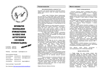 FORUM RODZICÓW Jaka szkoła dla dziecka z autyzmem? Cz.2. Ciąg dalszy cyklu artykułów dedykowany młodziutkim rodzicom, stającym przed wyborem szkoły dla swojego autystycznego dziecka. (LB) Numer zamknięto: 7 stycznia 2007 Jestem matką 12-letniego chłopca autystycznego. Gdy miał osiem lat i musiał podjąć naukę w klasie pierwszej, jak każdy rodzic miałam dylemat, do jakiej szkoły go zapisać. Tak się złożyło, że w tym czasie Damian był dość intensywnie prowadzony terapią behawioralną. Oczywistym było dla mnie, więc, że klasa integracyjna w szkole masowej będzie dla niego idealna. Niestety okazało się, że na terenie Dąbrowy Górniczej nie ma żadnej klasy integracyjnej, a w innych gminach nie ma wolnych miejsc. Damian zaczął uczęszczać do szkoły specjalnej w Sosnowcu, gdzie spotkałam się z brakiem zrozumienia wychowawcy i dyrekcji dla moich metod pracy z synem. W pewnym momencie byłam nawet zmuszona siedzieć w klasie, bo nauczyciel sobie nie radził. Nie polecam tego nikomu, gdyż ma to zły wpływ zarówno na matkę, jak i na dziecko. W drugiej klasie podjęłam decyzję i przeniosłam syna do szkoły specjalnej u nas, w Dąbrowie. Bałam się jak wpłyną na niego te zmiany, ale wiedziałam, że w tamtej szkole nic dobrego nas już nie spotka. Mój syn chodzi już czwarty rok do tej samej szkoły i mimo, że był kilka razy narażony na zmianę klasy lub nauczyciela, to jakoś przez to przebrnął. Najtrudniejszy jest dla niego ten rok tzn. czwarta klasa. Przechodzenie do różnych sal lekcyjnych i ciągle zmieniający się nauczyciele, a także materiał, który musi opanować, budzi u niego frustracje. Jeśli chodzi o naukę konkretnych przedmiotów, to program przyrody i historii nie jest dostosowany do możliwości dziecka autystycznego. Największy problem stanowią lekcje jęz. niemieckiego, które odbywają się dopiero na 7 godzinie lekcyjnej. Damian na tych lekcjach prezentuje cały repertuar zachowań, tj. śmiech, szczekanie, dotykanie i wychodzenie z ławki. Najgorsze jest to, że w szkole Damiana przywiązuje się dużą wagę do realizacji programu), a nie do korekcji zachowania czy do treningu samoobsługi, jak np. mycie rąk. Wychodzi to w domu, ponieważ syn nie wykonuje pewnych czynności prawidłowo. Jestem przekonana, że zarówno te dobre jak i te złe doświadczenia ze szkołą i nauczycielami czegoś mnie nauczyły. Wiem już, że nazwa szkoły nie jest ważna tylko osoby, które w niej pracują i ich zrozumienie dla potrzeb dzieci i wymagań rodziców. Myślę, że każda z nas ma szansę prędzej czy później spotkać takie osoby na swojej drodze, trzeba tylko w to mocno wierzyć. My w Internecie: http://www.autyzmirodzina.republika.pl/ Małgosia Głowacka, Dąbrowa Górnicza Redakcja Liliana Bujała [email protected] Dane kontaktowe Zarządu: Danuta Billewicz 032 255 29 25 [email protected] Alina Kolber 032 241 58 52 [email protected] Joanna Ligocka 032 243 91 70 Anna Bemben 032 241 45 06 [email protected] WARTO WIEDZIEĆ Autyzm i mutacje genetyczne Francuscy naukowcy odkryli u niewielkiej liczby dzieci z autyzmem mutacje genetyczne. Może to pomóc w ujawnieniu biologicznych podstaw choroby. U ponad 200 osób z zaburzeniami należącymi do spektrum autyzmu badacze sekwencjonowali gen oznaczany symbolem SHANK3. U członków 3 rodzin natrafili na mutacje w jego obrębie. Mutacja dotyczy jedynie niewielkiej liczby osób, ale rzuca to nieco światła na gen zaangażowany w zaburzenia ze spektrum autyzmu — napisał w artykule opublikowanym na łamach pisma Nature Genetics Thomas Bourgeron z Instytutu Pasteura w Paryżu. . ASD (ang. autism spectrum disorders) występują u 6 na 1000 dzieci. Nieprawidłowości chromosomalne odnotowuje się u 3-6% pacjentów. Zachowanie autystyczne i upośledzenie umysłowe często zauważa się przy zaburzeniach w budowie 22. chromosomu. To właśnie tutaj znajduje się gen SHANK3. We wszystkich trzech zidentyfikowanych francuskich rodzinach w opisywanym genie występowały różne mutacje. Dwóch braci miało niewielką delecję, u dziecka z innej rodziny natrafiono na poważniejszą jej postać. Delecja to jeden z typów spontanicznej mutacji genowej. Polega na utracie z DNA jednej lub kilku par nukleotydów. W ten sposób mogą znikać pojedyncze aminokwasy, ale i całe geny. W trzeciej rodzinie dziewczynka z delecją genu SHANK3 cierpiała na autyzm, podczas gdy jej brat z dodatkową jego kopią chorował na łagodniejszą postać zaburzeń ASD — zespół Aspergera. . Białko kodowane w SHANK3 oddziałuje z innymi białkami — neuroliginami. Neuroliginy są częściami synaps, odpowiadają za prawidłową komunikację między neuronami. Anna Błońska, źródło: Reuter; zaczerpnięto www.kopalniawiedzy.pl 06-12-2006 (Wyszukała DB) z: Agresja zwalczana dietą (…) Tłusty umysł. Na czym miałaby polegać dieta zmniejszająca agresję? Na bogactwie rybiego mięsa lub suplementów zawierających tłuszcz tych zwierząt. To główne źródło kwasów tłuszczowych omega-3, mających dobroczynny wpływ na zachowanie człowieka. Mózg w 60 proc. zbudowany jest z tłuszczów. Ważne dla jego funkcjonowania są zwłaszcza wchodzące w skład omega-3 tłuszcze długołańcuchowe, szczególnie kwas dokozaheksaenowy (DHA). Stanowi on ważny budulec błon komórkowych neuronów. Dzięki jego elastyczności łatwiej dochodzi do komunikowania się systemu nerwowego z komórkami. Kiedy w organizmie brakuje tłuszczów omega-3 lub są one zastępowane innymi, mechanizm szwankuje. Wzrasta nadwrażliwość i nadpobudliwość, co może prowadzić do zachowań agresywnych, a także nastrojów depresyjnych. Przekonują o tym badania profesora Josepha Hibbelna, prowadzone w ramach amerykańskiego Narodowego Instytutu Zdrowia Publicznego. Wzięło z nich udział 30 osób z wysokim poziomem agresji. Po podawaniu im suplementów omega-3, poziom ten zmniejszył się o jedną trzecią. Podobne wyniki prz