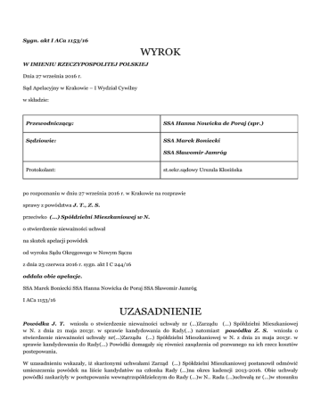 Sygn. akt I ACa 1153/16 WYROK W IMIENIU RZECZYPOSPOLITEJ POLSKIEJ Dnia 27 września 2016 r. Sąd Apelacyjny w Krakowie – I Wydział Cywilny w składzie: Przewodniczący: SSA Hanna Nowicka de Poraj (spr.) Sędziowie: SSA Marek Boniecki SSA Sławomir Jamróg Protokolant: st.sekr.sądowy Urszula Kłosińska po rozpoznaniu w dniu 27 września 2016 r. w Krakowie na rozprawie sprawy z powództwa J. T., Z. S. przeciwko (...) Spółdzielni Mieszkaniowej w N. o stwierdzenie nieważności uchwał na skutek apelacji powódek od wyroku Sądu Okręgowego w Nowym Sączu z dnia 23 czerwca 2016 r. sygn. akt I C 244/16 oddala obie apelacje. SSA Marek Boniecki SSA Hanna Nowicka de Poraj SSA Sławomir Jamróg I ACa 1153/16 UZASADNIENIE Powódka J. T. wniosła o stwierdzenie nieważności uchwały nr (...)Zarządu (...) Spółdzielni Mieszkaniowej w N. z dnia 21 maja 2013r. w sprawie kandydowania do Rady(...) natomiast powódka Z. S. wniosła o stwierdzenie nieważności uchwały nr(...)Zarządu (...) Spółdzielni Mieszkaniowej w N. z dnia 21 maja 2013r. w sprawie kandydowania do Rady(...) Powódki domagały się również zasądzenia od pozwanego na ich rzecz kosztów postepowania. W uzasadnieniu wskazały, iż skarżonymi uchwałami Zarząd (...) Spółdzielni Mieszkaniowej postanowił odmówić umieszczenia powódek na liście kandydatów na członka Rady (...)na okres kadencji 2013-2016. Obie uchwały powódki zaskarżyły w postępowaniu wewnątrzspółdzielczym do Rady (...)w N.. Rada (...)uchwałą nr (...)w stosunku do odwołania J. T. i uchwałą nr (...) w stosunku do odwołania Z. S. z dnia 4 czerwca 2013r. postanowiła nie uwzględnić odwołania i utrzymać w mocy zaskarżone uchwały. Zdaniem powódek zaskarżone uchwały są sprzeczne z prawem tj. z przepisem art.(...)prawa spółdzielczego, bowiem zarząd (...) Spółdzielni Mieszkaniowej w N. nie był upoważniony do podjęcia przedmiotowych uchwał, gdyż jest to materia zastrzeżona dla Walnego Zgromadzenia. Ponadto uchwały te są sprzeczne z przepisem przejściowym ustawy z dnia 14 czerwca 2007r. o zmianie ustawy o spółdzielniach mieszkaniowych oraz zmianie niektórych innych ustaw, które to przepisy wprowadziły wymogi, że nie mogą kandydować do rady nadzorczej osoby, które przez dwie kadencje były członkami rady, natomiast te przepisy stosuje się do rad nadzorczych powołanych po dniu wejścia w życie tych przepisów. Zdaniem powódek w 2013r. mogły kandydować do Rady (...)w N., bowiem kadencyjność należy liczyć od dnia wejścia w życie przepisów a te weszły w życie 31 lipca 2007r. Powódki podniosły, że ewentualne uwzględnienie przez sąd ich roszczenia otwiera drogę do dalszych roszczeń. Ponadto występowanie w obrocie prawnym tego rodzaju uchwał jak zaskarżone rodzi stan niepewności co do tego kto może kandydować i czy zarząd ma kompetencje do podejmowania w przyszłości tego rodzaju czynności. Powódki podały, że na chwilę obecną nie określiły się jeszcze czy będą kandydować do Rady (...)na okres kadencji 2016-2019. Pozwana (...) Spółdzielnia Mieszkaniowa w N. wniosła o oddalenie powództwa i zasądzenie kosztów zastępstwa procesu. W uzasadnieniu pozwana podniosła, że powódki nie wykazały interesu prawnego w żądaniu ustalenia nieważności uchwał podjętych przez zarząd(...)w N. w maju 2013r. Zarzuciła też, że zarząd (...) prawidłowo, tj. zgodnie z obowiązującym statutem, podjął uchwałę w sprawie odmowy umieszczenia powódek na liście kandydatów na Członka Rady (...)na okres kadencji 2013-2016. Zdaniem pozwanego to zarząd jest organem, który weryfikuje zgłoszonych kandydatów, wszystkie wnioski i dokumenty i zarząd przekazuje Walnemu Zgromadzeniu projekt uchwały w sprawie wyboru członka rady (...) Wyrokiem z dnia 23 czerwca 2016 r, sygn. IC 244/16, Sąd Okręgowy w Nowym Sączu oddalił powództwo i zasądził od każdej z powódek na rzecz pozwanej koszty procesu w kwotach po 188,50 zł. W uzasadnieniu Sąd Okręgowy ustalił, że uchwałą Nr 361/13 uzupełnioną uchwałą Nr (...)z dnia 23 maja 2013r. Zarząd (...) Spółdzielni Mieszkaniowej w N. działając na podstawie §(...) Statutu (...) Spółdzielni Mieszkaniowej w N. postanowił odmówić umieszczenia powódki J. T. na liście kandydatów na Członka Rady(...)na okres kadencji 2013-2016. W uzasadnieniu uchwały zarząd powołując się na § (...)Statutu (...) podniósł, że członek Rady (...)sprawujący funkcje członka Rady (...) przez ostanie kolejne dwie kadencje nie może nie tylko być wybieranym, ale również nie może kandydować, a zatem nie może być umieszczony na liście kandydatów, mimo spełnienia innych wymogów statutowych. Powódka J. T. odwołała się od tych uchwał Zarządu do Rady (...) (...) Spółdzielni Mieszkaniowej w N.. Uchwałą Nr (...)z dnia 4 czerwca 2013r. Rada (...)w N. postanowiła w głosowaniu tajnym 9 głosów - za, nie uwzględnić odwołania powódki J. T. i utrzymać w mocy zaskarżone uchwały. Uchwałą Nr (...)uzupełnioną uchwałą Nr (...)z dnia 23 maja 2013r. Zarząd (...) Spółdzielni Mieszkaniowej w N. działając na podstawie §(...)Statutu (...) Spółdzielni Mieszkaniowej w N. postanowił odmówić umieszczenia powódki Z. S. na liście kandydatów na Członka Rady(...)na okres kadencji 2013-2016. W uzasadnieniu uchwały zarząd powołując się na § (...) podniósł, że członek Rady(...)sprawujący funkcje członka Rady (...) przez ostanie kolejne dwie kadencje nie może nie tylko być wybieranym, ale również nie może kandydować, a zatem nie może być umieszczony na liście kandydatów, mimo spełnienia innych wymogów statutowych. Powódka Z. S. odwołała się od tych uchwał Zarządu do Rady (...) (...) Spółdzielni Mieszkaniowej w N.. Uchwałą Nr (...)z dnia 4 czerwca 2013r. Rada (...)w N. postanowiła w głosowaniu tajnym 9 głosów - za, nie uwzględnić odwołania powódki Z. S. i utrzymać w mocy zaskarżone uchwa