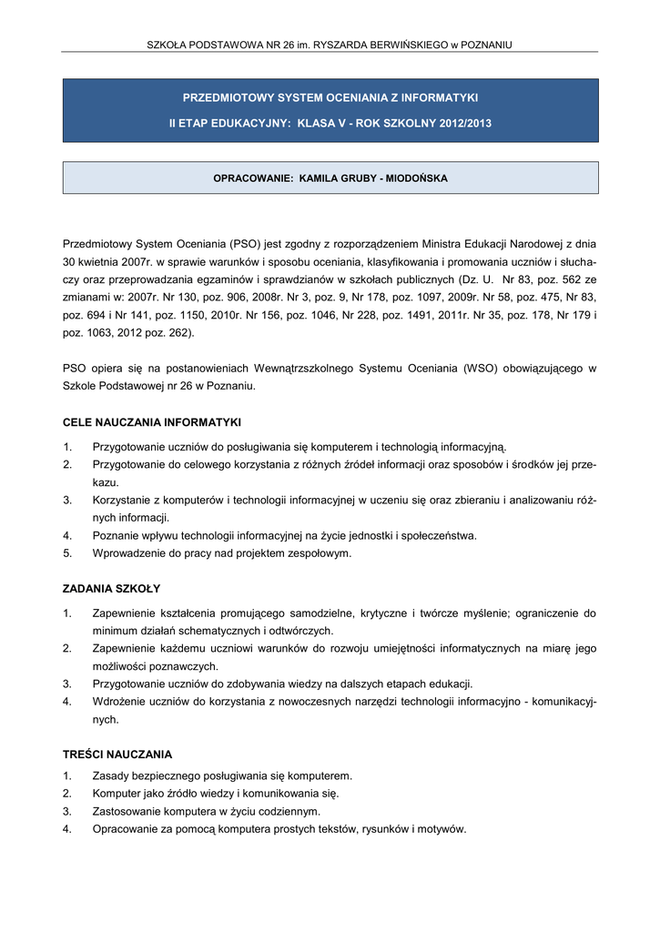 SZKOŁA PODSTAWOWA NR 26 im. RYSZARDA BERWIŃSKIEGO w POZNANIU PRZEDMIOTOWY SYSTEM OCENIANIA Z INFORMATYKI II ETAP EDUKACYJNY: KLASA V - ROK SZKOLNY 2012/2013 OPRACOWANIE: KAMILA GRUBY - MIODOŃSKA Przedmiotowy System Oceniania (PSO) jest zgodny z rozporządzeniem Ministra Edukacji Narodowej z dnia 30 kwietnia 2007r. w sprawie warunków i sposobu oceniania, klasyfikowania i promowania uczniów i słuchaczy oraz przeprowadzania egzaminów i sprawdzianów w szkołach publicznych (Dz. U. Nr 83, poz. 562 ze zmianami w: 2007r. Nr 130, poz. 906, 2008r. Nr 3, poz. 9, Nr 178, poz. 1097, 2009r. Nr 58, poz. 475, Nr 83, poz. 694 i Nr 141, poz. 1150, 2010r. Nr 156, poz. 1046, Nr 228, poz. 1491, 2011r. Nr 35, poz. 178, Nr 179 i poz. 1063, 2012 poz. 262). PSO opiera się na postanowieniach Wewnątrzszkolnego Systemu Oceniania (WSO) obowiązującego w Szkole Podstawowej nr 26 w Poznaniu. CELE NAUCZANIA INFORMATYKI 1. Przygotowanie uczniów do posługiwania się komputerem i technologią informacyjną. 2. Przygotowanie do celowego korzystania z różnych źródeł informacji oraz sposobów i środków jej przekazu. 3. Korzystanie z komputerów i technologii informacyjnej w uczeniu się oraz zbieraniu i analizowaniu różnych informacji. 4. Poznanie wpływu technologii informacyjnej na życie jednostki i społeczeństwa. 5. Wprowadzenie do pracy nad projektem zespołowym. ZADANIA SZKOŁY 1. Zapewnienie kształcenia promującego samodzielne, krytyczne i twórcze myślenie; ograniczenie do minimum działań schematycznych i odtwórczych. 2. Zapewnienie każdemu uczniowi warunków do rozwoju umiejętności informatycznych na miarę jego możliwości poznawczych. 3. Przygotowanie uczniów do zdobywania wiedzy na dalszych etapach edukacji. 4. Wdrożenie uczniów do korzystania z nowoczesnych narzędzi technologii informacyjno - komunikacyjnych. TREŚCI NAUCZANIA 1. Zasady bezpiecznego posługiwania się komputerem. 2. Komputer jako źródło wiedzy i komunikowania się. 3. Zastosowanie komputera w życiu codziennym. 4. Opracowanie za pomocą komputera prostych tekstów, rysunków i motywów. SZKOŁA PODSTAWOWA NR 26 im. RYSZARDA BERWIŃSKIEGO w POZNANIU 5. Korzystanie z elementarnych zastosowań komputerów do wzbogacania własnego uczenia się i poznania różnych dziedzin wiedzy. 6. Poznanie zastosowań komputerów i opartych na technice komputerowej urządzeń spotykanych przez ucznia w miejscach publicznych. OSIĄGNIĘCIA 1. Bezpieczne posługiwanie się komputerem w przystosowanym dla ucznia środowisku sprzętowym i programistycznym. 2. Sprawne tworzenie tekstów, rysunków, motywów. 3. Wykonywanie prostych obliczeń przy pomocy komputera. 4. Korzystanie z różnorodnych źródeł i sposobów zdobywania informacji oraz jej przedstawiania i wykorzystania. 5. Stosowanie komputerów do wzbogacania własnego uczenia się i poznawania różnych dziedzin. 6. Korzystanie z technologii informacyjnej do komunikowania się. 7. Współpraca w grupie i podejmowanie prostych decyzji przy realizacji własnego projektu. ZASADY OCENIANIA UCZNIÓW NA LEKCJACH INFORMATYKI 1. Do 15 września każdego roku szkolnego uczniowie i ich prawni opiekunowie zostają zapoznani z wymaganiami edukacyjnymi niezbędnymi do uzyskania poszczególnych ocen bieżących, śródrocznych i rocznych ocen klasyfikacyjnych, ze sposobami sprawdzania osiągnięć edukacyjnych oraz warunkami i trybie uzyskania wyższej niż przewidywana rocznej oceny klasyfikacyjnej z zajęć edukacyjnych. Fakt ten jest odnotowywany w dzienniku lekcyjnym i zeszycie przedmiotowym ucznia, a następnie potwierdzony podpisami uczniów i rodziców. 2. Ocena umiejętności i wiadomości edukacyjnych uczniów dokonywana jest systematycznie i sprawiedliwie (wg podanych kryteriów). 3. Obszary aktywności ucznia będące przedmiotem oceny: 1) posługiwanie się terminologią informatyczną, 2) przygotowanie stanowiska komputerowego do pracy według zasad bezpieczeństwa i higieny pracy, 3) organizacja pracy, 4) praca z programem – stosowanie odpowiednich metod, sposobów wykonania i osiąganie przewidzianych rezultatów, 5) rozwiązywanie problemów – dobór właściwego narzędzia oraz dostosowanie środowiska programu do rozwiązywanego zadania, 4. 6) stosowanie wiedzy przedmiotowej w sytuacjach praktycznych, 7) aktywność na lekcjach, 8) współpraca w grupie, 9) wkład pracy ucznia, 10) stopień i rodzaj motywacji uczenia się. Formy sprawdzania osiągnięć uczniów: 1) prace pisemne (całogodzinne, kartkówki), SZKOŁA PODSTAWOWA NR 26 im. RYSZARDA BERWIŃSKIEGO w POZNANIU 5. 2) odpowiedzi ustne, 3) aktywność i praca praktyczna na lekcji, 4) zeszyty, 5) praca z książką, materiałem dydaktycznym, 6) przygotowanie do lekcji, 7) prace dodatkowe, 8) osiągnięcia w konkursach szkolnych i pozaszkolnych. Całogodzinne prace pisemne: 1) są obowiązkowe, 2) zapowiadane z tygodniowym wyprzedzeniem, 3) poprzedzone lekcją powtórzeniową, 4) można poprawiać ocenę niedostateczną lub dopuszczającą w terminie uzgodnionym z nauczycielem, ale nie później niż tydzień od uzyskania oceny, 5) w przypadku nieobecności: a) jednodniowej – uczeń pisze pracę na następnej lekcji, b) więcej niż jeden dzień – w terminie uzgodnionym z nauczycielem. 6. Kartkówki nie są zapowiadane i obejmują wiadomości oraz umiejętności z ostatniej jednostki tematycznej. 7. Sprawdzone i ocenione prace pisemne uczeń otrzymuje do wglądu w dniu otrzymania oceny, a prawni opiekunowie podczas comiesięcznych spotkań z nauczycielem. 8. Zeszyty są sprawdzane na bieżąco. 9. Za aktywną postawę na zajęciach uczeń może uzyskać znak „+”. Trzykrotne uzyskanie znaku „+” równoznaczne jest z uzyskaniem oceny bardzo dobrej. 10. Za nieprzygotowanie się do zajęć (brak zadania domowego, przyborów geometrycznych) i brak aktywności na lekcjach, uczeń uzyskuje znak „-”. Trzykrotne uzyskanie znaku „-” równoznaczne jest z uzyskaniem oceny niedostatecznej. 11. Ka