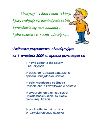 Wszyscy – i duzi i mali-lubimy, kiedy traktuje się nas indywidualnie i przydziela się nam zadania , które jesteśmy w stanie udźwignąć. Podstawa programowa obowiązująca od 1 września 2009 w klasach pierwszych to:  nowe zadania dla szkoły i nauczyciela  treści do realizacji zastąpiono opisem umiejętności ucznia  cele kształcenia ogólnego uzupełniono o kształtowanie postaw  wyodrębnienie umiejętności i wiadomości ucznia po klasie pierwszej i trzeciej  podkreślenie roli rodzica w rozwoju każdego dziecka Program „Szkoła na miarę” zapewnia: • pracę na miarę możliwości i potrzeb każdego dziecka – wspieranie rozwoju, rozwijanie zainteresowań • naukę przez działanie obserwację doświadczanie i zabawę • kształtowanie umiejętności prawidłowego i aktywnego funkcjonowania w społeczeństwie RODZICE NAUCZYCIEL UCZEŃ Raz, dwa, trzy, teraz my to podręczniki dla sześcioletniego ucznia klasy 1 w roku szkolnym 2010/2011 Jest to pakiet umożliwiający indywidualne podejście do dzieci. Wydłużony okres wprowadzania liter i cyfr pozwoli na skuteczne doskonalenie wymaganych umiejętności, a zróżnicowany stopień trudności zadań na efektywną pracę z każdym uczniem. Pakiet Nowe Raz, dwa, trzy, teraz my!  Podręcznik z płytą CD-ROM, semestr 1 i 2  Ćwiczenia część 1, 2, 3, 4  Matematyka część 1, 2 Wycinanka część 1, 2 plus zeszyt do kaligrafii oraz Zajęcia Komputerowe - Podręcznik z ćwiczeniami Lekki tornister ,, Uczeń powinien mieć możliwość pozostawienia w szkole podręcznika” – podstawa programowa podręczników 23 grudnia 2008r. W ramach akcji Lekki tornister nasi uczniowie mają do dyspozycji szafki, w których mogą pozostawiać podręczniki szkolne. Dodatkowo dla uczniów rozpoczynających naukę w klasie 1 w roku szkolnym 2010/2011 szkoła zakupi komplet podręczników klasowych – czyli zestaw podręczników dla każdego ucznia, który będzie wykorzystywany podczas zajęć i pozostawiany w klasie. Akcja, w której bierzemy udział pozwala uniknąć niepotrzebnego dźwigania przez dzieci podręczników, odciąży ich tornistry i ochroni kręgosłupy.