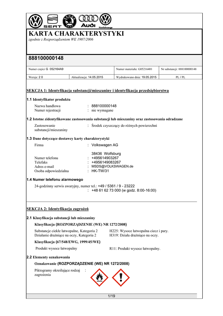 KARTA CHARAKTERYSTYKI zgodnie z Rozporządzeniem WE 1907/2006 888100000148 Numer części G 052164A9 Wersja: 2 0 Numer materiału: G05216401 Aktualizacja: 14.05.2015 Nr substancji: 888100000148 Wydrukowano dnia: 19.05.2015 PL / PL SEKCJA 1: Identyfikacja substancji/mieszaniny i identyfikacja przedsiębiorstwa 1.1 Identyfikator produktu Nazwa handlowa Numer rejestracji : 888100000148 : nie wymagane 1.2 Istotne zidentyfikowane zastosowania substancji lub mieszaniny oraz zastosowania odradzane Zastosowanie substancji/mieszaniny : Środek czyszczący do różnych powierzchni 1.3 Dane dotyczące dostawcy karty charakterystyki Firma : Volkswagen AG Numer telefonu Telefaks Adres e-mail Osoba odpowiedzialna : : : : 38436 Wolfsburg +495614903267 +4956149083267 [email protected] HK-TW/31 1.4 Numer telefonu alarmowego 24-godzinny serwis awaryjny, numer tel.: +49 / 5361 / 9 - 23222 : +48 61 62 73 000 (w godz. 8:00-16:00) SEKCJA 2: Identyfikacja zagrożeń 2.1 Klasyfikacja substancji lub mieszaniny Klasyfikacja (ROZPORZĄDZENIE (WE) NR 1272/2008) Substancje ciekłe łatwopalne, Kategoria 2 Działanie drażniące na oczy, Kategoria 2 H225: Wysoce łatwopalna ciecz i pary. H319: Działa drażniąco na oczy. Klasyfikacja (67/548/EWG, 1999/45/WE) Produkt wysoce łatwopalny R11: Produkt wysoce łatwopalny. 2.2 Elementy oznakowania Oznakowanie (ROZPORZĄDZENIE (WE) NR 1272/2008) Piktogramy określające rodzaj zagrożenia : 1/19 KARTA CHARAKTERYSTYKI zgodnie z Rozporządzeniem WE 1907/2006 888100000148 Numer części G 052164A9 Wersja: 2 0 Numer materiału: G05216401 Aktualizacja: 14.05.2015 Nr substancji: 888100000148 Wydrukowano dnia: 19.05.2015 Hasło ostrzegawcze : Niebezpieczeństwo Zwroty wskazujące rodzaj zagrożenia : H225 H319 Wysoce łatwopalna ciecz i pary. Działa drażniąco na oczy. Zwroty wskazujące środki ostrożności : P102 Zapobieganie: P210 Chronić przed dziećmi. P243 P233 Magazynowanie: P403 + P235 Usuwanie: P501 PL / PL Przechowywać z dala od źródeł ciepła, gorących powierzchni, iskrzenia, otwartego ognia i innych źródeł zapłonu. Palenie wzbronione. Przedsięwziąć środki ostrożności zapobiegające statycznemu rozładowaniu. Przechowywać pojemnik szczelnie zamknięty. Przechowywać w dobrze wentylowanym miejscu. Przechowywać w chłodnym miejscu. Zawartość/ pojemnik usuwać do autoryzowanego zakładu utylizacji odpadów. Dodatkowe oznakowanie: Wyczuwalne dotykiem ostrzeżenie o niebezpieczeństwie (EN/ISO 11683) 2.3 Inne zagrożenia Brak dostępnych danych SEKCJA 3: Skład/informacja o składnikach 3.2 Mieszaniny Typ związku : Roztwór alkoholowy Środki powierzchniowo czynne Składniki niebezpieczne Nazwa Chemiczna alkohol etylowy Nr CAS Nr WE Numer rejestracji 64-17-5 Klasyfikacja (67/548/EWG) F; R11 2/19 Klasyfikacja (1272/2008/WE) Flam. Liq. 2; H225 Eye Irrit. 2; H319 Stężenie [%] >= 80 - < 85 KARTA CHARAKTERYSTYKI zgodnie z Rozporządzeniem WE 1907/2006 888100000148 Numer części G 052164A9 Wersja: 2 0 Numer materiału: G05216401 Aktualizacja: 14.05.2015 etano-1,2-diol Nr substancji: 888100000148 Wydrukowano dnia: 19.05.2015 012119457610-43 107-21-1 Xn; R22 Acute Tox. 4; H302 STOT RE 2; H373 PL / PL >= 5 - < 7 012119456816-28 Pełen tekst zwrotów R zawartych w tej sekcji umieszczono w sekcji 16. Pełny tekst zwrotów H przytoczonych w tej Sekcji znajduje się w Sekcji 16. SEKCJA 4: Środki pierwszej pomocy 4.1 Opis środków pierwszej pomocy Porady ogólne : W razie wypadku lub złego samopoczucia zasięgnąć natychmiast porady lekarza (w miarę możliwości pokazać etykietę). Nieprzytomnej osobie nigdy nie podawać nic doustnie. Wynieść poszkodowanego z miejsca zagrożenia, zapewnić spokój. Natychmiast zdjąć skażone ubranie. W przypadku wdychania : Wynieść na świeże powietrze. Zapewnić poszkodowanemu ciepło i spokój. Jeśli objawy utrzymują się, wezwać lekarza. W przypadku kontaktu ze skórą : Zmyć dużą ilością wody. Jeśli objawy utrzymują się, wezwać lekarza. W przypadku kontaktu z oczami : Usunąć szkła (szkło) kontaktowe. W przypadku kontaktu produktu z oczami niezwłocznie przemyć je dużą ilością wody i zasięgnąć pomocy lekarskiej. W przypadku połknięcia : Jeśli wymiotujący leży na plecach, ułożyć go twarzą w dół. W razie połknięcia niezwłocznie zasięgnij porady lekarza - pokaż opakowanie lub etykietę. NIE prowokować wymiotów. Natychmiast podać dużą ilość wody do wypicia. 4.2 Najważniejsze ostre i opóźnione objawy oraz skutki narażenia Brak dostępnych danych 4.3 Wskazania dotyczące wszelkiej natychmiastowej pomocy lekarskiej i szczególnego postępowania z poszkodowanym Brak dostępnych danych 3/19 KARTA CHARAKTERYSTYKI zgodnie z Rozporządzeniem WE 1907/2006 888100000148 Numer części G 052164A9 Wersja: 2 0 Numer materiału: G05216401 Aktualizacja: 14.05.2015 Nr substancji: 888100000148 Wydrukowano dnia: 19.05.2015 PL / PL SEKCJA 5: Postępowanie w przypadku pożaru 5.1 Środki gaśnicze Odpowiednie środki gaśnicze : Dwutlenek węgla (CO2), Suche proszki gaśnicze, Strumień rozpylonej wody 5.2 Szczególne zagrożenia związane z substancją lub mieszaniną Specyficzne zagrożenia w czasie zwalczania pożaru : Chłodzić zamknięte zbiorniki narażone na ogień poprzez zraszanie wodą. Ogień wytwarza gęsty, czarny dym zawierający niebezpieczne produkty spalania (zobacz dział 10). Pojemnik może ulec rozerwaniu przy ogrzewaniu. 5.3 Informacje dla straży pożarnej Specjalny sprzęt ochronny dla strażaków : Użyć środków ochrony osobistej. SEKCJA 6: Postępowanie w przypadku niezamierzonego uwolnienia do środowiska 6.1 Indywidualne środki ostrożności, wyposażenie ochronne i procedury w sytuacjach awaryjnych Nie dopuścić do zbierania się oparów w ilościach mogących tworzyć stężenia wybuchowe. Opary mogą gromadzić się w nisko położonych przestrzeniach. 6.2 Środki ostrożności w zakresie ochrony środowiska Zapobiegać dalszemu wyciekowi lub rozlaniu