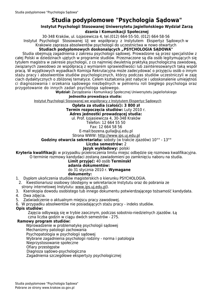 Studia podyplomowe "Psychologia Sądowa" Studia podyplomowe "Psychologia Sądowa" Instytut Psychologii Stosowanej Uniwersytetu Jagiellońskiego Wydział Zarzą dzania i Komunikacji Społecznej 30-348 Kraków, ul. Łojasiewicza 4, tel.(012) 664-55-50, (012) 664-58-56 Instytut Psychologii Stosowanej UJ we współpracy z Instytutem Ekspertyz Sądowych w Krakowie zaprasza absolwentów psychologii do uczestnictwa w nowo otwartych Studiach podyplomowych doskonalących „PSYCHOLOGIA SĄDOWA" Studia obejmują zagadnienia z zakresu psychologii sądowej. Prowadzone są przez specjalistów z całej Polski w dziedzinach ujętych w programie studiów. Przeznaczone są dla osób legitymujących się tytułem magistra w zakresie psychologii, z co najmniej dwuletnią praktyką psychologiczną zawodową, związanych zawodowo ze współpracą z wymiarem sprawiedliwości lub zainteresowanych taką współ pracą. W wyjątkowych wypadkach Komisja Rekrutacyjna może zadecydować o przyjęciu osób o innym stażu pracy i absolwentów studiów psychologicznych, którzy podczas studiów uczestniczyli w zaję ciach dydaktycznych o zbliżonej tematyce. Celem kształcenia jest nabycie i udoskonalenie umiejętnoś ci diagnozowania i orzekania sądowego niezbędnych w pełnieniu roli biegłego psychologa oraz przygotowanie do innych zadań psychologa sądowego. Wydział: Zarządzania i Komunikacji Społecznej Uniwersytetu Jagiellońskiego Jednostka prowadząca studia: Instytut Psychologii Stosowanej we współpracy z Instytutem Ekspertyz Sądowych Opłata za studia (całość): 3 800 zł Termin rozpoczęcia studiów: Luty 2010 r. Adres jednostki prowadzącej studia: ul. Prof. Łojasiewicza 4, 30-348 Kraków Telefon: 12 664 55 50 Fax: 12 664 58 56 E-mail:[email protected] Strona WWW: http://www.ips.uj.edu.pl Godziny otwarcia sekretariatu: soboty (w trakcie zjazdów) 10°° - 13°° Liczba semestrów: 2 Język wykładowy: polski Kryteria kwalifikacji: w przypadku przekroczenia limitu miejsc odbędzie się rozmowa kwalifikacyjna. O terminie rozmowy kandydaci zostaną zawiadomieni po zamknięciu naboru na studia. Limit przyjęć: 40 osób Terminskł adania dokumentów: do 31 stycznia 2010 r. Wymagane dokumenty: 1. Dyplom ukończenia studiów magisterskich o kierunku PSYCHOLOGIA. 2. Kwestionariusz osobowy (dostępny w sekretariacie Instytutu oraz do pobrania ze strony internetowej Instytutu: www.ips.uj.edu.pl). 3. Kserokopia dowodu osobistego tub innego dokumentu potwierdzającego tożsamość kandydata. 4. Dwa zdjęcia. 5. Zaświadczenie o aktualnym miejscu pracy zawodowej. 6. W przypadku absolwentów nie posiadających stażu pracy - indeks studiów. Opis studiów: Zajęcia odbywają się w trybie zaocznym, podczas sobotnio-niedzielnych zjazdów. Łą czna liczba godzin w ciągu dwóch semestrów - 275. Ramowy program studiów: Wprowadzenie w problematykę psychologii sądowej Mechanizmy patologii zachowania Psychopatologia w psychologii sądowej Wybrane zagadnienia psychologii rodziny - norma i patologia Nieprzystosowanie społeczne Ofiary przestępstw Diagnoza sądowo-psychologiczna Zagadnienia szczegółowe ekspertyzy psychologicznej Studia podyplomowe "Psychologia Sądowa" Pobrane ze strony www.krakow.so.gov.pl Studia podyplomowe "Psychologia Sądowa" Udostępnił: 2009-11-03 08:58:16 Data wygaśnięcia: 2010-11-03 Studia podyplomowe "Psychologia Sądowa" Pobrane ze strony www.krakow.so.gov.pl