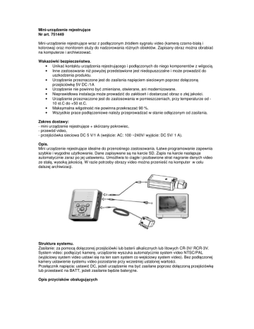 Mini-urządzenie rejestrujące Nr art. 751449 Mini-urządzenie rejestrujące wraz z podłączonym źródłem sygnału video (kamerą czarno-białą i kolorową) oraz monitorem służy do nadzorowania różnych obiektów. Zapisany obraz można obrabiać na komputerze i archiwizować. Wskazówki bezpieczeństwa. • Unikać kontaktu urządzenia rejestrującego i podłączonych do niego komponentów z wilgocią. • Inne zastosowanie niż powyżej przedstawione jest niedopuszczalne i może prowadzić do uszkodzenia produktu. • Urządzenie przeznaczone jest do zasilania napięciem sieciowym poprzez dołączoną przejściówkę 5V DC /1A • Urządzenie nie powinno być zmieniane, otwierane, ani modernizowane. • Nieprawidłowa instalacja może prowadzić do zakłóceń i dostarczać obraz o złej jakości. • Urządzenie przeznaczone jest do zastosowania w pomieszczeniach, przy temperaturze od 10 st.C do +50 st.C. • Maksymalna wilgotność nie powinna przekraczać 90 %. • Wszystkie prace podłączeniowe należy przeprowadzać w stanie odłączonym od zasilania. Zakres dostawy: - mini urządzenie rejestrujące + skórzany pokrowiec, - przewód video, - przejściówka sieciowa DC 5 V/1 A (wejście: AC: 100 ~240V/ wyjście: DC 5V/ 1 A). Opis. Mini urządzenie rejestrujące idealne do przenośnego zastosowania. Łatwe programowanie zapewnia szybkie i wygodne użytkowanie. Dane zapisywane są na karcie SD. Zapis na karcie następuje automatycznie zaraz po jej ustawieniu. Umożliwia to ciągłe i pozbawione strat nagranie danych video ze stałą, wysoką jakością. W razie potrzeby obrazy video można przenieść na komputer w celu dalszej archiwizacji. Struktura systemu. Zasilanie: za pomocą dołączonej przejściówki lub baterii alkalicznych lub litowych CR-3V/ RCR-3V. System video: podłączyć kamerę, urządzenie wyszuka automatycznie system video NTSC/PAL (wyjściowy system video ustawi się na ten sam system co wejściowy system video). Bez podłączonej kamery ustawienie systemu video pozostanie przy wcześniej ustalonej wartości. Przełącznik napięcia: ustawić DC, jeżeli urządzenie ma być zasilane poprzez dołączoną przejściówkę lub przestawić na BATT, jeżeli zasilanie będzie bateryjne. Opis przycisków obsługujących (1) Power LED - wskaźnik zasilania. (2) Play LED – wskaźnik odtwarzania. (3) Menu/ Lock LED – wskaźnik menu (4) Rec LED – wskaźnik nagrania (5) Przycisk Stop/Exit – nacisnąć, aby zatrzymać nagranie/ odtwarzanie lub wyście z menu (6) Przycisk Rec – nacisnąć, aby rozpocząć manualne nagranie (7 i 8) Przycisk w dół/ w górę – nacisnąć, aby wybrać określony punkt menu (9 i10) Przycisk w lewo/ w prawo – nacisnąć, aby szybko przewinąć do przodu lub do tyłu (11) Przycisk wprowadzenia (Enter) – nacisnąć, aby potwierdzić wybór lub ustawienie (12) Przycisk wyświetlacza – nacisnąć, aby aktywować/ dezaktywować informacje statusu (13) Przycisk Play/ Pause – odtwarzanie/ pauza (14) Przycisk Menu – nacisnąć, aby przejść do menu urządzenia Podłączenia Kamera (15) (16) (17) (18) (19) (20) V IN: wejście video VC OUT: wyjście video POWER: przełącznik DC/baterie DC 5V IN: wejście napięcia 5V/ 1 A Gniazdo dla karty SD Pokrywa pojemnika baterii Wejście video Uruchomienie urządzenia rejestrującego Krok 1: Przełącznik POWER znajduje się z prawej strony urządzenia. Ustawić przełącznik na DC, jeżeli urządzenie będzie zasilane poprzez przejściówkę 5 V lub na BATT, przy zasilaniu bateryjnym. Krok 2: Po włączeniu system uruchomi bezpośrednio tryb Live. Jeżeli wcześniej zaprogramowane zostało nagranie rozpoczynające się o określonej godzinnie, system przejdzie automatycznie do tego trybu i nagranie rozpocznie się według planu. Krok 3: Umieści kartę SD prawidłowo w gnieździe. Krok 4: Karta SD zostanie sprawdzona i po ok. 3 sek. pasek statusu zostanie wskazany na wyświetlaczu. Krok 5: symbol ten na pasku statusu oznacza, że karta została rozpoznana i funkcjonuje prawidłowo. symbol ten na pasku statusu oznacza, że karta została włożona nieprawidłowo lub nie Krok 6: funkcjonuje prawidłowo. Uwaga: Jeżeli karta została włożona nieprawidłowo lub nie funkcjonuje prawidłowo, funkcję nagrania i odtwarzania nie będą działały, a odpowiednie diody LED nie będą aktywne. Zaprogramowanie urządzenia rejestrującego Aby przejść do menu programowania, urządzenie powinno znajdować się w trybie czuwania (powinna świecić się tylko dioda POWER). Krok 1: Nacisnąć przycisk Stop (5), aby zakończyć wcześniej aktywne funkcje. Krok 2: Nacisnąć przycisk Menu (14), aby przejść do menu programowania. Dioda Menu LED zapali się. Przyciskami w górę (7) i w dół (8) zmienić pozycję kursora. Przyciskami w lewo (9) i w prawo (10) zmienić wartość wybranej pozycji. Menu główne Menu główne dysponuje następującymi opcjami: Za pomocą przycisków kierunkowych (7,8,9,10) można wybrać odpowiedni punkt menu. Aby potwierdzić wybór, należy nacisnąć przycisk wprowadzania (Enter)(11). Za pomocą przycisków kierunkowych (9) i (10) zmienić wartość i potwierdzić przyciskiem wprowadzania (11). Nacisnąć przycisk Stop, aby opuścić menu. Tryb odtwarzania Aby aktywować odtwarzanie, urządzenie powinno znajdować się w trybie czuwania. Wcześniej należy zakończyć wszystkie nagrania (powinna świecić się jedynie zielona dioda LED POWER). W trybie tym można wybrać pomiędzy odtwarzaniem normalnym i wyszukaniem konkretnej sceny. W tym celu należy: Normalne odtwarzanie Nacisnąć przycisk odtwarzania Play/Pause (13), aby rozpocząć normalne odtwarzanie. Wszystkie zachowane nagrania zostaną odtworzone. • • normalna prędkość odtwarzania, nacisnąć przyciski kierunkowe REW (9) lub FWD (10), aby zmienić prędkość odtwarzania. Nacisnąć ponownie przycisk Play/Pause, aby zmienić na normalną prędkość odtwarzania. • • podczas odtwarzania nacisnąć