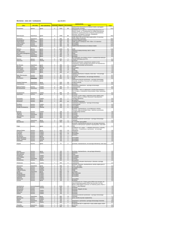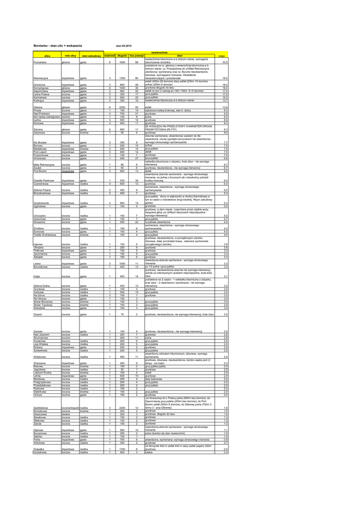 Borówiec - stan ulic + wskazania ulica rola ulicy stan 05.2015 stan zabudowy ważność długość licz posesji Poznańska główna gęsta 6 1600 88 Rekreacyjna dojazdowa gęsta 3 1300 80 Graniczna Kempingowa Zapomniana Leśna Polana Karmelowa Kwitnąca dojazdowa główna dojazdowa boczna boczna dojazdowa gęsta gęsta gęsta gęsta gęsta gęsta 3 6 3 3 3 3 800 1000 950 300 500 350 48 30 55 17 25 16 6 1 3 1 3 3 2200 150 700 100 500 400 50 14 21 9 14 11 Główna główna gęsta Prosta boczna gęsta Nad Potokiem dojazdowa gęsta bez nazwy szeregowce zboczna adresem ul Główna gęsta49 Ładna dojazdowa gęsta Klonowa dojazdowa gęsta Szkolna Jeżynowa główna boczna gęsta średnia 6 1 800 50 11 4 Na Skarpie Borowa Maślakowa Pod Lasem Poziomkowa Wrzosowa dojazdowa boczna dojazdowa dojazdowa boczna boczna gęsta gęsta średnia gęsta gęsta gęsta 3 1 3 3 1 1 350 200 400 600 100 400 9 15 10 14 7 27 Mała Rekreacyjna Zaułek Pod Borem boczna boczna dojazdowa gęsta gęsta gęsta 1 1 3 90 90 600 6 6 13 Osiedle Piaskowe Czereśniowa dojazdowa dojazdowa gęsta rzadka 1 3 530 600 34 12 Zielona Polana Brzoskwiniowa boczna dojazdowa rzadka rzadka 3 3 450 400 9 7 Grzybobranie Ogrodowa dojazdowa boczna rzadka gęsta 3 1 800 100 14 5 Uroczysko Jesionowa Wiosenna boczna boczna boczna rzadka gęsta gęsta 1 1 1 140 150 500 7 7 22 Źrodlana Sosnowa Teofila Wolniewicza boczna boczna boczna rzadka gęsta średnia 1 1 1 140 100 100 6 4 4 Łąkowa Okrężna Fiołkowa Jęczmienna Zakątek boczna boczna dojazdowa boczna boczna rzadka gęsta gęsta gęsta gęsta 1 1 1 1 1 130 250 150 150 150 5 9 5 5 5 Leśna Borowikowa dojazdowa boczna gęsta rzadka 3 1 1000 400 11 13 Kręta boczna gęsta 1 450 14 Zielona Dolina Gruntowa Kurkowa Na Górce Na Uboczu Skwer Brzozowy Skwer Topolowy Wierzbina boczna boczna boczna boczna boczna boczna boczna boczna gęsta rzadka rzadka rzadka gęsta średnia średnia gęsta 1 1 1 3 1 1 1 1 430 100 500 100 100 100 100 100 13 3 15 1 3 3 3 3 Dojazd boczna gęsta 1 70 Zacisze Nad Jeziorem Strumykowa Kozakowa Lisa Witalisa Różana Żurawinowa boczna boczna boczna boczna boczna dojazdowa boczna gęsta rzadka rzadka rzadka gęsta rzadka 1 1 1 1 1 1 1 Widokowa boczna rzadka Warzywna Bukowa Jagodowa Labirynt Wodny Letnia Morelowa Podgrzybkowa Prawdziwkowa Rydzowa Świerkowa Urocza dojazdowa boczna boczna boczna dojazdowa boczna boczna boczna boczna boczna boczna gęsta średnia rzadka średnia gęsta rzadka rzadka rzadka rzadka średnia gęsta Spółdzielcza Borówkowa Deszczowa Słowikowa Śliwkowa Zakole Dębowa Buczynowa Zielona Polna Wiśniowa Drapałka Gruszkowa nawierzchnia stan nawierzchnia bitumiczna w b.dobrym stanie, wymagane dokończenie chodnika podzielona na cz. główną z nawierzchnią bitumiczną w b. dobrym stanie, cz. Przejazdową do ul.Mała Rekreacyjna utwrdzoną i wyrównaną oraz cz. Boczne nieutwardzone, dziurawe, wymagaace równania. Oświetlenie niewystarczające i przestarzałe asfalt (400m 26 domów) stary asfalt (200m 16 domów) pofrez (200m 6 domów) gruntowa długość do lasu asfalt (w tym 2 odnogi po 150 i 100m 6 i 5 domów) gruz,pylista gruz,pylista nawierzchnia bitumiczna w b.dobrym stanie asfalt wyłożona kostką brukową, stan b. dobry gruntowa polna gruntowa gruntowa ZE WZGLĘDU NA PRZELOTOWY CHARAKTER DROGA PRIORYTETOWA (PŁYTY) gruntowa obecnie wyrównana, utwardzona( uważam że źle utwardzona, raczej sypnięta kamyczkami niż utwardzona) wymaga okresowego wyrównywania pofrez gruz,pylista asfalt gruntowa gruz,pylista nakładka bitumiczna z odzysku, brak dziur - nie wymaga interwencji gruntowa, nieutwrdzona - nie wymaga nterwencji asfalt utwardzona,obecnie wyrównana - wymaga okresowego równania, na jednej z bocznych ulic mieszkańcy położyli kostkę brukową gruntowa wyrównana, utwardzona - wymaga okresowego wyrównywania gruntowa gruz,pylista domy w większości w okolicy Karmelowej w tym w części o charakterze drogi lokalnej. Rejon zabudowy gęstej) gruntowa gruntowa, w złym stanie, rozjechana przez ciężkie wozy, zasypana gliną, po obfitych deszczach nieprzejezdna wymaga interwencji gruz,pylista w połowie utwardzona wyrównana, utwardzona - wymaga okresowego wyrównywania gruz,pylista gruz,pylista gruntowa, nieutwardzona, w początkowym odcinku dziurawa, dalej porośnięta trawą - zalecane wyrównanie początkowego odcinka gruntowa gruntowa gruz,pylista gruntowa utwardzona,obecnie wyrównana - wymaga okresowego równania po 1/2 polna i gruz,pylista gruntowa, nieutwardzona,obecnie nie wymaga interwencji, jednak po intensywnych opadach nieprzejezdna, duża ilość dziur podzielona na 2 części - 1 nakładka bitumiczna z odzysku, brak dziur - 2 utwardzona i wyrównana - nie wymaga interwencji gruntowa gruz,pylista gruntowa waga 33,0 18,5 18,0 18,0 17,4 17,0 15,0 13,7 13,6 9,3 9,0 9,0 8,4 8,3 8,3 8,0 7,7 7,5 7,5 7,0 7,0 6,8 6,7 6,7 6,5 6,4 6,0 6,0 5,3 5,3 5,0 5,0 4,7 4,4 4,3 4,0 4,0 3,8 3,6 3,3 3,3 3,3 3,3 3,3 3,1 gruz,pylista gruz,pylista gruz,pylista 3,0 3,0 3,0 3,0 3,0 3,0 3,0 3,0 2 gruntowa, nieutwardzona, nie wymaga interwencji, brak dziur 2,9 140 250 400 200 200 200 200 4 7 11 5 5 5 5 2,9 2,8 2,8 2,5 2,5 2,5 2,5 1 450 11 1 1 1 1 1 1 1 1 1 1 1 400 100 50 100 500 200 200 200 100 100 100 9 2 1 2 10 4 4 4 2 2 2 gruntowa, nieutwardzona - nie wymaga interwencji gruntowa polna gruz,pylista gruz,pylista gruntowa gruz,pylista utwardzona odrzutem bitumicznym, dziurawa, wymaga wyrównania gruntowa, dziurawa, nieutwardzona, bardzo wąska jest (3 lampy - za mało) gruz,pylista pylisty gruntowa asfalt gruntowa płyty betonowe gruz,pylista gruz,pylista boczna/dojazdowa rzadka boczna średnia lokalna boczna rzadka boczna rzadka boczna rzadka 3 1 1 1 1 1 2200 200 200 150 150 150 12 3 3 2 2 2 dojazdowa boczna boczna dojazdowa boczna gęsta rzadka rzadka gęsta rzadka 1 1 1 1 1 900 200 100 700 300 10 2 1 6 2 dojazdowa boczna rzadka rzadka 1 1 1300 900 6 3 gruz,pylista gruntowa od Granicznej do L Polany polna (800m bez domów); do Zapomnianej gru