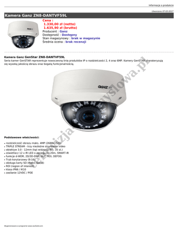Informacje o produkcie Utworzono 07-03-2017 Kamera Ganz ZN8-DANTVF59L Cena : 1.330,00 zł (netto) 1.635,90 zł (brutto) Producent : Ganz Dostępność : Dostępny Stan magazynowy : brak w magazynie Średnia ocena : brak recenzji Kamera Ganz GenStar ZN8-DANTVF59L w iz ja -p r ze m ys lo w a. pl Seria kamer GenSTAR reprezentuje nowoczesną linię produktów IP o rozdzielczości 2, 4 oraz 6MP. Kamery GenSTAR charakeryzują się wysoką jakością obrazu oraz bogatą funkcjonalnością. Podstawowe właściwości: ● ● ● ● ● ● ● ● rozdzielczość obrazu maks. 4MP (2688x1520) TRIPLE STREAM - trzy niezleżne strumienie video obiektyw 3.0 - 12mm (kąt widzenia 87 - 35 st.) oświetlacz 12 x IR LED o zasięgu do 20m, SMART-IR funkcje d-WDR, 2D/3D-DNR, HLC, ROI, DEFOG Tryb korytarzowy (9:16) obsługa karty SD (maks. 64GB) ROI (region of interest) klasa IP66 / IK10 zasilanie 12VDC / POE le ● te ● Wygenerowano w programie www.oscGold.com ze m ys lo w a. pl Dodatkowe wyposażenie: Adaptery i akcesoria do montażu kamery te le w iz ja -p r Specyfikacja: te le w iz ja -p r ze m ys lo w a. pl Informacje o produkcie Wygenerowano w programie www.oscGold.com ze m ys lo w a. pl Marka GANZ to szeroka gama produktów CCTV o doskonałej jakości i Niezawodności. GANZ to kompleksowe rozwiązania w zakresie bezpieczeństwa. GANZ to synonim NIEZAWODNOŚĆI Akcesoria do kamer z serii ZN8 Kod produktu Opis Cena netto 140 ZA8-CBK624 Wysięgnik naścienny: Kompatybilny ze skrzynką połączeniową, adapterem narożnym, obejmą na słup (dla ZN8-DANTVF59L). 210 ZA8-CBK625 Adapter do mocowania wiszącego sufitowego do rury: stosuje się wymiennie z podstawą kamery (dla ZN8-DANTVF59L). 70 ZA8-CBK626 Adapter do mocowania narożnego, kompatybilny z wysięgnikiem naściennym oraz adapterem ZA8-CBK629. 120 ZA8-CBK627 Adapter opaskowy do mocowania na słupie, kompatybilny ze skrzynką połączeniową. 140 ZA8-CBK629 Adapter w formie puszki montażowej do kamer. 210 ZA8-CBK633 Adapter w formie puszki montażowej do kamer bullet oraz mini-bullet. 160 ZA8-CBK634 Puszka montażowa nasadzana z tyłu kamery mini-kopułkowej. 70 ZA8-BK332B Wysięgnik sufitowy typu wiszącego do kamer mini-kopułkowych. 180 ZA8-BK331B Wysięgnik naścienny do kamer mini-kopułkowych. 200 ZA8-CBK636 Wysięgnik naścienny do kamery fisheye. 160 ZA8-CBK637 Wysięgnik sufitowy typu wiszącego do kamery fisheye. 130 Obejma do mocowania na słupie. 500 Adapter do mocowania narożnego. 380 ZA8-BK607B Wysięgnik prosty (pionowy) do montażu sufitowego (dla ZN8-P4NTAF60L). 90 ZA8-BK606B Wysięgnik naścienny do kamer PTZ IR (fabrycznie - w komplecie z kamerą) 130 ZA8-BK605 w iz ja te ZA8-BK604 le ZA8-CBK623 -p r Wysięgnik sufitowy wiszący, kompatybilny z adapterem ZA8-CBK629 (dla ZN8-DANTVF59L). ze m ys lo w a. pl Informacje o produkcie te le w iz ja -p r zadzwoń i zapytaj o rabat (22 672-36-36) (505-130-571) Wygenerowano w programie www.oscGold.com