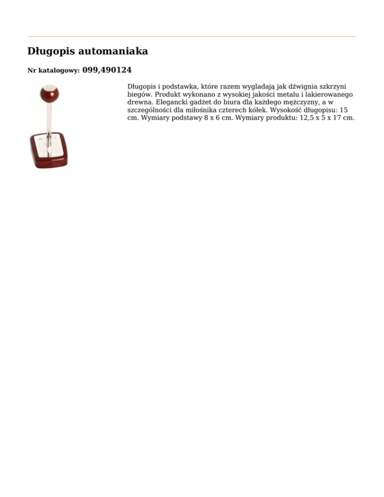Długopis automaniaka Nr katalogowy: 099,490124 Długopis i podstawka, które razem wygladają jak dźwignia szkrzyni biegów. Produkt wykonano z wysokiej jakości metalu i lakierowanego drewna. Elegancki gadżet do biura dla każdego mężczyzny, a w szczególności dla miłośnika czterech kółek. Wysokość długopisu: 15 cm. Wymiary podstawy 8 x 6 cm. Wymiary produktu: 12,5 x 5 x 17 cm.