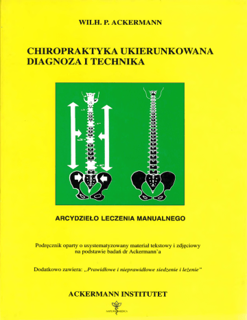 WILH. P. ACKERMANN CHIROPRAKTYKA UKIERUNKOWANA DIAGNOZA I TECHNIKA ARCYDZIEŁO LECZENIA MANUALNEGO Podręcznik oparty o usystematyzowany materiał tekstowy i zdjęciowy na podstawie badań dr Ackermamria Dodatkowo zawiera: „Prawidłowe i nieprawidłowe siedzenie i leżenie” ACKERMANN INSTITUTET NATURA )MEDICA WILH. P. ACKERMANN Chiropraktyka ukierunkowana. Diagnoza i technika. BADANIA NAD KRĘGOSŁUPEM W OPISIE I ILUSTRACJI 290 ilustracji częściowo w dużym formacie Spis treści Rozdział I: Znajomość m echaniki stawów podstawą kontroli statyki szkieletu...........................................................................................................13 Szkielet jako czynnik powodujący zaburzenia w funkcjonowaniu nerwów..........................................................................................................14 Rozdział II: Prawidłowe i patologiczne ustawienie m iednicy..........................................................................................................................................17 Miednica..................................................................................................................................................................................................................... 18 Kości miedniczne i kość krzyżowa...........................................................................................................................................................................19 Kość krzyżowa.............. 20 Powierzchnie stawowe kości miednicznych i kości krzyżowej............................................................................................................................. 21 Przemieszczenie kości miednicznej i jego wpływ na długość kończyn.................................................................................................................22 Przemieszczenie kości miednicznej i jego wpływ na kręgosłup........................................................................................................................... 23 Pozorne skrócenie kończyny.....................................................................................................................................................................................24 Powstałe napięcia mięśni i ich konsekwencje.........................................................................................................................................................25 Patologiczny tonus mięśniowy spowodowany zablokowaniem kości miednicznej............................................................................................. 26 Patologiczny tonus mięśniowy wywołany skręceniem kości miednicznych........................................................................................................ 27 Wady postawy............................................................................................................................................................................................................28 Przemieszczenia w dolnych partiach kręgosłupa.....................................................................................................................................................29 Rozdział III: Diagnostyka radiologiczna miednicy.............................................................................................................................................................31 Dostosowywanie się kręgosłupa do ukośne ustawionej miednicy........................................................................................................................32 Mierzenie porównawcze odległości w miednicy................................................................................................................................................... 33 Ukośne ustawienie miednicy wskutek skręcenia kości miednicznej..................................................................................................................34 Ukośne ustawienie miednicy wskutek skręcenia kości miednicznej............................................................ *....................................................35 Ukośne ustawienie miednicy wskutek skręcenia kości miednicznej przyczyną kręgozmyku...........................................................................36 Kręgozmyk- czynniki ryzyka....................................................................................................................................................................................37 Obciążone przez torsję krążki międzykręgowe jako następstwo nabytego przemieszczenia kości miednicznej............................................ 38 Przemieszczenie kości miednicznej z nieprawidłowym ustawieniem kości krzyżowej...................................................................................... 39 Ukośne ustawienie miednicy wskutek skręcenia kości miednicznej................................................................................................................... 40 Ukośne ustawienie miednicy wskutek przemieszczenia kości miednicznej.......................................................................................................41 Skolioza spowodowana ukośnym ustawieniem miednicy..................................................................................................................................... 42 Starte kręgi lędźwiowe jako następstwo kręgozmyku.........................................................................................................................................43 Łagodzenie bólu poprzez starcie kręgów............................................................................................................................................................... 44 Rozdział IV: M echaniczne skutki nabytych przemieszczeń kości miednicznych..................................