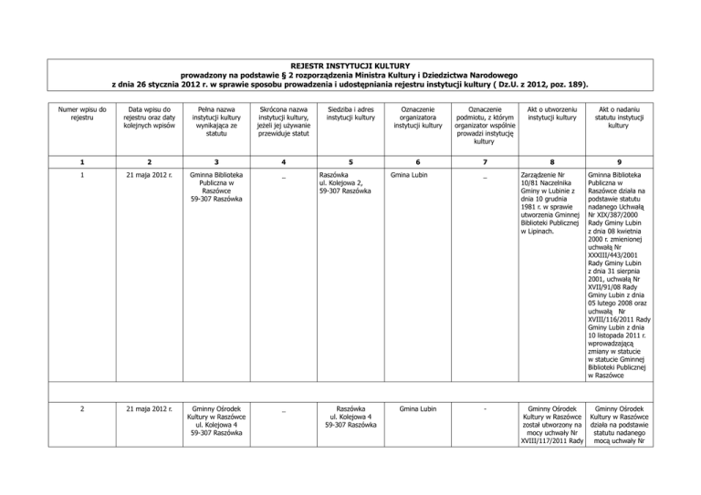 REJESTR INSTYTUCJI KULTURY prowadzony na podstawie § 2 rozporządzenia Ministra Kultury i Dziedzictwa Narodowego z dnia 26 stycznia 2012 r. w sprawie sposobu prowadzenia i udostępniania rejestru instytucji kultury ( Dz.U. z 2012, poz. 189). Numer wpisu do rejestru Data wpisu do rejestru oraz daty kolejnych wpisów Pełna nazwa instytucji kultury wynikająca ze statutu Skrócona nazwa instytucji kultury, jeżeli jej używanie przewiduje statut Siedziba i adres instytucji kultury Oznaczenie organizatora instytucji kultury Oznaczenie podmiotu, z którym organizator wspólnie prowadzi instytucję kultury Akt o utworzeniu instytucji kultury Akt o nadaniu statutu instytucji kultury 1 2 3 4 5 6 7 8 9 1 21 maja 2012 r. Gminna Biblioteka Publiczna w Raszówce 59-307 Raszówka _ 2 21 maja 2012 r. Gminny Ośrodek Kultury w Raszówce ul. Kolejowa 4 59-307 Raszówka _ Raszówka ul. Kolejowa 2, 59-307 Raszówka Raszówka ul. Kolejowa 4 59-307 Raszówka Gmina Lubin Gmina Lubin _ Zarządzenie Nr 10/81 Naczelnika Gminy w Lubinie z dnia 10 grudnia 1981 r. w sprawie utworzenia Gminnej Biblioteki Publicznej w Lipinach. - Gminny Ośrodek Kultury w Raszówce został utworzony na mocy uchwały Nr XVIII/117/2011 Rady Gminna Biblioteka Publiczna w Raszówce działa na podstawie statutu nadanego Uchwałą Nr XIX/387/2000 Rady Gminy Lubin z dnia 08 kwietnia 2000 r. zmienionej uchwałą Nr XXXIII/443/2001 Rady Gminy Lubin z dnia 31 sierpnia 2001, uchwałą Nr XVII/91/08 Rady Gminy Lubin z dnia 05 lutego 2008 oraz uchwałą Nr XVIII/116/2011 Rady Gminy Lubin z dnia 10 listopada 2011 r. wprowadzającą zmiany w statucie w statucie Gminnej Biblioteki Publicznej w Raszówce Gminny Ośrodek Kultury w Raszówce działa na podstawie statutu nadanego mocą uchwały Nr Gminy Lubin z dnia 10 listopada 2011 r. w sprawie połączenia samorządowych instytucji kultury XIX/119/2011 Rady Gminy Lubin z dnia 30 listopada 2011 r. w sprawie nadania statutu Gminnemu Ośrodkowi Kultury w Raszówce