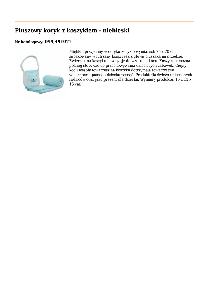Pluszowy kocyk z koszykiem - niebieski Nr katalogowy: 099,491077 Miękki i przyjemny w dotyku kocyk o wymiarach 75 x 70 cm zapakowany w futrzany koszyczek z głową pluszaka na przodzie. Zwierzak na koszyku nawiązuje do wzoru na kocu. Koszyczek można później stosować do przechowywania dziecięcych zabawek. Ciepły koc i wesoły towarzysz na koszyku dotrzymaja towarzystwa wieczorem i pomogą dziecku zasnąć. Produkt dla świeżo upieczonych rodziców oraz jako prezent dla dziecka. Wymiary produktu: 15 x 12 x 15 cm.