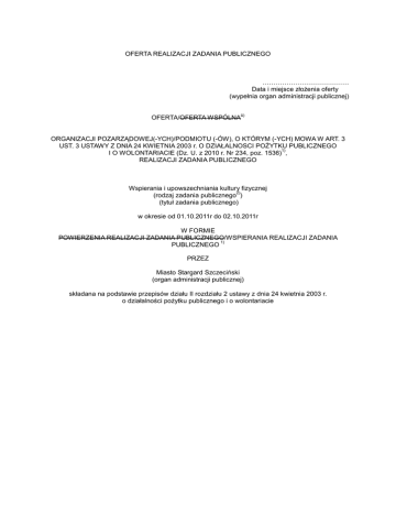 OFERTA REALIZACJI ZADANIA PUBLICZNEGO ………………………………… Data i miejsce złożenia oferty (wypełnia organ administracji publicznej) 1) OFERTA/OFERTA WSPÓLNA ORGANIZACJI POZARZĄDOWEJ(-YCH)/PODMIOTU (-ÓW), O KTÓRYM (-YCH) MOWA W ART. 3 UST. 3 USTAWY Z DNIA 24 KWIETNIA 2003 r. O DZIAŁALNOSCI POŻYTKU PUBLICZNEGO 1) I O WOLONTARIACIE (Dz. U. z 2010 r. Nr 234, poz. 1536) , REALIZACJI ZADANIA PUBLICZNEGO Wspierania i upowszechniania kultury fizycznej 2) (rodzaj zadania publicznego ) (tytuł zadania publicznego) w okresie od 01.10.2011r do 02.10.2011r W FORMIE POWIERZENIA REALIZACJI ZADANIA PUBLICZNEGO/WSPIERANIA REALIZACJI ZADANIA 1) PUBLICZNEGO PRZEZ Miasto Stargard Szczeciński (organ administracji publicznej) składana na podstawie przepisów działu II rozdziału 2 ustawy z dnia 24 kwietnia 2003 r. o działalności pożytku publicznego i o wolontariacie 1)3) I. Dane oferenta/oferentów 1) nazwa: „SHOBU-KAN” Stargardzkie Stowarzyszenie Karate 4) 2) forma prawna: ( x ) stowarzyszenie ( ) fundacja ( ) kościelna osoba prawna ( ) kościelna jednostka organizacyjna ( ) spółdzielnia socjalna ( ) inna………………………………… 5) 3) numer w Krajowym Rejestrze Sądowym, w innym rejestrze lub ewidencji: Urząd Miasta Stargard Szczeciński 6) 4) data wpisu, rejestracji lub utworzenia: nr rejestru 44/KS/07 z dnia 11 kwietnia 2007r 5) nr NIP , nr REGON - nr NIP 854 231 32 31 nr REGON 320362379 6) adres: miejscowość: Stargard Szczeciński 7) dzielnica lub inna jednostka pomocnicza: ……………………………………….. 8) gmina: STARGARD SZCZECIŃSKI powiat: Stargard Szczeciński województwo: ZACHODNIOPOMORSKIE kod pocztowy: 73-110 7) tel 501 476 778 , faks: BRAK e-mail: [email protected] http:// 8) numer rachunku bankowego: Nr Rachunku 28 1140 2017 0000 4702 1098 7867 nazwa banku: BRE Bank S.A w Stargardzie Szczecińskim ul. Piłsudskiego 3. 1) 9) nazwiska i imiona osób upoważnionych do reprezentowania oferenta/oferentów : Bożena Prządka, Andrzej Malec 10) nazwa, adres i telefon kontaktowy jednostki organizacyjnej bezpośrednio wykonującej zadanie, 9) o którym mowa w ofercie: Stargardzkie Stowarzyszenie Karate „SHOBU-KAN”, z siedzibą w Stargardzie Szczecińskim, przy ul. Daleka 8, 11) osoba upoważniona do składania wyjaśnień dotyczących ofert (imię i nazwisko oraz nr telefonu kontaktowego) BOŻENA PRZĄDKA tel. 501 476 778 12) przedmiot działalności pożytku publicznego: a) działalność nieodpłatna pożytku publicznego - współdziałanie w realizacji upowszechniania kultury fizycznej , w tym propagowanie sztuki walk wschodnich - szerzenie sztuki karate wśród dzieci i młodzieży wyrażające się poprzez organizację imprez sportowych, pokazów, zawodów, obozów szkoleniowych, zgrupowań itp. form służących uzupełnianiu wiedzy i wymianie doświadczeń - prowadzenie współpracy z instytucjami i organizacjami w zakresie celów statutowych b) działalność odpłatna pożytku publicznego nie dotyczy 1) 1) 13) jeżeli oferent /oferenci prowadzi/prowadzą działalność gospodarczą: a) numer wpisu do rejestru przedsiębiorców: nie dotyczy. b) przedmiot działalności gospodarczej Nie dotyczy II. Informacja o sposobie reprezentacji oferentów wobec organu administracji publicznej wraz 10) z przytoczeniem podstawy prawnej Nie dotyczy III. Szczegółowy zakres rzeczowy zadania publicznego proponowanego do realizacji 1. Krótka charakterystyka zadania publicznego Zorganizowanie i przeprowadzenie imprezy sportowej dla dzieci i młodzieży pod nazwą VI Stargardzki Turniej Karate Shotokan. Zawody będą miały za zadanie popularyzację Karate stylu SHOTOKAN jako dyscypliny sportowej, wyłonienie najlepszych zawodników karate stylu SHOTOKAN na terenie województwa a także sprawdzenie stanu przygotowania zawodników Kadry Polski na Mistrzostwa Europy w tylu SHOTOKAN. 2. Opis potrzeb wskazujących na konieczność wykonania zadania publicznego, opis ich przyczyn oraz skutków „SHOBU-KAN” SSK planuje wzorem lat ubiegłych, po raz szósty zorganizowanie imprezy Stargardzki Turniej Karate SHOTOKAN pod Honorowym Patronatem Prezydenta Miasta Stargardu Szczecińskiego dla około 180 zawodników uprawiających wschodnią sztukę walki w tradycyjnym stylu SHOTOKAN. Turniej jest tradycyjnym sprawdzianem umiejętności jakie dzieci i młodzież zdobyła przez rok treningów, stanowi również bazę kontrolną dla przygotowań zawodników Kadry Polski do Mistrzostw Europy w Karate SHOTOKAN. VI Stargardzki Turniej Karate to impreza gali wschodnich sztuk walk pozwalająca popularyzować aktywne formy wypoczynku dla dzieci i młodzieży wśród mieszkańców naszego miasta. 3. Opis grup adresatów zadania publicznego Stargardzki Turniej Karate SHOTOKAN adresowany jest do wszystkich Tych, którzy trenują karate jako sztukę walki i chcą sprawdzić swoje umiejętności i postępy, do uczestników zajęć prowadzonych w Klubach zrzeszonych w Polskim Związku Karate, zawodników Kadry Polski na Mistrzostwa Europy Karate SHOTOKAN. 4. Uzasadnienie potrzeby dofinansowania z dotacji inwestycji związanych z realizacją zadania publicznego, w szczególności ze wskazaniem w jaki sposób przyczyni się to do podwyższenia 11) standardu realizacji zadania. Nie dotyczy 1) 1) 5. Informacja, czy w ciągu ostatnich 5 lat oferent/oferenci otrzymał/otrzymali dotację na dofinansowanie inwestycji związanych z realizacją zadania publicznego z podaniem inwestycji, które 11) zostały dofinansowane, organu który udzielił dofinansowania oraz daty otrzymania dotacji . Nie dotyczy 6. Zakładane cele realizacji zadania publicznego oraz sposób ich realizacji upowszechnienie sportów wschodnich wśród dzieci i młodzieży, zaprezentowanie tradycyjnego stylu, sztuki walki karate jako dyscypliny stwarzającej możliwości rywalizacji sportowej szerokiej społeczności miasta Stargardu Szczecińskiego podnoszenie poziomu kultury fizycznej wśród dziec
