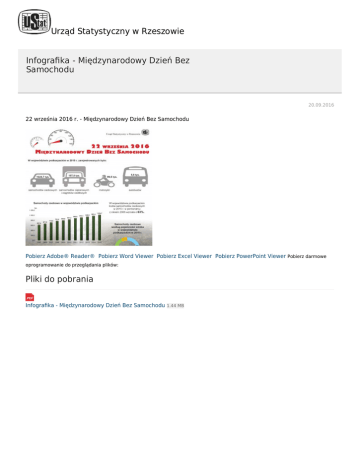 Urząd Statystyczny w Rzeszowie Infografika - Międzynarodowy Dzień Bez Samochodu 20.09.2016 22 września 2016 r. - Międzynarodowy Dzień Bez Samochodu Pobierz Adobe® Reader® Pobierz Word Viewer Pobierz Excel Viewer Pobierz PowerPoint Viewer Pobierz darmowe oprogramowanie do przeglądania plików: Pliki do pobrania Infografika - Międzynarodowy Dzień Bez Samochodu 1.44 MB