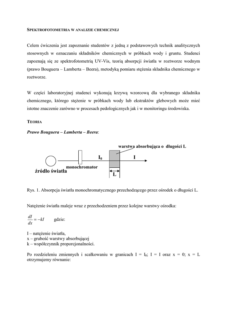 SPEKTROFOTOMETRIA W ANALIZIE CHEMICZNEJ Celem ćwiczenia jest zapoznanie studentów z jedną z podstawowych technik analitycznych stosownych w oznaczaniu składników chemicznych w próbkach wody i gruntu. Studenci zapoznają się ze spektrofotometrią UV-Vis, teorią absorpcji światła w roztworze wodnym (prawo Bouguera – Lamberta – Beera), metodyką pomiaru stężenia składnika chemicznego w roztworze. W części laboratoryjnej studenci wykonują krzywą wzorcową dla wybranego składnika chemicznego, którego stężenie w próbkach wody lub ekstraktów glebowych może mieć istotne znaczenie zarówno w procesach pedologicznych jak i w monitoringu środowiska. TEORIA Prawo Bouguera – Lamberta – Beera: warstwa absorbująca o długości L I0 I monochromator źródło światła L Rys. 1. Absorpcja światła monochromatycznego przechodzącego przez ośrodek o długości L. Natężenie światła maleje wraz z przechodzeniem przez kolejne warstwy ośrodka: dI = − kI dx gdzie: I – natężenie światła, x – grubość warstwy absorbującej k – współczynnik proporcjonalności. Po rozdzieleniu zmiennych i scałkowaniu w granicach I = I0; I = I oraz x = 0; x = L otrzymujemy równanie: dI = − kdx I I L dI ∫ I = −k ∫0 dx I0 ln I − ln I 0 = − kL ln I = − kL I0 I0 = kL I Zamieniając na logarytmy dziesiętne mamy: ln I0 = kL I I k log 0 = ⋅L = a⋅L I 2,303 2,303 ⋅ log gdzie: a =k/2,303 to współczynnik absorbancji ośrodka, natomiast wyrażenie log(I0/I) jest nazywane absorbancją i oznaczamy ją jako A, zatem teraz mamy: A = a⋅L Równanie to można sformułować następująco: przy współczynniku a = const. (dla ośrodka optycznie jednorodnego i wiązki światła monochromatycznego) absorbancja (A) jest proporcjonalna do grubości warstwy absorbującej (L). Badając roztwory pod kątem absorpcji światła Beer ustalił, że współczynnik k jest proporcjonalny do stężenia substancji obecnej w roztworze i absorbującej światło. Przeprowadzając analogiczne przekształcenia dla k = k’· c otrzymujemy prawo LambertaBeera: A = ε ⋅c⋅ L gdzie: A – absorbancja, ε – współczynnik absorbancji roztworu (= k’/2,303), c – stężenie substancji w roztworze, L – grubość warstwy absorbującej. W spektrofotometrach UV-Vis stosuje się dwie skale, jedna wyraża absorbancję (A), druga wyraża transmitancję (T): T= I I0 Oba wyrażenia powiązane są zależnością: 1 A = log T 1 A 2 stężenie [C] Rys. 2. Zależność absorbancji od stężenia substancji barwnej w roztworze. 1 – układ spełniający prawo Lamberta-Beera, 2 – układ nie spełniający tego prawa przy wyższych stężeniach. ĆWICZENIE Fotometryczne oznaczanie żelaza III w próbkach wody – wykonanie krzywej wzorcowej. Podstawą metody oznaczania jonów żelaza III jest barwna reakcja z jonami tiocyjanianowymi w wyniku której tworzą się barwne kompleksy m.in. Fe(SCN)2+, Fe(SCN)2+. 1. Przygotowanie roztworu wzorcowego Fe3+ 100 mg/l (0,4827 g FeCl3 6H2O w 1000 ml). Chlorek żelaza w roztworze wodnym szybko hydrolizuje, aby spowolnić ten proces należy roztwór zakwasić kwasem solnym. 2. Przygotować szereg czterech probówek wraz z roztworem wzorcowym żelaza w różnym stężeniu wg. schematu: roztwór wzorcowy Fe3+ [ml] woda [ml] stężenie finalne Fe w probówkach [mg/l] 1 0 5 0 2 0,1 4,9 2 3 0,25 4,75 5 4 0,5 4,5 10 3. Do każdej probówki dodajemy: 0.2 mL HCl 0.1n + 0.5 mL NH4SCN 5%, całość wymieszać, a następnie po 5 minutach zmierzyć absorbancję przy długości fali λ=470nm. 4. Wykreślić zależność absorbancji od stężenia żelaza w próbkach. Sprawdzić, czy układ spełnia prawo Lamberta-Beera w zadanym zakresie stężeń. 5. Wyznaczyć krzywą korelacji prostoliniowej dla badanej zależności, wyznaczyć współczynnik korelacji i dostosowania. 6. Określić źródła ewentualnych błędów, które mogą mieć wpływ na otrzymaną zależność.