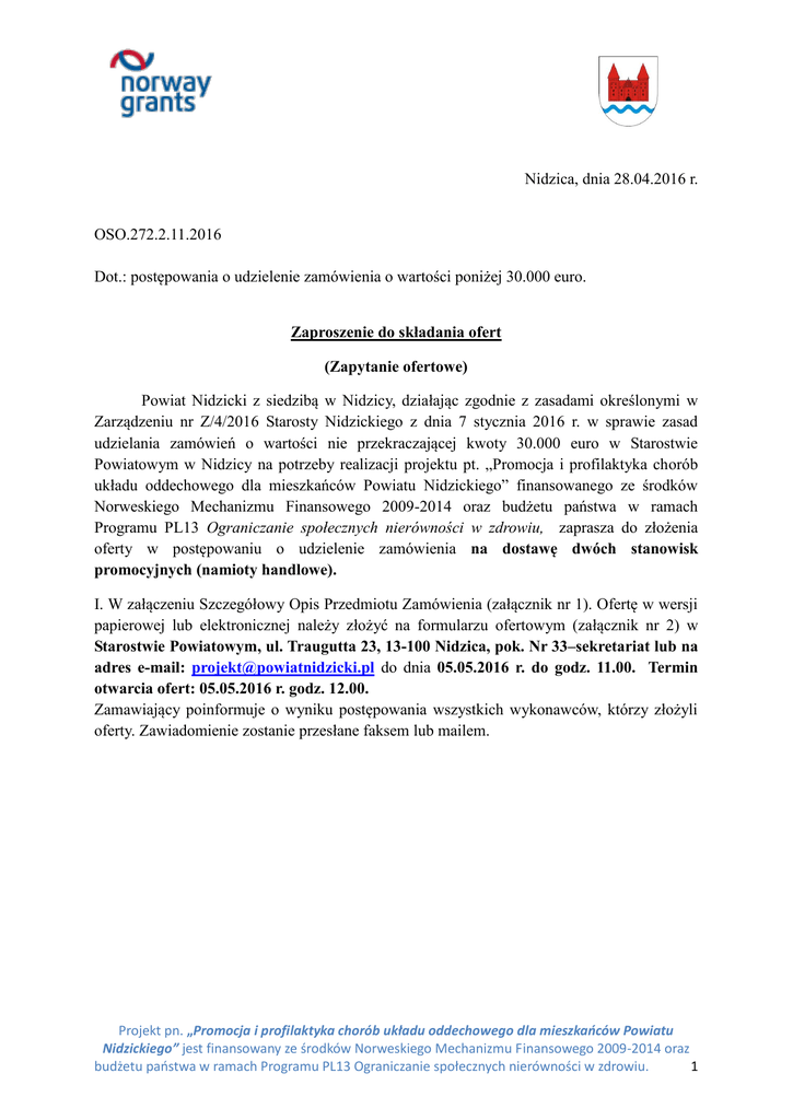 Nidzica, dnia 28.04.2016 r. OSO.272.2.11.2016 Dot.: postępowania o udzielenie zamówienia o wartości poniżej 30.000 euro. Zaproszenie do składania ofert (Zapytanie ofertowe) Powiat Nidzicki z siedzibą w Nidzicy, działając zgodnie z zasadami określonymi w Zarządzeniu nr Z/4/2016 Starosty Nidzickiego z dnia 7 stycznia 2016 r. w sprawie zasad udzielania zamówień o wartości nie przekraczającej kwoty 30.000 euro w Starostwie Powiatowym w Nidzicy na potrzeby realizacji projektu pt. „Promocja i profilaktyka chorób układu oddechowego dla mieszkańców Powiatu Nidzickiego” finansowanego ze środków Norweskiego Mechanizmu Finansowego 2009-2014 oraz budżetu państwa w ramach Programu PL13 Ograniczanie społecznych nierówności w zdrowiu, zaprasza do złożenia oferty w postępowaniu o udzielenie zamówienia na dostawę dwóch stanowisk promocyjnych (namioty handlowe). I. W załączeniu Szczegółowy Opis Przedmiotu Zamówienia (załącznik nr 1). Ofertę w wersji papierowej lub elektronicznej należy złożyć na formularzu ofertowym (załącznik nr 2) w Starostwie Powiatowym, ul. Traugutta 23, 13-100 Nidzica, pok. Nr 33–sekretariat lub na adres e-mail: [email protected] do dnia 05.05.2016 r. do godz. 11.00. Termin otwarcia ofert: 05.05.2016 r. godz. 12.00. Zamawiający poinformuje o wyniku postępowania wszystkich wykonawców, którzy złożyli oferty. Zawiadomienie zostanie przesłane faksem lub mailem. Projekt pn. „Promocja i profilaktyka chorób układu oddechowego dla mieszkańców Powiatu Nidzickiego” jest finansowany ze środków Norweskiego Mechanizmu Finansowego 2009-2014 oraz budżetu państwa w ramach Programu PL13 Ograniczanie społecznych nierówności w zdrowiu. 1