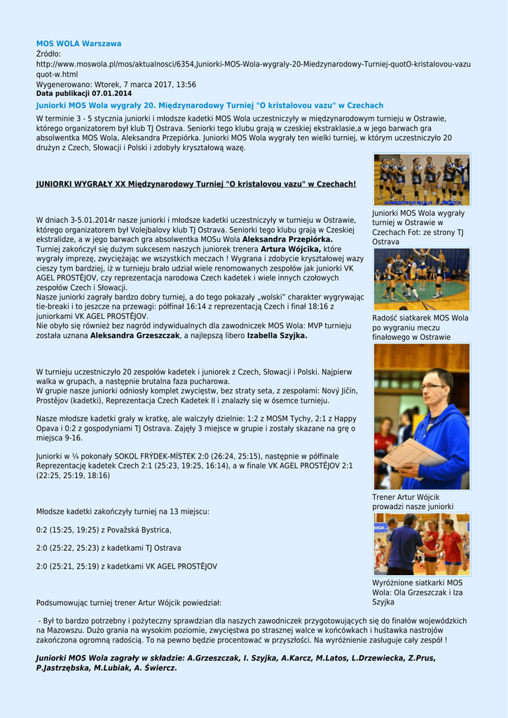 MOS WOLA Warszawa Źródło: http://www.moswola.pl/mos/aktualnosci/6354,Juniorki-MOS-Wola-wygraly-20-Miedzynarodowy-Turniej-quotO-kristalovou-vazu quot-w.html Wygenerowano: Wtorek, 7 marca 2017, 13:56 Data publikacji 07.01.2014 Juniorki MOS Wola wygrały 20. Międzynarodowy Turniej "O kristalovou vazu" w Czechach W terminie 3 - 5 stycznia juniorki i młodsze kadetki MOS Wola uczestniczyły w międzynarodowym turnieju w Ostrawie, którego organizatorem był klub TJ Ostrava. Seniorki tego klubu grają w czeskiej ekstraklasie,a w jego barwach gra absolwentka MOS Wola, Aleksandra Przepiórka. Juniorki MOS Wola wygrały ten wielki turniej, w którym uczestniczyło 20 drużyn z Czech, Słowacji i Polski i zdobyły kryształową wazę. JUNIORKI WYGRAŁY XX Międzynarodowy Turniej "O kristalovou vazu" w Czechach! W dniach 3-5.01.2014r nasze juniorki i młodsze kadetki uczestniczyły w turnieju w Ostrawie, którego organizatorem był Volejbalovy klub TJ Ostrava. Seniorki tego klubu grają w Czeskiej ekstralidze, a w jego barwach gra absolwentka MOSu Wola Aleksandra Przepiórka. Turniej zakończył się dużym sukcesem naszych juniorek trenera Artura Wójcika, które wygrały imprezę, zwyciężając we wszystkich meczach ! Wygrana i zdobycie kryształowej wazy cieszy tym bardziej, iż w turnieju brało udział wiele renomowanych zespołów jak juniorki VK AGEL PROSTĚJOV, czy reprezentacja narodowa Czech kadetek i wiele innych czołowych zespołów Czech i Słowacji. Nasze juniorki zagrały bardzo dobry turniej, a do tego pokazały „wolski” charakter wygrywając tie-breaki i to jeszcze na przewagi: półfinał 16:14 z reprezentacją Czech i finał 18:16 z juniorkami VK AGEL PROSTĚJOV. Nie obyło się również bez nagród indywidualnych dla zawodniczek MOS Wola: MVP turnieju została uznana Aleksandra Grzeszczak, a najlepszą libero Izabella Szyjka. Juniorki MOS Wola wygrały turniej w Ostrawie w Czechach Fot: ze strony TJ Ostrava Radość siatkarek MOS Wola po wygraniu meczu finałowego w Ostrawie W turnieju uczestniczyło 20 zespołów kadetek i juniorek z Czech, Słowacji i Polski. Najpierw walka w grupach, a następnie brutalna faza pucharowa. W grupie nasze juniorki odniosły komplet zwycięstw, bez straty seta, z zespołami: Nový Jičín, Prostějov (kadetki), Reprezentacja Czech Kadetek II i znalazły się w ósemce turnieju. Nasze młodsze kadetki grały w kratkę, ale walczyły dzielnie: 1:2 z MOSM Tychy, 2:1 z Happy Opava i 0:2 z gospodyniami TJ Ostrava. Zajęły 3 miejsce w grupie i zostały skazane na grę o miejsca 9-16. Juniorki w ¼ pokonały SOKOL FRÝDEK-MÍSTEK 2:0 (26:24, 25:15), następnie w półfinale Reprezentację kadetek Czech 2:1 (25:23, 19:25, 16:14), a w finale VK AGEL PROSTĚJOV 2:1 (22:25, 25:19, 18:16) Młodsze kadetki zakończyły turniej na 13 miejscu: Trener Artur Wójcik prowadzi nasze juniorki 0:2 (15:25, 19:25) z Považská Bystrica, 2:0 (25:22, 25:23) z kadetkami TJ Ostrava 2:0 (25:21, 25:19) z kadetkami VK AGEL PROSTĚJOV Podsumowując turniej trener Artur Wójcik powiedział: Wyróżnione siatkarki MOS Wola: Ola Grzeszczak i Iza Szyjka - Był to bardzo potrzebny i pożyteczny sprawdzian dla naszych zawodniczek przygotowujących się do finałów wojewódzkich na Mazowszu. Dużo grania na wysokim poziomie, zwycięstwa po strasznej walce w końcówkach i huśtawka nastrojów zakończona ogromną radością. To na pewno będzie procentować w przyszłości. Na wyróżnienie zasługuje cały zespół ! Juniorki MOS Wola zagrały w składzie: A.Grzeszczak, I. Szyjka, A.Karcz, M.Latos, L.Drzewiecka, Z.Prus, P.Jastrzębska, M.Lubiak, A. Świercz. Młodsze kadetki: A. Hamuda, A.Pawłowska, W.Brzuzy, N.Joszczuk, W.Trzpioła, P.Uszyńska, K.Wesołowska, W.Antosiak, M.Waligóra, A.Uszyńska, D.Staniaszek, P.Szóstkiewicz. Zdjęcia ze strony: Volejbalovego klubu TJ Ostrava Końcowa kolejność w 20. Turnieju O Kryształową Wazę 2014 w Ostarwie: 1. MOS WOLA Warszawa 2.Prostějov JKY 3.RD 98 modré 4. Přerov JKY 5.Ostrava JKY 6.ELBA Prešov 7.Sokol F-M 8.RD 98 červené 9.Považská Bystrica 10.Bílovec JKY 11.MUKS Plock 12.Happy Opava 13.MOS Warszawa II 14.Prostějov KKY 15.MOSM Tychy 16Ostrava KKY 17.Bratislava Bilíkova 18.Bílovec KKY 19.Sokol Šternberk 20.Nový Jičín Komentarz (0) dodaj komentarz Brak komentarzy dodaj komentarz