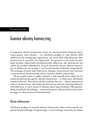 Patryk Stalski Granice obrony koniecznej Z pojęciem obrony koniecznej wiąże się nierozerwalnie dyskusja dotycząca granic owej obrony – czy działania podjęte w celu obrony były adekwatne do istniejącego zagrożenia, czy może były zdecydowanie zbyt intensywne w stosunku do zagrożenia. Na pytanie to od wielu lat próbują uzyskać odpowiedź przedstawiciele doktryny, jak dotychczas nie udało się uzyskać jednolitych, ostrych kryteriów granic obrony koniecznej, w doktrynie zaś panuje w tej kwestii skrajna niekiedy niezgodność. Nie pomaga również Sąd Najwyższy, którego orzecznictwo jest zmienne i na przestrzeni lat prezentuje różne, również skrajne stanowiska. Na początek warto w ogóle wyjaśnić w jaki sposób może dojść do sytuacji przekroczenia granic obrony koniecznej – w doktrynie określanej mianem ekscesu. Rozróżnia się dwa rodzaje ekscesu – eksces intensywny i eksces ekstensywny, oba budzą do dziś pewne emocje wśród przedstawicieli doktryny, o czym szerzej w dalszej części tego artykułu. Oba sprowadzają się jednak do jednego – naruszenia granic obrony koniecznej, które pociąga za sobą ustawowe konsekwencje. Eksces intensywny Działania podjęte w ramach obrony koniecznej, które zmierzają do odparcia bezpośredniego, bezprawnego i rzeczywistego zamachu na dobro 280 Patryk Stalski chronione prawem, są działaniami legalnymi, o ile tylko mieszczą się w granicach obrony koniecznej. Czyny przekraczające owe granice są działaniami bezprawnymi, wypełniającymi często znamiona przestępstwa, zabronionego pod groźbą kary. Są one jednak w pewien sposób uprzywilejowane w stosunku do czynów będących przestępstwami, a niebędących podjętymi w ramach obrony koniecznej. Jeszcze inaczej sytuacja wygląda w przypadku czynów przekraczających granice obrony koniecznej, ale będących wynikiem strachu lub wzburzenia usprawiedliwionych okolicznościami zamachu. Tą ostatnią sytuację, pod wieloma względami słusznie, doprecyzował prawodawca w 2009 roku, ustawą z 5 listopada 2009 r. o zmianie ustawy – Kodeks karny, ustawy – Kodeks postępowania karnego, ustawy – Kodeks karny wykonawczy, ustawy – Kodeks karny skarbowy oraz niektórych innych ustaw1. Ustawa ta wprowadziła pewną zmianę do art. 25 kodeksu karnego – w miejsce obligatoryjnego odstąpienia od wymierzenia kary przez sąd, wprowadził instytucję niepodlegania karze. Aby w ogóle można było mówić o przekroczeniu granic obrony koniecznej, musi zajść jedna z dwóch sytuacji, w doktrynie nazywanych ekscesami – eksces intensywny (niewspółmierność obrony wobec zamachu) oraz eksces ekstensywny (niewspółczesność obrony wobec zamachu), oba naruszają warunki konieczności obrony, choć oba dotyczą innych aspektów naruszenia granic obrony koniecznej2. Aby w ogóle można było mówić o przekroczeniu granic obrony koniecznej, konieczne jest najpierw zaistnienie obrony koniecznej w ogóle – nie będą przekroczeniem obrony koniecznej działania podjęte poza obroną konieczną lub w wyniku urojonej obrony koniecznej przeciwko nieistniejącemu zamachowi – nie można wówczas mówić ani o rzeczywistej obronie koniecznej, ani o istniejącym zamachu, a skoro nie ma tych dwóch elementów, to działanie podjęte nie może być przekroczeniem granic obrony koniecznej, gdyż takowe w ogóle nie zaistniały. Subiektywne przekonanie, iż jest się ofiarą napaści, której w rzeczywistości nie ma, nie nadaje podjętym działaniom cechy obrony koniecznej, ponieważ przekroczenie jej granic jest możliwe jedynie przy rzeczywistej obronie koniecznej, wyraz temu dał Sąd Najwyższy w wyroku z dnia 9 lipca 1968 r. IV KR 117/68. Działania takie podlegają analizie na płaszczyźnie błędu co do okoliczności wyłączającej 1 Dz.U. z 2009 r. Nr 206, poz. 1589. Polskie prawo karne w zarysie, PWN, Warszawa 1989, s. 177. 2I. Andrejew, Granice obrony koniecznej 281 odpowiedzialność karną czynu, o którym wcześniej była już mowa. Rozpatrując tego typu sprawy należy więc niewątpliwie rozstrzygnąć uprzednio, czy w ogóle mamy do czynienia z obroną konieczną, a dopiero potem przejść do problemu przekroczenia jej granic. Kodeks karny z 1997 roku nie definiuje niestety pojęcia „przekroczenie granic obrony koniecznej”, określone jest ono jedynie ogólnikowo w art. 25 § 2, w którym stwierdza się, iż w razie przekroczenia granic obrony koniecznej, w szczególności poprzez zastosowanie sposobu obrony niewspółmiernego do niebezpieczeństwa, sąd może zastosować nadzwyczajne złagodzenie kary, a nawet odstąpić od jej wymierzenia. W przypadku natomiast, gdyby przekroczenie granic obrony koniecznej było wynikiem strachu i wzburzenia, które są usprawiedliwione okolicznościami zamachu, zastosowanie znajduje § 3 tegoż artykułu, który przewiduje niepodleganie karze. Kryteria przekroczenia granic obrony koniecznej są więc ocenne i w dodatku występują w liczbie mnogiej, na co wskazuje zwrot „w szczególności”, użyty w ww. przepisie. Nie istnieją żadne ustawowe kryteria, nawet ogólne, które określałyby współmierność wybranego sposobu obrony do niebezpieczeństwa spowodowanego zamachem, ani proporcjonalność użytych do obrony środków. Znów więc okazuje się, że każdy taki przypadek należy rozpatrywać indywidualnie, przeprowadzając gruntowną analizę wszystkich zaistniałych okoliczności badanego zdarzenia, o czym między innymi wspomina również Sąd Apelacyjny w Łodzi: Obowiązkiem sądu orzekającego w sprawie, przy przyjęciu, że zaistniała okoliczność wyłączająca bezprawność czynu, jest wnikliwe i wyczerpujące odniesienie się nie tylko do tego, że zaistniała obrona konieczna, ale bezwzględnie koniecznym jest ustosunkowanie się do tego, czy zachowanie broniącego się, do końca zdarzenia mieściło się w granicach tej obrony. Zawsze należy zbadać, w realiach konkretnej sprawy, czy za