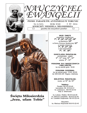 NAUCZYCIEL EWANGELII PISMO PARAFII ŚW. ANTONIEGO W TORUNIU 䀠 Nr 4 (343) ROK XXII 3 IV 2016 KWIECIEŃ NIEDZIELA MIŁOSIERDZIA & gazetka dla wszystkich parafian & MSZE ŚWIĘTE niedzielne i świąteczne: 730, 900, 1030, 1200,1330, 1800 00 na Barbarce: 13 00 w Domu Pomocy Społecznej: 11 w święta zniesione: 700, 900, 1700, 1800 w dni powszednie: 700, 830, 1800. KANCELARIA PARAFIALNA poniedziałek - piątek 900 -1000 oraz 1600 -1800 00 00 sobota 9 -10 PORADNIA DLA NARZECZONYCH I MAŁŻEŃSTW: każdy wtorek godz. 18:00 PORADNIA RODZINNA: każdy wtorek godz. 15:00 -20:00 tel: 605 638 203 Regina Zielińska BIBLIOTEKA PARAFIALNA: 00 00 środa od 16 do 18 Telefony: Parafia: 56 610-22-40 kancelaria: 56 610-22-41 ks. proboszcz: 56 610-22-42 księża wikariusze: Święto Miłosierdzia „Jezu, ufam Tobie” ks. Łukasz Waśko: 56 610-22-46 ks. Mariusz Ciesielski: 56 610-22-45 ks. Czesław Grajkowski: 56 610-22-44 Rezydent: ks. Mariusz Wojnowski 56 610-22-43 Drodzy Parafianie Pan Jezus mówi do nas: „Cokolwiek uczyniliście jednemu z tych najmniejszych, mnieście uczynili” (Mt 25,40). W naszej religii wierzymy, że ludzkie życie zaczyna się w chwili poczęcia, a kończy naturalną śmiercią. Prawdę tą jednak potwierdzają także ludzie wyznający inny światopogląd niż katolicki. Podkreślają to także wszystkie badania medyczne i zdrowy rozsądek. Niedawny przypadek z kliniki Św. Rodziny z Warszawy potwierdza fakt, że istniejące prawo, kiedyś zaakceptowane jako kompromis nie jest sprawiedliwe. Dziecko chore, kalekie w łonie matki może być zabite, inne w tym samym czasie, w tym samym wieku ma prawo do leczenia, jest przecież człowiekiem. Jeszcze inne, kiedy urodzi się martwe ma prawo do pogrzebu i pogrzebowego zasiłku. Czy to jest sprawiedliwe? Warto zadać sobie te pytania w dniu, który jest Świętem Miłosierdzia, to miłosierdzie ma się rozciągać także na dzieci nienarodzone, te najmniejsze, najbardziej bezbronne, choć wydawałoby się najbezpieczniejsze, bo rozwijające się pod sercami matek. W naszej parafii podejmujemy kolejne inicjatywy związane z uświadomieniem sobie prawdy o świętości ludzkiego życia. Mobilizował nas do tego przez lata św. Jan Paweł II. Często cytujemy i powołujemy się na jego słowa na ten temat. Mamy ołtarz i relikwie św. Joanny Beretty Molla, dla której życie dziecka było ważniejsze niż własne. Wiele matek daje świadectwo, że w tym miejscu wymodliło sobie łaskę szczęśliwego macierzyństwa. Gościliśmy znanych obrońców życia: Antoniego Ziębę, założyciela Krucjaty Modlitwy w Obronie Poczętych Dzieci oraz europosła Marka Jurka. Przed naszym kościołem w kapliczce stoi Matka Boża Brzemienna, a już niedługo odsłonimy pomnik Anioła Stróża Dzieci Nienarodzonych. Będzie to miejsce upamiętniające wszystkie dzieci, którym nie było dane się narodzić, ze względu na nieszczęście związane z samoistnym poronieniem lub aborcją. W kościele zostanie umieszczony obraz Matki Bożej z Guadalupe patronki obrońców życia, będący darem Wojciecha Cejrowskiego. W tym roku papież Franciszek włączy do grona świętych błog. Matkę Teresę. Wcześniej świętym ogłosił Jana Pawła II. Będzie to wymowny znak, że ten sam papież kanonizuje dwoje wielkich obrońców życia i apostołów Miłosierdzia. Kilka lat temu, nasz biskup Andrzej Suski nazwał nasz pomnik stojący przed kościołem: Błogosławieni Miłosierni, już niedługo będziemy mogli powiedzieć: ŚWIECI MIŁOSIERNI. Okażmy nasze miłosierdzie także tym najmniejszym, najbardziej bezbronnym, dzieciom, które jeszcze nie przyszły na ten świat… Ks. prob. Wojciech Miszewski 2 Nauczyciel Ewangelii 4/2016 BŁ. MATKA TERESA Z KALKUTY: ABORCJA ZABIJA TAKŻE SUMIENIE MATKI Aborcja niszczy nie tylko życie dziecka, ale także sumienie matki mówi w mało znanym wywiadzie z 1985 roku bł. Matka Teresa z Kalkuty. Matka Teresa wyjaśnia, że „dziecko nienarodzone jest stworzone na obraz Boga do większych rzeczy, aby kochać i być kochane". „Dlatego tak straszną rzeczą jest sama myśl, że matka, której dziecko zostało dane jako dar Boga, może je unicestwić" mówi zmarła w 1997 roku zakonnica. „Dlatego uważam, że aborcja w największy sposób niszczy pokój, ponieważ niszczy życie dziecka, ale także niszczy sumienie matki, która przez długie lata ma świadomość, że zamordowała własne dziecko" dodaje błogosławiona i przyznaje, że trudno uwierzyć w to, że matka może zamordować własne dziecko. W rozmowie z 1985 r. Matka Teresa wspomina spotkanie z kobietą, która dokonała aborcji swego dziecka osiem lat wcześniej i opowiadała, że za każdym razem, gdy widzi ośmioletnie dziecko uświadamia sobie, że tak mogłoby wyglądać jej własne, gdyby go nie zabiła. Przez długi czas Matka Teresa starała się pomóc tej kobiecie, prosząc Boga, by jej przebaczył. Okazją do tej rozmowy była Konferencja Krajowej Koalicji Katolickiej w Nowym Jorku. W wywiadzie Matka Teresa mówiła też o swej pracy dla najuboższych w Indiach i innych miejscach świata. Zauważała, że aborcja jest mniej powszechna wśród tych, którzy cierpią niedostatek. „To coś bardzo dziwnego, że ludzie biedni nie uśmiercają swych nienarodzonych dzieci. To ludzie lepiej sytuowani, którzy chcą czegoś jeszcze, boją się tego najmniejszego. Więc uśmiercają dziecko. Ale bardzo biedni ludzie tego nie robią" dodała. Jedne z najsłynniejszych słów o aborcji bł. Matka Teresa wypowiedziała w 1994 roku w obecności polityków USA podczas National Prayer Breakfast w nowojorskim hotelu Hilton. „Jeśli zgodzimy się, iż matka może zabić nawet własne dziecko, jak możemy mówić innym ludziom, aby nie zabijali jedni drugich?" mówiła zakonnica, nawiązując do przemówienia, jakie wygłosiła podczas ceremonii przyjmowania Pokojowej Nagrody Nobla, 10 października 1979 roku. Powiedziała wówczas, że największym zagrożeniem