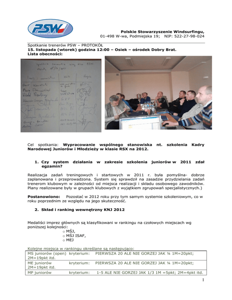 Polskie Stowarzyszenie Windsurfingu, 01-498 W-wa, Podmiejska 19; NIP: 522-27-98-024 Spotkanie trenerów PSW – PROTOKÓŁ 15. listopada (wtorek) godzina 12:00 – Osiek – ośrodek Dobry Brat. Lista obecności: Cel spotkania: Wypracowanie wspólnego stanowiska Narodowej Juniorów i MłodzieŜy w klasie RSX na 2012. 1. Czy system egzamin? działania w zakresie szkolenia nt. szkolenia juniorów w 2011 Kadry zdał Realizacja zadań treningowych i startowych w 2011 r. była pomyślna- dobrze zaplanowana i przeprowadzona. System się sprawdził na zasadzie przydzielania zadań trenerom klubowym w zależności od miejsca realizacji i składu osobowego zawodników. Plany realizowane były w grupach klubowych z wyjątkiem zgrupowań specjalistycznych.) Postanowiono: Pozostać w 2012 roku przy tym samym systemie szkoleniowym, co w roku poprzednim ze względu na jego skuteczność. 2. Skład i ranking wewnętrzny KNJ 2012 Medaliści imprez głównych są klasyfikowani w rankingu na czołowych miejscach wg poniższej kolejności: o MŚJ, o MŚJ ISAF, o MEJ Kolejne miejsca w rankingu określane są następująco: MS juniorów (open) kryterium: PIERWSZA 20 ALE NIE GORZEJ JAK ¼ 1M=20pkt; 2M=19pkt itd. ME juniorów kryterium: PIERWSZA 20 ALE NIE GORZEJ JAK ¼ 1M=20pkt; 2M=19pkt itd. MP juniorów kryterium: 1-5 ALE NIE GORZEJ JAK 1/3 1M =5pkt; 2M=4pkt itd. 1 MŚ BIC 2M=7pkt itd. ME BIC 2M=7pkt itd. OOM kryterium: PIERWSZA 8 NIE GORZEJ JAK ¼ 1M=8pkt; kryterium: PIERWSZA 8 NIE GORZEJ JAK ¼ 1M=8pkt; kryterium: 1-3 ALE NIE GORZEJ JAK ¼ 1M=3pkt itd. LICZĄ SIĘ 3 NAJLEPSZE IMPREZY Skład i ranking - patrz załącznik nr 1 3. Kandydatury zawodników RSX do KN PZś 2012 - "na wniosek": Wnioskujemy „na wniosek” do KNPZŻ jako PSW tylko zawodników, którzy zdobyli punkty w RANKING KNjun i młodź. w klasie RSX i BIC. Reszta wniosków pozostaje wyłącznie w gestii klubów. 4. Kalendarz regat 2012: Wg załącznika nr 2 5. Plan szkolenia grupy KN juniorów RSX w 2012 + zasady organizacyjne. Ustalenia zebranych dot. zgrupowań wspólnych: Maciek Dziemiańczuk, Tomasz Stefański – określić priorytetowe zgrupowania szkoleniowe, a tym samym pewność finansowania tych zgrupowań. Najważniejsze zgrupowania odbywają się wiosną tj. Cadyks, Los Alcazares, Garda ze względu na ważność ciągłości pływania, Witold Nerling – akceptacja decyzji Maćka i Tomka, Tomasz Stefański – kładzie nacisk na zgrupowanie na Gardzie, Paweł Kowalski – zaakceptować plan szkoleniowy, który jest najbardziej maksymalizowany. Logistyka poszczególnych zadań, Koszty transportu ustala właściciel pojazdu, zawodnicy przystosowują się do nich, jednak stawka nie większa, niż 3,00 zł za km, Zawodnicy KNJ trenują klubowo, oprócz zgrupowań, które są przeprowadzane wspólnie, Logistyka i prowadzenie zgrupowań powierzone zostały trenerowi Maćkowi Dziemiańczukowi, który będzie uzgadniał z trenerami współpracującymi osobę drugiego trenera w zależności od składu i priorytetów zadań, Trener współpracujący na zgrupowaniach Tomasz Stefański. 6. MłodzieŜowcy – np. co dalej po medalu MS lub ME w juniorach i skoczeniu 18 lat w roku olimpijskim? Wnioskujemy do PZŻ o sprecyzowanie planów szkoleniowo – finansowych w stosunku do młodzieżowej KN. 7. Star Makers. Prosimy o przedstawienie programu i sposobu finansowani. 8. System kwalifikacji do MSJ ISAF 2012 , Jedna eliminacja, maj - Puck Wnioskujemy o regaty 4 dniowe i planowanie 12 wyścigów w regatach, 2 9. Kto z trenerów, RSX jedzie na MSJ ISAF 2012, W przypadku braku medalistów w danym roku jedzie trener zawodnika/zawodniczki o najmniejszej ilości pkt. w regatach eliminacyjnych. Dotyczy wszystkich imprez eliminacyjnych z wyjątkiem przypadków kiedy zawodnicy uzyskali w poprzednim roku prawo do I etapu finansowania. Na MSJ i MEJ jedzie trener wyłoniony na podstawie wyników wyznaczonej imprezy eliminacyjnej na powyższych zasadach. (w 2012 MEJ-Puck ; MSJ-MPjun) 10. BPS do MŚJ ISAF, Realizuje trener wyłoniony wg powyższych zasad. 11. Badania wydolnościowe dla zawodników KNJ i KNM, terminy. Odpowiednio wcześniej uzgadniają Maciek i Stefek z dr Grzywaczem. 12. Gospodarka sprzętem w KNJ; inwentura; zamówienia; zasilanie sprzętem po seniorach itd. Konieczność zakończenia rozliczeń zakupów w 2010. 13. Program Talent – nazwiska. Prosimy o podanie zasad kwalifikacji do programu Talent. Wniosek do programu talent 2012: B. Dmuchowska. WNIOSKI do PZś na 2012: Występujemy do PZŻ z następującym wnioskami do PZŻ: 1. Medaliści mistrzostw świata i europy, którzy awansują w kolejnym roku do kategorii wyżej w KN PZŻ i realizują założony program szkolenia mają I. etap finansowania w równorzędnych imprezach w „wyższej” kategorii w kolejnym roku. Przykład: medalista MSJ z 2011 roku przechodzi do grupy młodzieżowej w 2012 i tam ma zapewniony I etap finansowania w MSS. 2. Wnioskujemy do PZŻ o sprecyzowanie planów szkoleniowo – finansowych w stosunku do młodzieżowej KN w 2012. 3. Wnioskujemy o to by regaty kwalifiakcyjne do MS ISAF (PPZŻ Pucka – maj) były 4 dniowe i 12 wyścigowe. 4. Prosimy o podanie zasad kwalifikacji do programu Talent. 5. Prosimy o przedstawienie programu i sposobu finansowani. 3 Spotkanie trenerów PSW – ZAŁĄCZNIK NR 1 RANKING KNjun i młodź. w klasie RSX / Techno MęŜczyźni nazwisko Tarnowski Paweł Urbanowicz Marcin Brzozowski Arkadiusz Furmański Radosław Kluszczyński Maciej Sosnowski Adam Banach Artur Pellowski Robert Furmański Dawid Huczyński Maksym Komar Marcin rocznik 1994 1993 1993 1996 1996 1996 1993 1994 1994 1996 1997 Zajęte miejscew w regatach MŚ ME MŚJ MEJ MPS grupa SKŻ Sopot SKŻ Sopot BAZA Mrągowo DKŻ Dobrzyń DKŻ Dobrzyń SKŻ Sopot AZS Poznań SKŻ Sopot DKŻ Dobrzyń YKP Warszawa SKŻ Sopot jun młod młod jun / BIC jun / BIC jun / BIC młod jun jun jun jun KN / B2 MKN MKN KN KN KN MKN x x x x Kobiety nazwisko NS NS NS NS NS NS NS NS NS NS NS NS NS 
