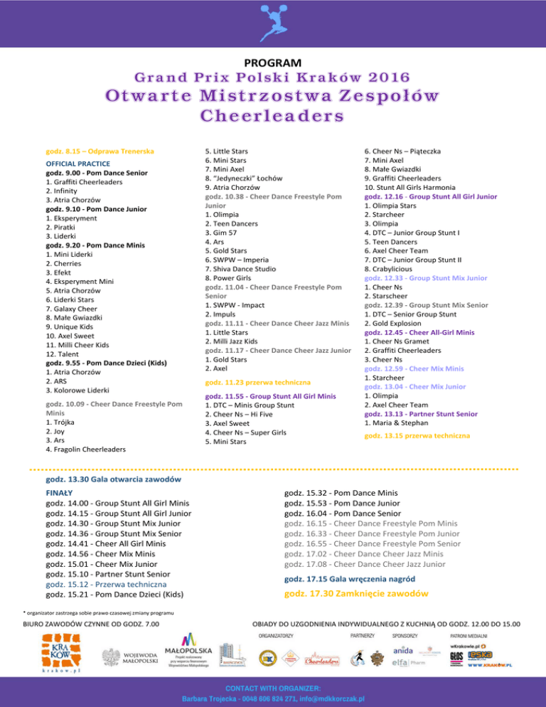 PROGRAM Grand Prix Polski Kraków 2016 Otwarte Mistrzostwa Zespołów Cheerleaders godz. 8.15 – Odprawa Trenerska OFFICIAL PRACTICE godz. 9.00 - Pom Dance Senior 1. Graffiti Cheerleaders 2. Infinity 3. Atria Chorzów godz. 9.10 - Pom Dance Junior 1. Eksperyment 2. Piratki 3. Liderki godz. 9.20 - Pom Dance Minis 1. Mini Liderki 2. Cherries 3. Efekt 4. Eksperyment Mini 5. Atria Chorzów 6. Liderki Stars 7. Galaxy Cheer 8. Małe Gwiazdki 9. Unique Kids 10. Axel Sweet 11. Milli Cheer Kids 12. Talent godz. 9.55 - Pom Dance Dzieci (Kids) 1. Atria Chorzów 2. ARS 3. Kolorowe Liderki godz. 10.09 - Cheer Dance Freestyle Pom Minis 1. Trójka 2. Joy 3. Ars 4. Fragolin Cheerleaders 5. Little Stars 6. Mini Stars 7. Mini Axel 8. “Jedyneczki” Łochów 9. Atria Chorzów godz. 10.38 - Cheer Dance Freestyle Pom Junior 1. Olimpia 2. Teen Dancers 3. Gim 57 4. Ars 5. Gold Stars 6. SWPW – Imperia 7. Shiva Dance Studio 8. Power Girls godz. 11.04 - Cheer Dance Freestyle Pom Senior 1. SWPW - Impact 2. Impuls godz. 11.11 - Cheer Dance Cheer Jazz Minis 1. Little Stars 2. Milli Jazz Kids godz. 11.17 - Cheer Dance Cheer Jazz Junior 1. Gold Stars 2. Axel godz. 11.23 przerwa techniczna godz. 11.55 - Group Stunt All Girl Minis 1. DTC – Minis Group Stunt 2. Cheer Ns – Hi Five 3. Axel Sweet 4. Cheer Ns – Super Girls 5. Mini Stars 6. Cheer Ns – Piąteczka 7. Mini Axel 8. Małe Gwiazdki 9. Graffiti Cheerleaders 10. Stunt All Girls Harmonia godz. 12.16 - Group Stunt All Girl Junior 1. Olimpia Stars 2. Starcheer 3. Olimpia 4. DTC – Junior Group Stunt I 5. Teen Dancers 6. Axel Cheer Team 7. DTC – Junior Group Stunt II 8. Crabylicious godz. 12.33 - Group Stunt Mix Junior 1. Cheer Ns 2. Starscheer godz. 12.39 - Group Stunt Mix Senior 1. DTC – Senior Group Stunt 2. Gold Explosion godz. 12.45 - Cheer All-Girl Minis 1. Cheer Ns Gramet 2. Graffiti Cheerleaders 3. Cheer Ns godz. 12.59 - Cheer Mix Minis 1. Starcheer godz. 13.04 - Cheer Mix Junior 1. Olimpia 2. Axel Cheer Team godz. 13.13 - Partner Stunt Senior 1. Maria & Stephan godz. 13.15 przerwa techniczna godz. 13.30 Gala otwarcia zawodów FINAŁY godz. 14.00 - Group Stunt All Girl Minis godz. 14.15 - Group Stunt All Girl Junior godz. 14.30 - Group Stunt Mix Junior godz. 14.36 - Group Stunt Mix Senior godz. 14.41 - Cheer All Girl Minis godz. 14.56 - Cheer Mix Minis godz. 15.01 - Cheer Mix Junior godz. 15.10 - Partner Stunt Senior godz. 15.12 - Przerwa techniczna godz. 15.21 - Pom Dance Dzieci (Kids) godz. 15.32 - Pom Dance Minis godz. 15.53 - Pom Dance Junior godz. 16.04 - Pom Dance Senior godz. 16.15 - Cheer Dance Freestyle Pom Minis godz. 16.33 - Cheer Dance Freestyle Pom Junior godz. 16.55 - Cheer Dance Freestyle Pom Senior godz. 17.02 - Cheer Dance Cheer Jazz Minis godz. 17.08 - Cheer Dance Cheer Jazz Junior godz. 17.15 Gala wręczenia nagród godz. 17.30 Zamknięcie zawodów * organizator zastrzega sobie prawo czasowej zmiany programu BIURO ZAWODÓW CZYNNE OD GODZ. 7.00 OBIADY DO UZGODNIENIA INDYWIDUALNEGO Z KUCHNIĄ OD GODZ. 12.00 DO 15.00