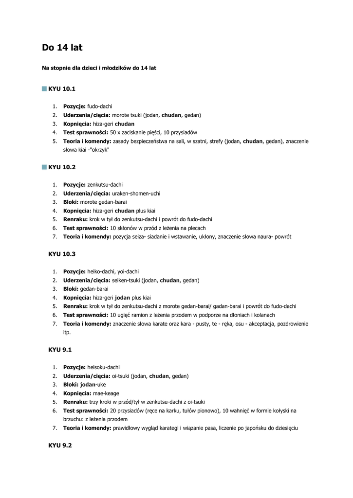 Do 14 lat Na stopnie dla dzieci i młodzików do 14 lat KYU 10.1 1. Pozycje: fudo-dachi 2. Uderzenia/cięcia: morote tsuki (jodan, chudan, gedan) 3. Kopnięcia: hiza-geri chudan 4. Test sprawności: 50 x zaciskanie pięści, 10 przysiadów 5. Teoria i komendy: zasady bezpieczeństwa na sali, w szatni, strefy (jodan, chudan, gedan), znaczenie słowa kiai -"okrzyk" KYU 10.2 1. Pozycje: zenkutsu-dachi 2. Uderzenia/cięcia: uraken-shomen-uchi 3. Bloki: morote gedan-barai 4. Kopnięcia: hiza-geri chudan plus kiai 5. Renraku: krok w tył do zenkutsu-dachi i powrót do fudo-dachi 6. Test sprawności: 10 skłonów w przód z leżenia na plecach 7. Teoria i komendy: pozycja seiza- siadanie i wstawanie, ukłony, znaczenie słowa naura- powrót KYU 10.3 1. Pozycje: heiko-dachi, yoi-dachi 2. Uderzenia/cięcia: seiken-tsuki (jodan, chudan, gedan) 3. Bloki: gedan-barai 4. Kopnięcia: hiza-geri jodan plus kiai 5. Renraku: krok w tył do zenkutsu-dachi z morote gedan-barai/ gadan-barai i powrót do fudo-dachi 6. Test sprawności: 10 ugięć ramion z leżenia przodem w podporze na dłoniach i kolanach 7. Teoria i komendy: znaczenie słowa karate oraz kara - pusty, te - ręka, osu - akceptacja, pozdrowienie itp. KYU 9.1 1. Pozycje: heisoku-dachi 2. Uderzenia/cięcia: oi-tsuki (jodan, chudan, gedan) 3. Bloki: jodan-uke 4. Kopnięcia: mae-keage 5. Renraku: trzy kroki w przód/tył w zenkutsu-dachi z oi-tsuki 6. Test sprawności: 20 przysiadów (ręce na karku, tułów pionowo), 10 wahnięć w formie kołyski na brzuchu: z leżenia przodem 7. Teoria i komendy: prawidłowy wygląd karategi i wiązanie pasa, liczenie po japońsku do dziesięciu KYU 9.2 1. Pozycje: musubi-dachi 2. Uderzenia/cięcia: gyaku-tsuki (jodan, chudan, gedan) 3. Bloki: soto-uke 4. Kopnięcia: kin-geri 5. Renraku: trzy kroki w przód/tył w zenkutsu-dachi z gyaku-tsuki 6. Test sprawności: 10 skłonów w przód, 10 wahnięć w formie kołyski na plecach z przysiadu (ręce zaplecione wokół kolan) 7. Teoria i komendy: znaczenie słów: sensei - nauczyciel, sempai - starszy rangą, shihan - nauczyciel mistrz KYU 9.3 1. Pozycje: nekoashi-dachi 2. Uderzenia/cięcia: seiken-ago-uchi 3. Bloki: uchi-uke 4. Kopnięcia: mae-geri chudan 5. Renraku: trzy kroki w przód w zenkutsu-dachi z oi-tsuki/ gyaku-tsuki/ uke, obrót z gedan-barai 6. Test sprawności: 10 ugięć ramion z leżenia przodem w podporze na pięściach i kolanach, 10 wahnięć w formie kołyski na plecach (z przysiadu, ręce pod kątem 45 stopni amortyzując pad w tył) 7. Teoria i komendy: znaczenie słowa: kyoku-shin-kai KYU 8.1 1. Pozycje: kokutsu-dachi 2. Uderzenia/cięcia: shuto-sakotsu-uchi-komi 3. Kopnięcia: soto-keage 4. Renraku: trzy kroki w przód w zenkutsu-dachi z keri, obrót z morote gedan-barai 5. Test sprawności: 10 przewrotów w przód, 60 sekund tzw. mostek 6. Teoria i komendy: przysięga dojo KYU 8.2 1. Pozycje: moroashi-dachi, uchihachiji-dachi 2. Uderzenia/cięcia: shuto-sakotsu-uchi 3. Kopnięcia: uchi-keage 4. Renraku: krok w tył do zenkutsu-dachiz gedan-barai plus gyaku-tsuki i powrót do fudo-dachi 5. Test sprawności: 10 przewrotów w tył, 10 razy po 20 sekund rozciąganie w maksymalnym rozkroku ze skrętem w lewo i w prawo, tzw. szpagat 6. Teoria i komendy: nogare I - oddychanie KYU 8.3 1. Pozycje: sanchin-dachi 2. Uderzenia/cięcia: shuto-ganmen-uchi 3. Kopnięcia: mae-geri jodan 4. Renraku: trzy kroki w przód w zenkutsu-dachi z uke plus gyaku-tsuki, obrót z gedan-barai 5. Kata: Kihon kata I 6. Test sprawności: 10 razy tzw. gwiazda gimnastyczna, 10 razy dotknąć głową podłogi poprzez skłon w przód siedząc w maksymalnie szerokim rozkroku, nogi proste w kolanach 7. Teoria i komendy: nogare II- oddychanie ura (odwrotnie) KYU 7.1 1. Pozycje: kiba-dachi 2. Uderzenia/cięcia: uraken-sayu-uchi, uraken-hizo-uchi 3. Kopnięcia: kansetsu-geri 4. Renraku: trzy kroki w przód w sanchi-dachi z tsuki/uchi/geri/uke, obrót przez przekrok 5. Kata: Taikyoku I 6. Test sprawności: 10 razy zamach nogą przechodząc do stania na rękach pod drabinkami 7. Teoria i komendy: ibuki - oddychanie z 2 wydechami KYU 7.2 1. Pozycje: tsuruashi-dachi 2. Uderzenia/cięcia: uraken-yoko-uchi (jodan, chudan, gedan) 3. Kopnięcia: kakato-geri 4. Renraku: trzy kroki w przód w zenkutsu-dachi z mae-geri plus gyaku-tsuki, obrót z morote gedan-barai 5. Kata: Taikyoku II 6. Test sprawności: 60 sekund stanie na rękach pod drabinkami 7. Teoria i komendy: etykieta dojo KYU 7.3 1. Pozycje: kake-dachi 2. Uderzenia/cięcia: shuto-mawashi-uchi 3. Bloki: shuto-mawashi-uke 4. Kopnięcia: yoko-keage, ushiro-keage 5. Renraku: trzy kroki w przód w kokutsu-dachi z shuto mawashi-uke, obrót poprzez przekrok 6. Kata: Sakugi I 7. Test sprawności: 10 razy sprężynka, tzn. wymyk w przód z leżenia na plecach 8. Teoria i komendy: historia Kyokushin Karate KYU 6.1 1. Pozycje: pozycja walki 2. Uderzenia/cięcia: seiken tate-tsuki (jodan, chudan, gedan) 3. Kopnięcia: mawashi-geri gedan 4. Renraku: trzy kroki w przód w pozycji walki z gyaku tate-tsuki, obrót poprzez zakrok 5. Kumite: 5 minut system punktowy 6. Kata: Sakugi II 7. Test sprawności: 10 razy scyzoryk w zwisie tyłem na drabinkach, 60 sekund szpagat w bok na piętach 8. Teoria i komendy: twórca nowoczesnego Kyokushin Sosai Mas. Oyama KYU 6.2 1. Pozycje: krok dostawny w pozycji walki 2. Uderzenia/cięcia: tetsui-hizi-uchi, tetsui-yoko-uchi (chudan, jodan, gedan) 3. Kopnięcia: mawashi-geri chudan 4. Renraku: trzy kroki w przód w zenkutsu-dachi z mae-keage/yoku-keage/ soto-keage plus gyaku-tsuki 5. Kumite: 10 minut system punktowy 6. Kata: Taikyoku III 7. Test sprawności: 10 przeskoków przez klęczącego na kolanach partnera z pozycji w przysiadzie 8. Teoria i komendy: siedziba Światowej Organizacji i lider Kancho Shokei Matsui. Siedziby Europejskiej i Polskiej Organizacji, liderzy KYU 6.3 1. Pozycje: przekrok i zakrok w pozycji walki 2. Uderzenia/cięcia: tetsui-kome-kami-uchi, uraken-shita-tsuki 3. Bloki: osae-uke 4. Kopnięci