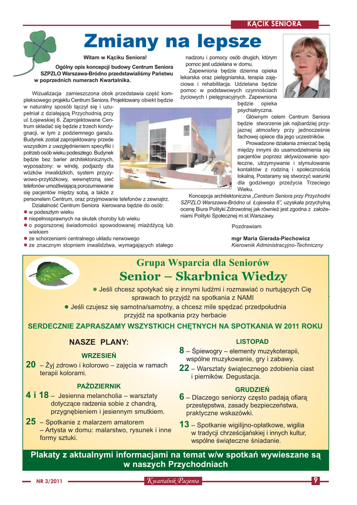 KĄCIK SENIORA Zmiany na lepsze Witam w Kąciku Seniora! Ogólny opis koncepcji budowy Centrum Seniora SZPZLO Warszawa-Bródno przedstawialiśmy Państwu w poprzednich numerach Kwartalnika. Wizualizacja zamieszczona obok przedstawia część kompleksowego projektu Centrum Seniora. Projektowany obiekt będzie w naturalny sposób łączył się i uzupełniał z działającą Przychodnią przy ul. Łojewskiej 6. Zaprojektowane Centrum składać się będzie z trzech kondygnacji, w tym z podziemnego garażu. Budynek został zaprojektowany przede wszystkim z uwzględnieniem specyfiki i potrzeb osób wieku podeszłego. Budynek będzie bez barier architektonicznych, wyposażony: w windę, podjazdy dla wózków inwalidzkich, system przyzywowo-przyłóżkowy, wewnętrzną sieć telefonów umożliwiającą porozumiewanie się pacjentów między sobą, a także z personelem Centrum, oraz przyjmowanie telefonów z zewnątrz. Działalność Centrum Seniora kierowana będzie do osób: w podeszłym wieku niepełnosprawnych na skutek choroby lub wieku o pogorszonej świadomości spowodowanej miażdżycą lub wiekiem ze schorzeniami centralnego układu nerwowego ze znacznym stopniem inwalidztwa, wymagających stałego nadzoru i pomocy osób drugich, którym pomoc jest udzielana w domu. Zapewniona będzie dzienna opieka lekarska oraz pielęgniarska, terapia zajęciowa i rehabilitacja. Udzielana będzie pomoc w podstawowych czynnościach życiowych i pielęgnacyjnych. Zapewniona będzie opieka psychiatryczna. Głównym celem Centrum Seniora będzie stworzenie jak najbardziej przyjaznej atmosfery przy jednocześnie fachowej opiece dla jego uczestników. Prowadzone działania zmierzać będą między innymi do usamodzielnienia się pacjentów poprzez aktywizowanie społeczne, utrzymywanie i stymulowanie kontaktów z rodziną i społecznością lokalną. Postaramy się stworzyć warunki dla godziwego przeżycia Trzeciego Wieku. Koncepcja architektoniczna „Centrum Seniora przy Przychodni SZPZLO Warszawa-Bródno ul. Łojewska 6”, uzyskała przychylną ocenę Biura Polityki Zdrowotnej jak również jest zgodna z założeniami Polityki Społecznej m.st.Warszawy. Pozdrawiam mgr Maria Gierada-Piechowicz Kierownik Administracyjno-Techniczny Grupa Wsparcia dla Seniorów Senior – Skarbnica Wiedzy Jeśli chcesz spotykać się z innymi ludźmi i rozmawiać o nurtujących Cię sprawach to przyjdź na spotkania z NAMI Jeśli czujesz się samotna/samotny, a chcesz mile spędzać przedpołudnia przyjdź na spotkania przy herbacie SERDECZNIE ZAPRASZAMY WSZYSTKICH CHĘTNYCH NA SPOTKANIA W 2011 ROKU NASZE PLANY: 20 4i 25 WRZESIEŃ – Żyj zdrowo i kolorowo – zajęcia w ramach terapii kolorami. PAŹDZIERNIK 18 – Jesienna melancholia – warsztaty dotyczące radzenia sobie z chandrą, przygnębieniem i jesiennym smutkiem. – Spotkanie z malarzem amatorem – Artysta w domu: malarstwo, rysunek i inne formy sztuki. LISTOPAD 8 – Śpiewogry – elementy muzykoterapii, wspólne muzykowanie, gry i zabawy. 22 – Warsztaty świątecznego zdobienia ciast i pierników. Degustacja. GRUDZIEŃ 6 – Dlaczego seniorzy często padają ofiarą przestępstwa, zasady bezpieczeństwa, praktyczne wskazówki. 13 – Spotkanie wigilijno-opłatkowe, wigilia w tradycji chrześcijańskiej i innych kultur, wspólne świąteczne śniadanie. Plakaty z aktualnymi informacjami na temat w/w spotkań wywieszane są w naszych Przychodniach NR 3/2011 Kwartalnik Pacjenta 9