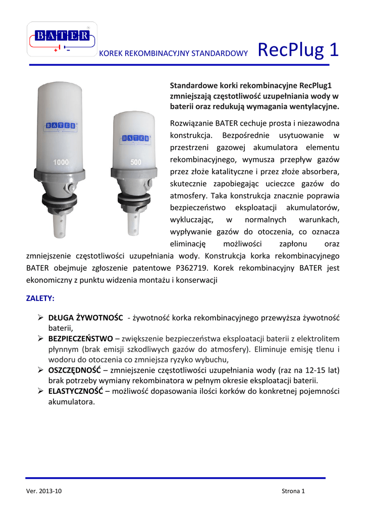 KOREK REKOMBINACYJNY STANDARDOWY RecPlug 1 Standardowe korki rekombinacyjne RecPlug1 zmniejszają częstotliwość uzupełniania wody w baterii oraz redukują wymagania wentylacyjne. Rozwiązanie BATER cechuje prosta i niezawodna konstrukcja. Bezpośrednie usytuowanie w przestrzeni gazowej akumulatora elementu rekombinacyjnego, wymusza przepływ gazów przez złoże katalityczne i przez złoże absorbera, skutecznie zapobiegając ucieczce gazów do atmosfery. Taka konstrukcja znacznie poprawia bezpieczeństwo eksploatacji akumulatorów, wykluczając, w normalnych warunkach, wypływanie gazów do otoczenia, co oznacza eliminację możliwości zapłonu oraz zmniejszenie częstotliwości uzupełniania wody. Konstrukcja korka rekombinacyjnego BATER obejmuje zgłoszenie patentowe P362719. Korek rekombinacyjny BATER jest ekonomiczny z punktu widzenia montażu i konserwacji ZALETY: DŁUGA ŻYWOTNOŚC - żywotność korka rekombinacyjnego przewyższa żywotność baterii, BEZPIECZEŃSTWO – zwiększenie bezpieczeństwa eksploatacji baterii z elektrolitem płynnym (brak emisji szkodliwych gazów do atmosfery). Eliminuje emisję tlenu i wodoru do otoczenia co zmniejsza ryzyko wybuchu, OSZCZĘDNOŚĆ – zmniejszenie częstotliwości uzupełniania wody (raz na 12-15 lat) brak potrzeby wymiany rekombinatora w pełnym okresie eksploatacji baterii. ELASTYCZNOŚĆ – możliwość dopasowania ilości korków do konkretnej pojemności akumulatora. Ver. 2013-10 Strona 1 KOREK REKOMBINACYJNY STANDARDOWY RecPlug 1 ZASADA DZIAŁANIA Podczas ładowania chemicznych źródeł prądu przebiegają uboczne procesy rozpadu wody zawartej w elektrolicie na tlen i wodór. Gazy te uwalniane do atmosfery stwarzają groźbę wybuchu. Równocześnie następuje ubytek wody w elektrolicie, co wymusza konieczność okresowego jej uzupełniania. Metodą skutecznego zapobieżenia tym niekorzystnym zjawiskom jest stosowanie systemu zewnętrznej rekombinacji gazów. Celem konstruktorów urządzenia rekombinującego BATER było zapobieganie przepływowi gazów z akumulatora bezpośrednio do atmosfery WYMIARY I PARAMETRY TECHNICZNE Ver. 2013-10 Typ Pojemność baterii RecPlug 1-500 RecPlug 1-1000 Ah do 500 od 501 Max. Wymiary Napięcie Średnica Wysokość ładowania A B C H1 H2 [V/ogn] mm 2,4 ±1% 23 35 52 85 31 2,4 ±1% 23 35 52 105 31 Strona 2 KOREK REKOMBINACYJNY STANDARDOWY RecPlug 1 BATER sp.z o.o. ul. Dźwigowa 63, 01-376 Warszawa tel.: +48 22 664 87 87 fax: +48 22 664 87 87 e-mail: [email protected] www.bater.pl Zakład mechaniczny ul. Dźwigowa 63, 01-376 Warszawa tel.: +48 22 664 87 87 w.41 fax: +48 22 664 87 87 GPS 52°13.07N, 20°54.86E Zakład produkcyjny Bater Gliwice ul. Pszczyńska 309, 44-100 Gliwice tel.: +48 32 232 12 40 fax: +48 32 232 12 40 w. 29 e-mail: [email protected] GPS 50°16.14N, 18°43.19E Ver. 2013-10 Strona 3