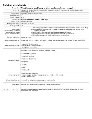 Sylabus przedmiotu Przedmiot: Współczesne problemy krajów portugalskojęzycznych Filologia romańska (język portugalski), II stopień [4 sem], stacjonarny, ogólnoakademicki, Kierunek: rozpoczęty w: 2014 Specjalność: lingwistyczno-traduktologiczna Rok/Semestr: I/2 Liczba godzin: 30,0 Nauczyciel: Oliveira Lopez De Matos, Lino, mgr Forma zajęć: konwersatorium Rodzaj zaliczenia: zaliczenie na ocenę Punkty ECTS: 2,0 0 Godziny kontaktowe z prowadzącym zajęcia realizowane w formie konsultacji 30,0 Godziny kontaktowe z prowadzącym zajęcia realizowane w formie zajęć dydaktycznych 10,0 Przygotowanie się studenta do zajęć dydaktycznych 10,0 Przygotowanie się studenta do zaliczeń i/lub egzaminów 10,0 Studiowanie przez studenta literatury przedmiotu Godzinowe ekwiwalenty punktów ECTS (łączna liczba godzin w semestrze): Poziom trudności: zaawansowany Wstępne wymagania: Znajomość historii i kultury Portugalii i krajów portugalskojęzycznych na poziomie licencjatu. • dyskusja dydaktyczna Metody dydaktyczne: • objaśnienie lub wyjaśnienie • z użyciem komputera - Cultura: Artes pl]asticas, música, cinema, teatro, - A mulher portuguesa - O sistema politico Zakres tematów: - O sistema de ensino - Desporto - Turismo - PALOP - Timor Leste • obecność na zajęciach Forma oceniania: • ocena ciągła (bieżące przygotowanie do zajęć i aktywność) • praca semestralna Warunki zaliczenia: Obecność na zajęciach, oddanie prac multimedia. Literatura: Bieżące, aktualne artykuły prasowe i strony internetowe. Dodatkowe informacje: Brana jest pod uwagę aktywne uczestnictwo w zajęciach.Na zajęciach dozwolone są dwie nieobecności w semetrze.