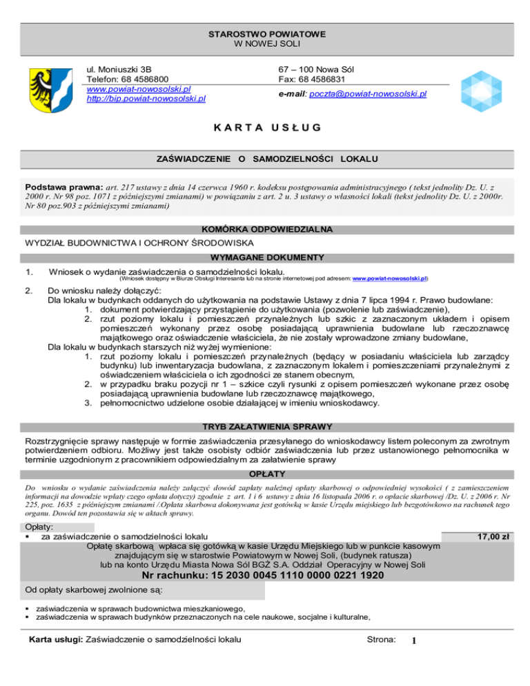 STAROSTWO POWIATOWE W NOWEJ SOLI ul. Moniuszki 3B Telefon: 68 4586800 www.powiat-nowosolski.pl http://bip.powiat-nowosolski.pl 67 – 100 Nowa Sól Fax: 68 4586831 e-mail: [email protected] KARTA USŁUG ZAŚWIADCZENIE O SAMODZIELNOŚCI LOKALU Podstawa prawna: art. 217 ustawy z dnia 14 czerwca 1960 r. kodeksu postępowania administracyjnego ( tekst jednolity Dz. U. z 2000 r. Nr 98 poz. 1071 z późniejszymi zmianami) w powiązaniu z art. 2 u. 3 ustawy o własności lokali (tekst jednolity Dz. U. z 2000r. Nr 80 poz.903 z późniejszymi zmianami) KOMÓRKA ODPOWIEDZIALNA WYDZIAŁ BUDOWNICTWA I OCHRONY ŚRODOWISKA WYMAGANE DOKUMENTY 1. Wniosek o wydanie zaświadczenia o samodzielności lokalu. 2. Do wniosku naleŜy dołączyć: Dla lokalu w budynkach oddanych do uŜytkowania na podstawie Ustawy z dnia 7 lipca 1994 r. Prawo budowlane: 1. dokument potwierdzający przystąpienie do uŜytkowania (pozwolenie lub zaświadczenie), 2. rzut poziomy lokalu i pomieszczeń przynaleŜnych lub szkic z zaznaczonym układem i opisem pomieszczeń wykonany przez osobę posiadającą uprawnienia budowlane lub rzeczoznawcę majątkowego oraz oświadczenie właściciela, Ŝe nie zostały wprowadzone zmiany budowlane, Dla lokalu w budynkach starszych niŜ wyŜej wymienione: 1. rzut poziomy lokalu i pomieszczeń przynaleŜnych (będący w posiadaniu właściciela lub zarządcy budynku) lub inwentaryzacja budowlana, z zaznaczonym lokalem i pomieszczeniami przynaleŜnymi z oświadczeniem właściciela o ich zgodności ze stanem obecnym, 2. w przypadku braku pozycji nr 1 – szkice czyli rysunki z opisem pomieszczeń wykonane przez osobę posiadającą uprawnienia budowlane lub rzeczoznawcę majątkowego, 3. pełnomocnictwo udzielone osobie działającej w imieniu wnioskodawcy. (Wniosek dostępny w Biurze Obsługi Interesanta lub na stronie internetowej pod adresem: www.powiat-nowosolski.pl) TRYB ZAŁATWIENIA SPRAWY Rozstrzygnięcie sprawy następuje w formie zaświadczenia przesyłanego do wnioskodawcy listem poleconym za zwrotnym potwierdzeniem odbioru. MoŜliwy jest takŜe osobisty odbiór zaświadczenia lub przez ustanowionego pełnomocnika w terminie uzgodnionym z pracownikiem odpowiedzialnym za załatwienie sprawy OPŁATY Do wniosku o wydanie zaświadczenia naleŜy załączyć dowód zapłaty naleŜnej opłaty skarbowej o odpowiedniej wysokości ( z zamieszczeniem informacji na dowodzie wpłaty czego opłata dotyczy) zgodnie z art. 1 i 6 ustawy z dnia 16 listopada 2006 r. o opłacie skarbowej /Dz. U. z 2006 r. Nr 225, poz. 1635 z późniejszym zmianami /.Opłata skarbowa dokonywana jest gotówką w kasie Urzędu miejskiego lub bezgotówkowo na rachunek tego organu. Dowód ten pozostawia się w aktach sprawy. Opłaty: za zaświadczenie o samodzielności lokalu Opłatę skarbową wpłaca się gotówką w kasie Urzędu Miejskiego lub w punkcie kasowym znajdującym się w starostwie Powiatowym w Nowej Soli, (budynek ratusza) lub na konto Urzędu Miasta Nowa Sól BGś S.A. Oddział Operacyjny w Nowej Soli Nr rachunku: 15 2030 0045 1110 0000 0221 1920 Od opłaty skarbowej zwolnione są: zaświadczenia w sprawach budownictwa mieszkaniowego, zaświadczenia w sprawach budynków przeznaczonych na cele naukowe, socjalne i kulturalne, Karta usługi: Zaświadczenie o samodzielności lokalu Strona: 1 17,00 zł jednostki budŜetowe, jednostki samorządu terytorialnego, organizacje poŜytku publicznego jeŜeli składają wniosek o wydanie zezwolenia wyłącznie w związku z nieodpłatną działalnością poŜytku publicznego w rozumieniu przepisów o działalności poŜytku publicznego i o wolontariacie. osoby, które składają wniosek o wydanie zezwolenia i przedstawią zaświadczenie o korzystaniu ze świadczeń pomocy społecznej z powodu ubóstwa, pod warunkiem wzajemności, państwa obce, ich przedstawicielstwa dyplomatyczne, urzędy konsularne i siły zbrojne, międzynarodowe organizacje i instytucje oraz ich oddziały i przedstawicielstwa, korzystające na podstawie ustaw, umów lub powszechnie uznanych zwyczajów międzynarodowych z przywilejów i immunitetów, a takŜe członkowie ich personelu i inne osoby zrównane z nimi, jeŜeli nie są one obywatelami polskimi i nie mają miejsca stałego pobytu na terytorium Rzeczypospolitej Polskiej. SPOSÓB DOSTARCZENIA DOKUMENTÓW Niezbędne dokumenty naleŜy złoŜyć osobiście lub przez ustanowionego pełnomocnika względnie przesłać na adres pocztowy Starostwa Powiatowego w Nowej Soli: Starostwo Powiatowe w Nowej Soli Ul. Moniuszki 3B, 67-100 Nowa Sól MIEJSCE ZŁOśENIA DOKUMENTÓW Biuro Obsługi Interesanta CZAS ZAŁATWIENIA SPRAWY W terminie do 7 dni od złoŜenia kompletnego wniosku. W sprawach wymagających przeprowadzenia dodatkowego postępowania nie później niŜ w ciągu 2 miesięcy od daty złoŜenia wniosku. TRYB ODWOŁAWCZY Od zaświadczenia nie przysługuje odwołanie. FORMULARZ DO POBRANIA Druk wniosku o wydanie zaświadczenia o samodzielności lokalu jest dostępny w : • biurze obsługi interesantów • wydziale budownictwa i ochrony środowiska • BIP http://bip.powiat-nowosolski.pl Karta usługi: Zaświadczenie o samodzielności lokalu Strona: 2